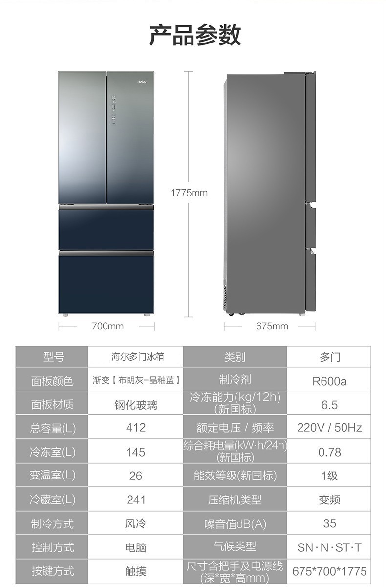海尔412升风冷变频多门冰箱BCD-412WDCEU1