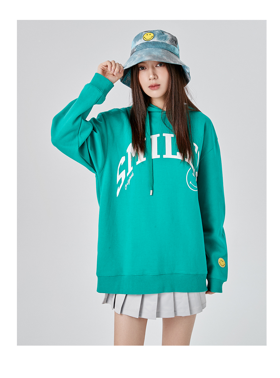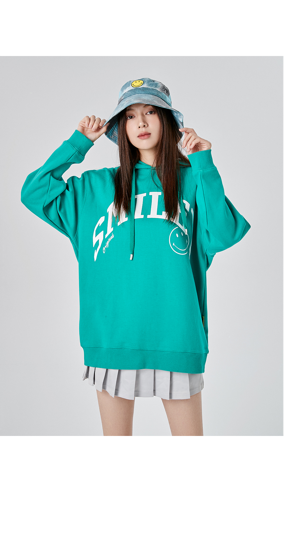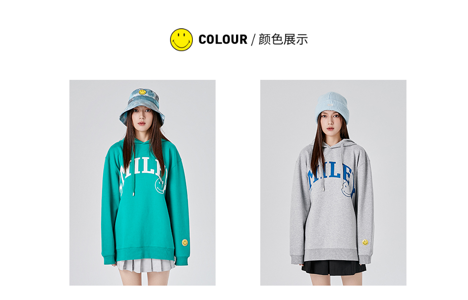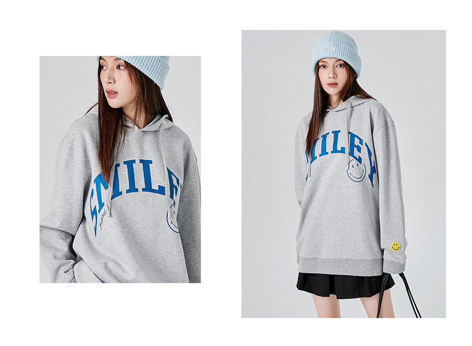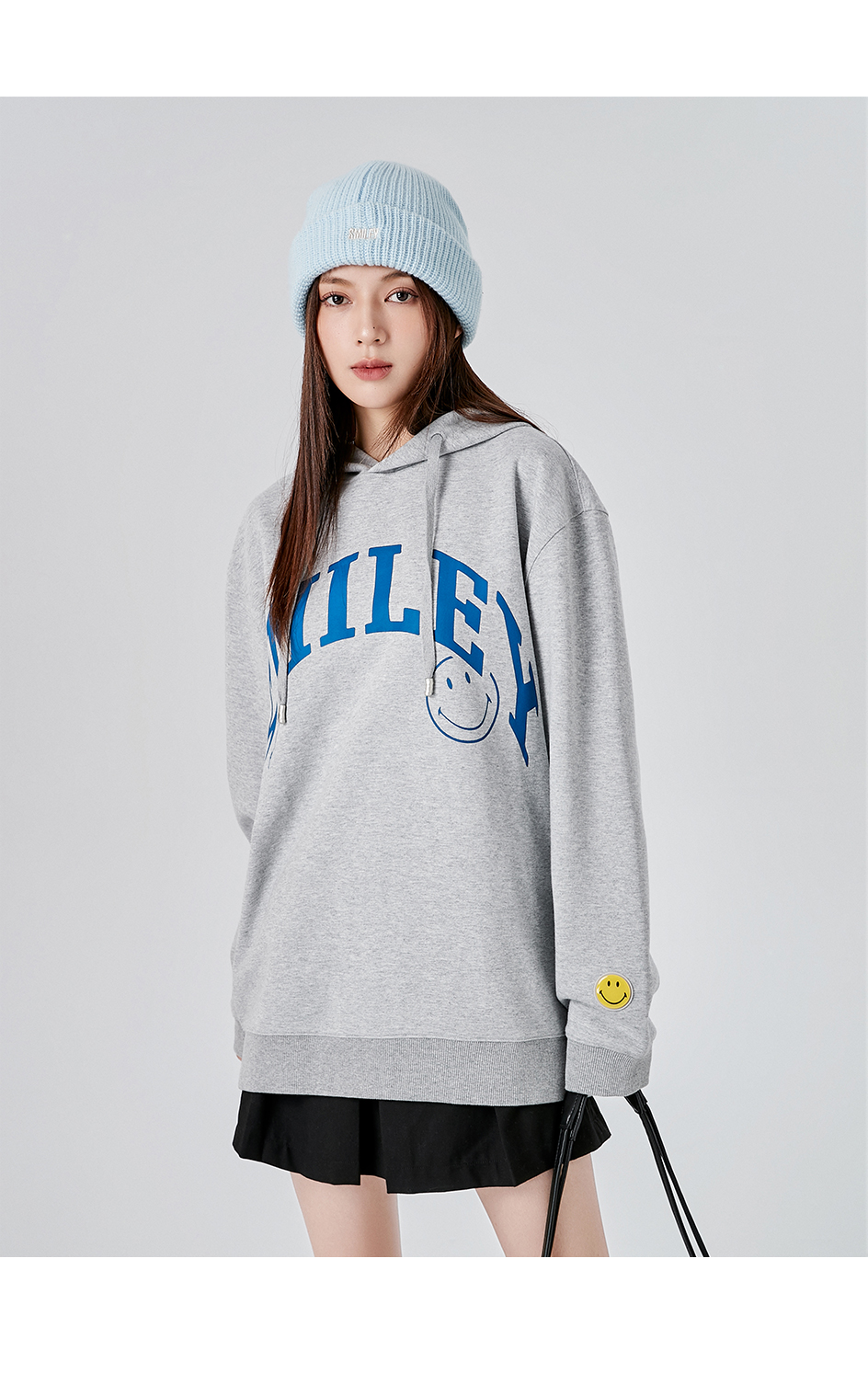 【品名】:字母印花笑脸刺绣连帽卫衣