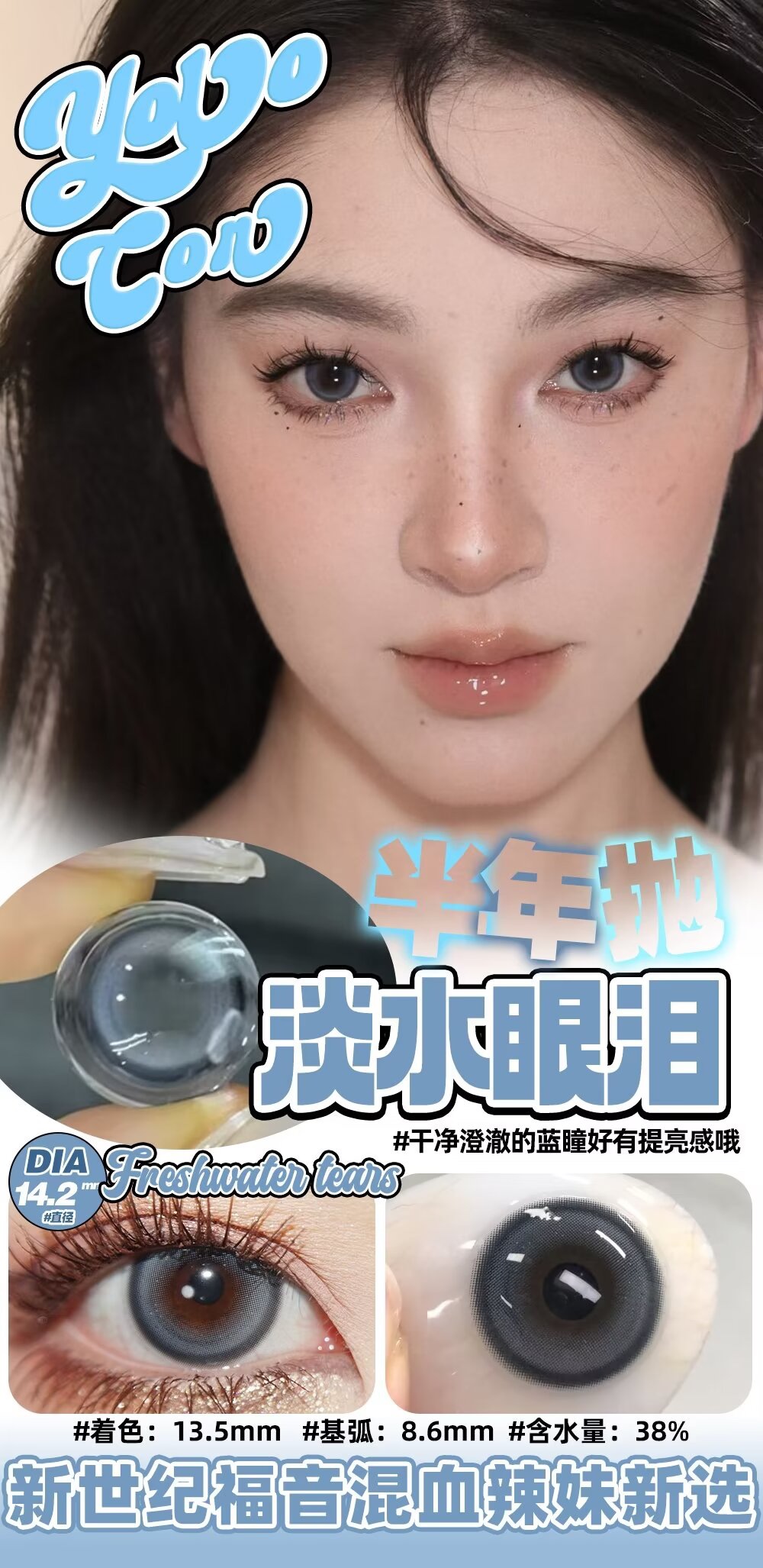 Yolocon 淡水眼泪 半年抛 两片 14.2mm 参考着色 13.5mm 基弧 8.6 含水 38% 新锐国货