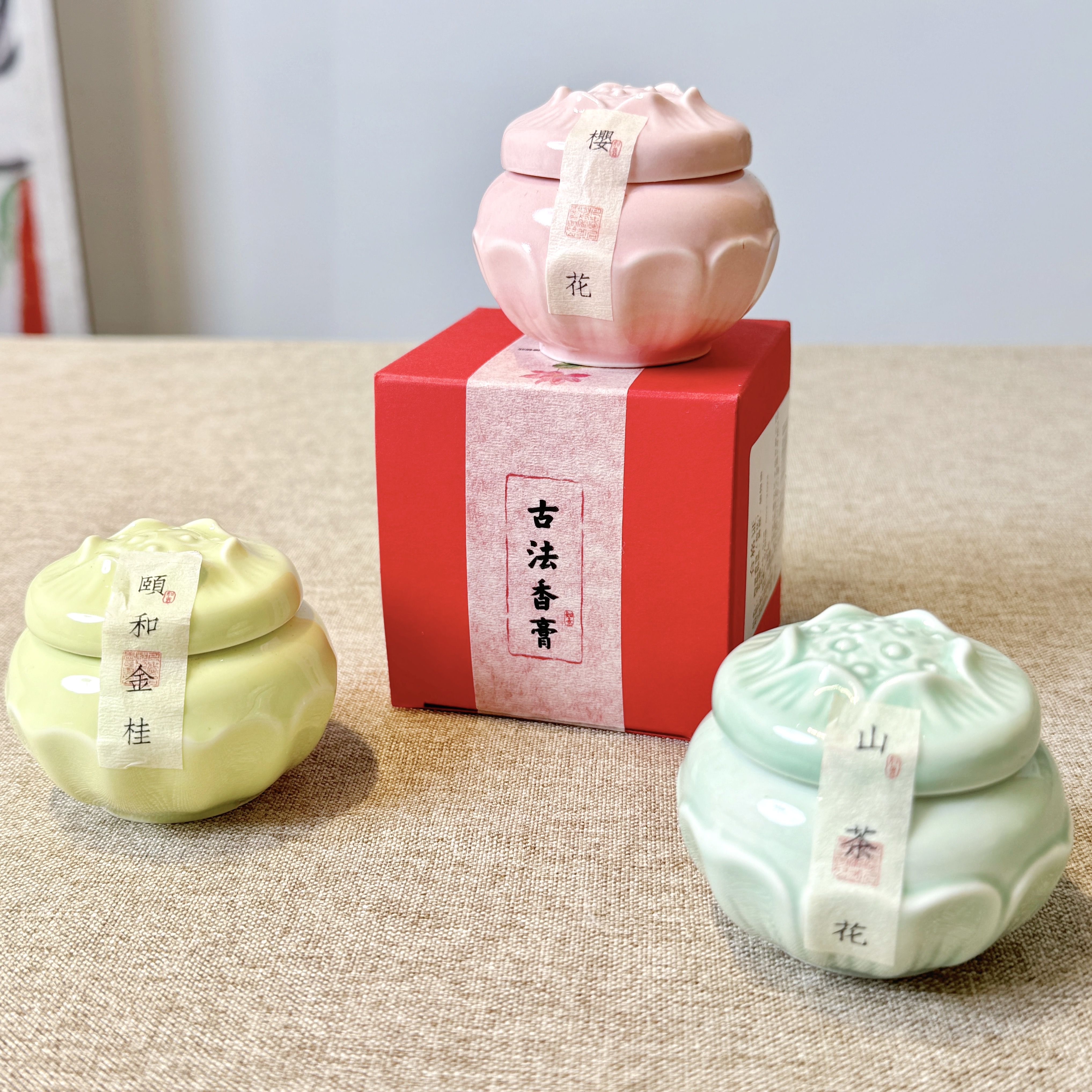 【品名】陶瓷香膏(玫瑰花香/白玉兰/鹅梨帐中香/樱花香/荷花香/桂花香/山茶香)