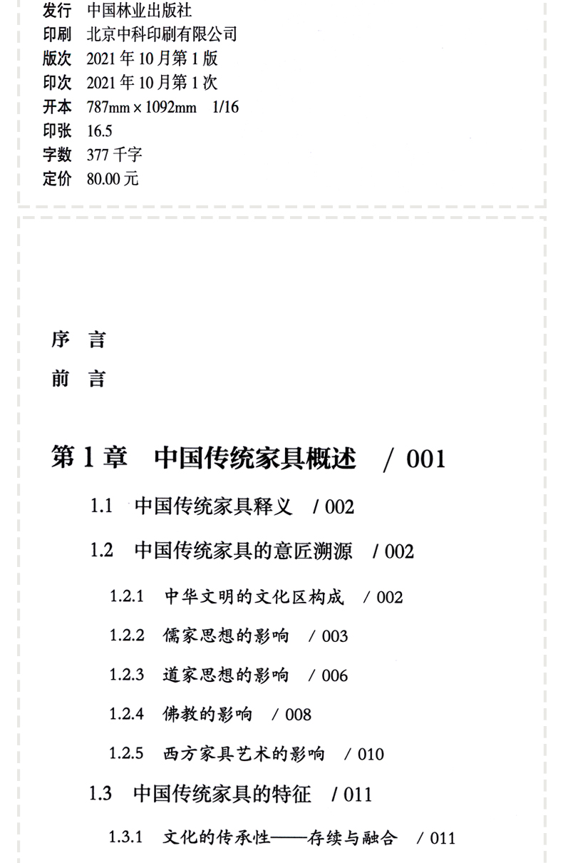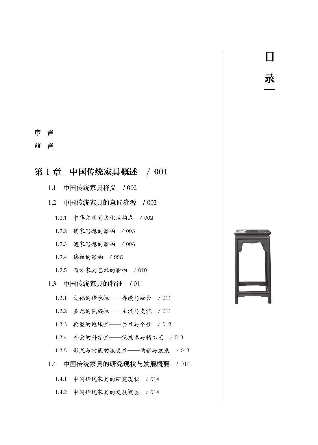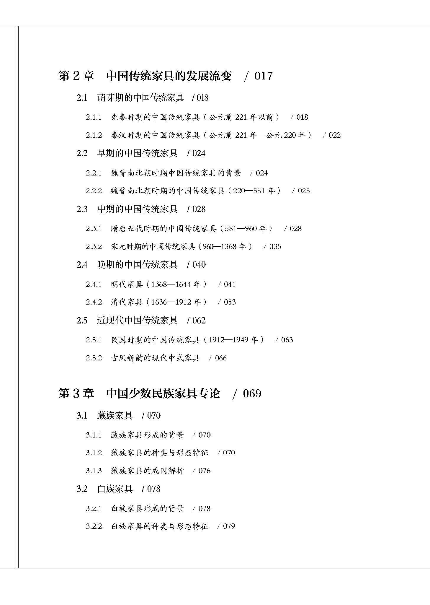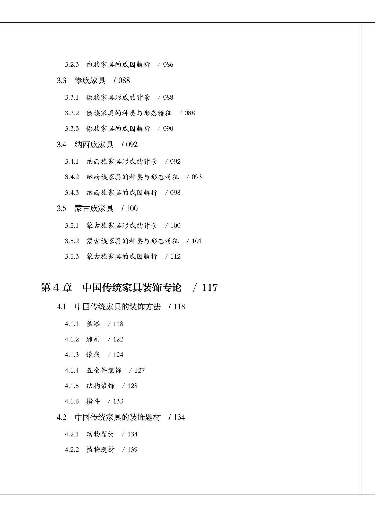本教材从发展流变、少数民族家具、装饰、结构、创新途径与实践6个方面来展开内容。在教材内容的组织上,第1章通过对概念诠释、意匠溯源、特征分析、研究概况的介绍,意欲界定课程对象的概念、研究进展、内涵和外延范畴。第2章通过对主流传统家具的介绍,突出中国属性,意欲建立课程对象的内涵发展主线。我国是个多民族的国家,少数民族家具文化多姿多彩。近20年来,大江南北的诸多学者对地域性民族家具开展了研究,学术积累颇多。故第3章以我国少数民族家具的研究内容为主,讲好中国的家具故事,意欲扩大课程对象的外延,引发学生的问题意识,也为教材的主要特色之一。在编写组的努力下,原本收集了9个民族的相关文献,由于民族属性的复杂性和教材的篇幅,故只遴选了5个民族的家具研究成果以飨读者。第4章是第2章和第3章的延续,主要介绍中国传统家具的装饰。装饰对传统家具的地域与民族属性、