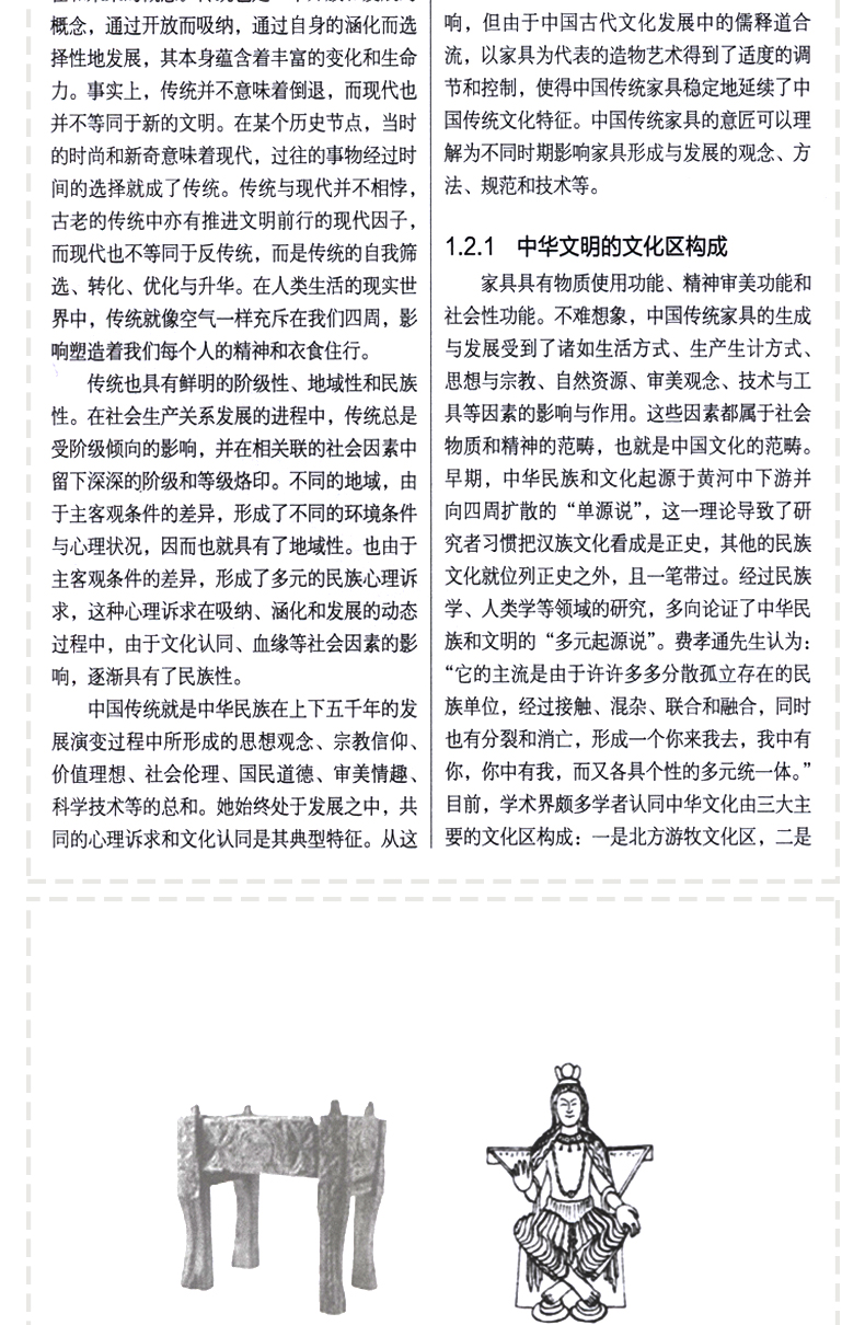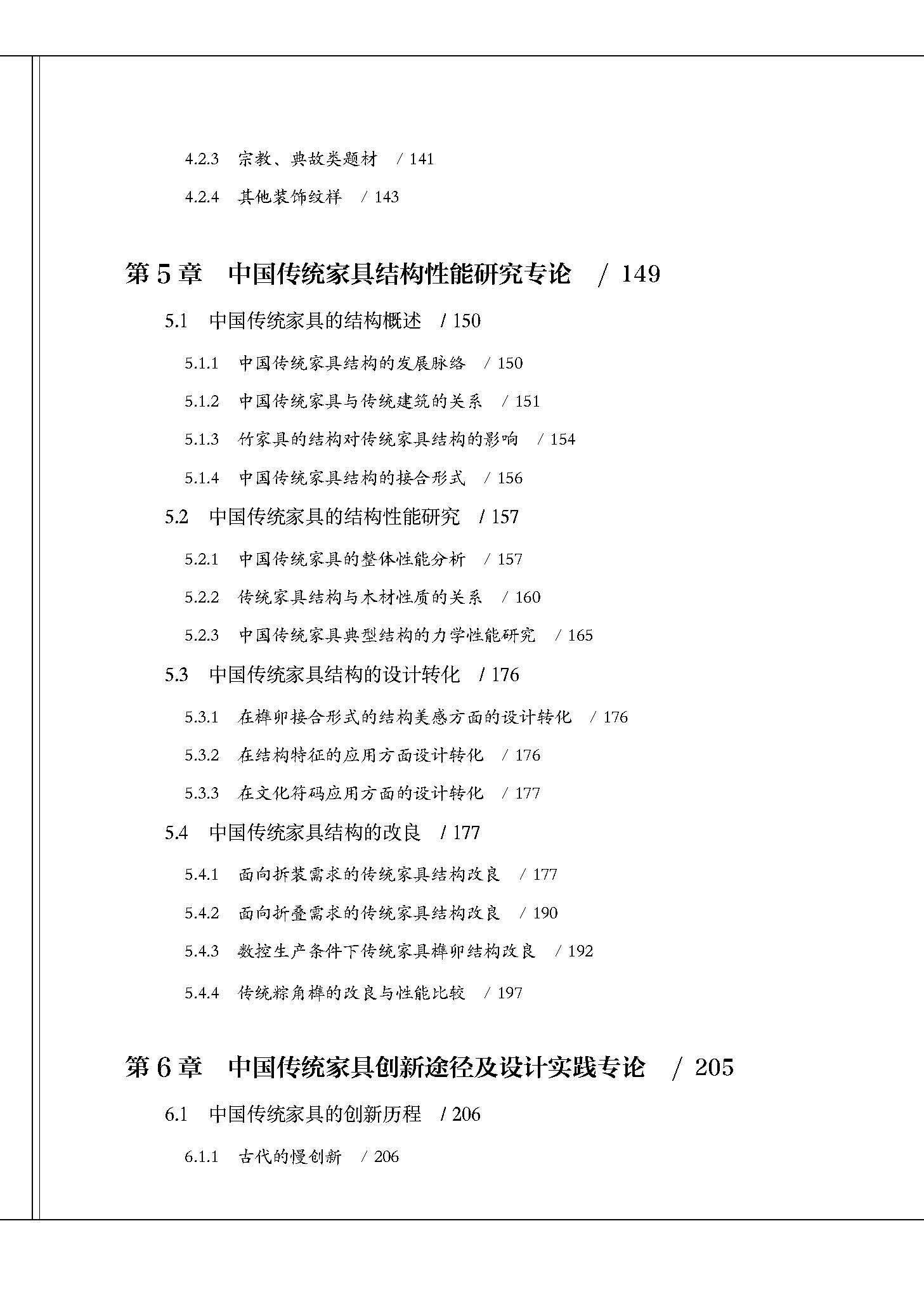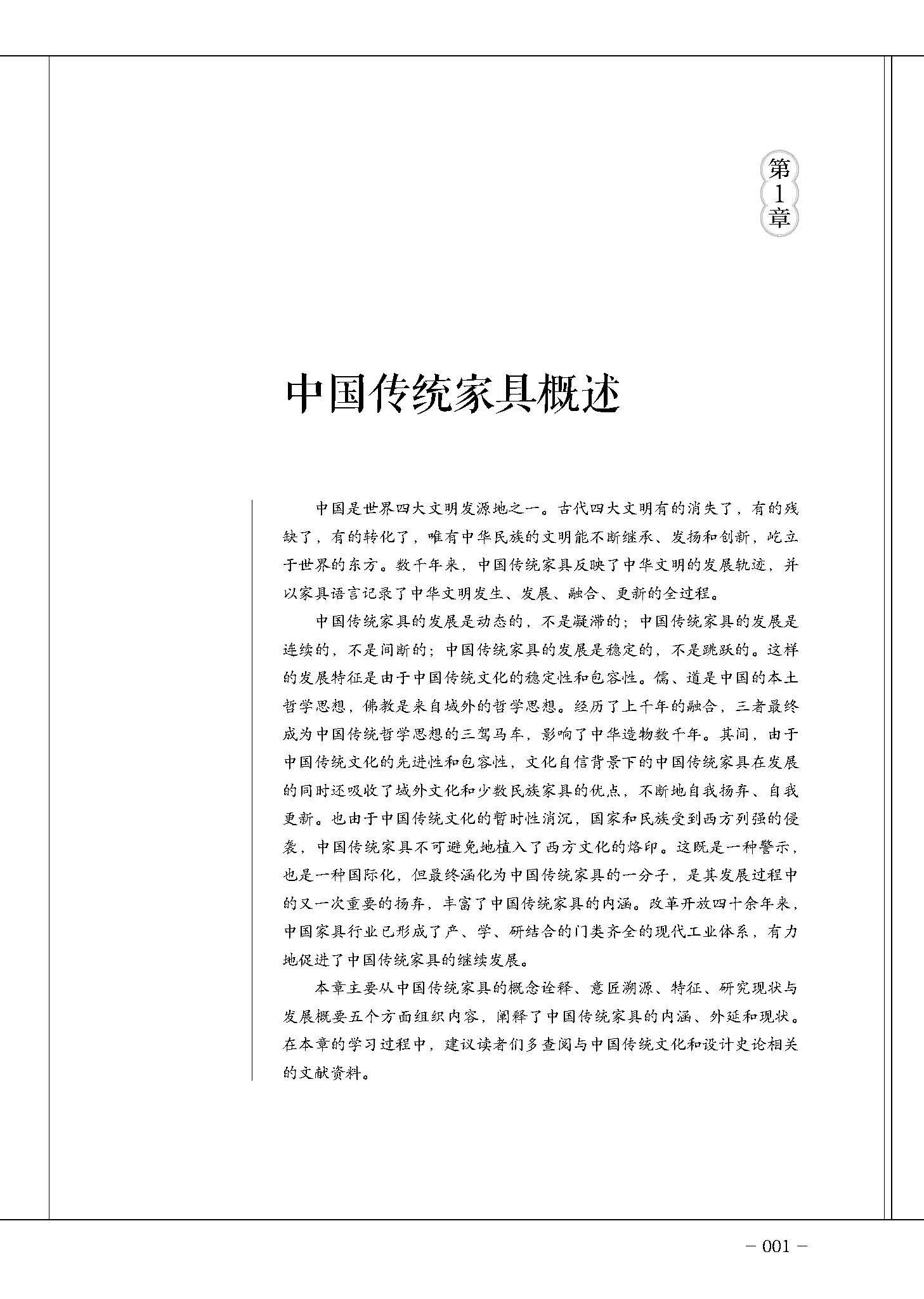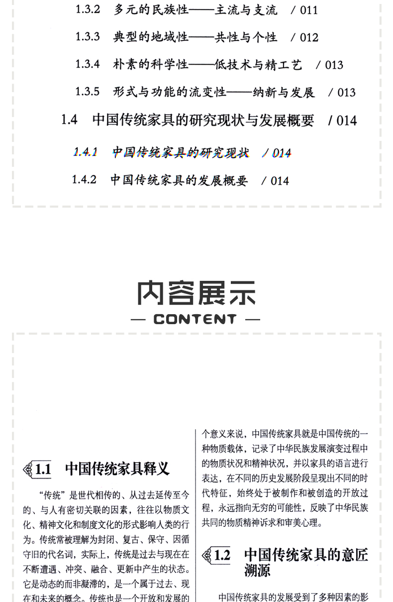 本教材从发展流变、少数民族家具、装饰、结构、创新途径与实践6个方面来展开内容。在教材内容的组织上,第1章通过对概念诠释、意匠溯源、特征分析、研究概况的介绍,意欲界定课程对象的概念、研究进展、内涵和外延范畴。第2章通过对主流传统家具的介绍,突出中国属性,意欲建立课程对象的内涵发展主线。我国是个多民族的国家,少数民族家具文化多姿多彩。近20年来,大江南北的诸多学者对地域性民族家具开展了研究,学术积累颇多。故第3章以我国少数民族家具的研究内容为主,讲好中国的家具故事,意欲扩大课程对象的外延,引发学生的问题意识,也为教材的主要特色之一。在编写组的努力下,原本收集了9个民族的相关文献,由于民族属性的复杂性和教材的篇幅,故只遴选了5个民族的家具研究成果以飨读者。第4章是第2章和第3章的延续,主要介绍中国传统家具的装饰。装饰对传统家具的地域与民族属性、