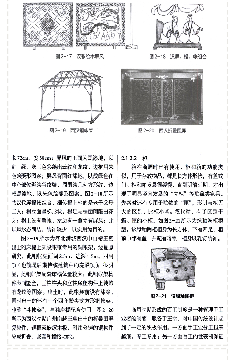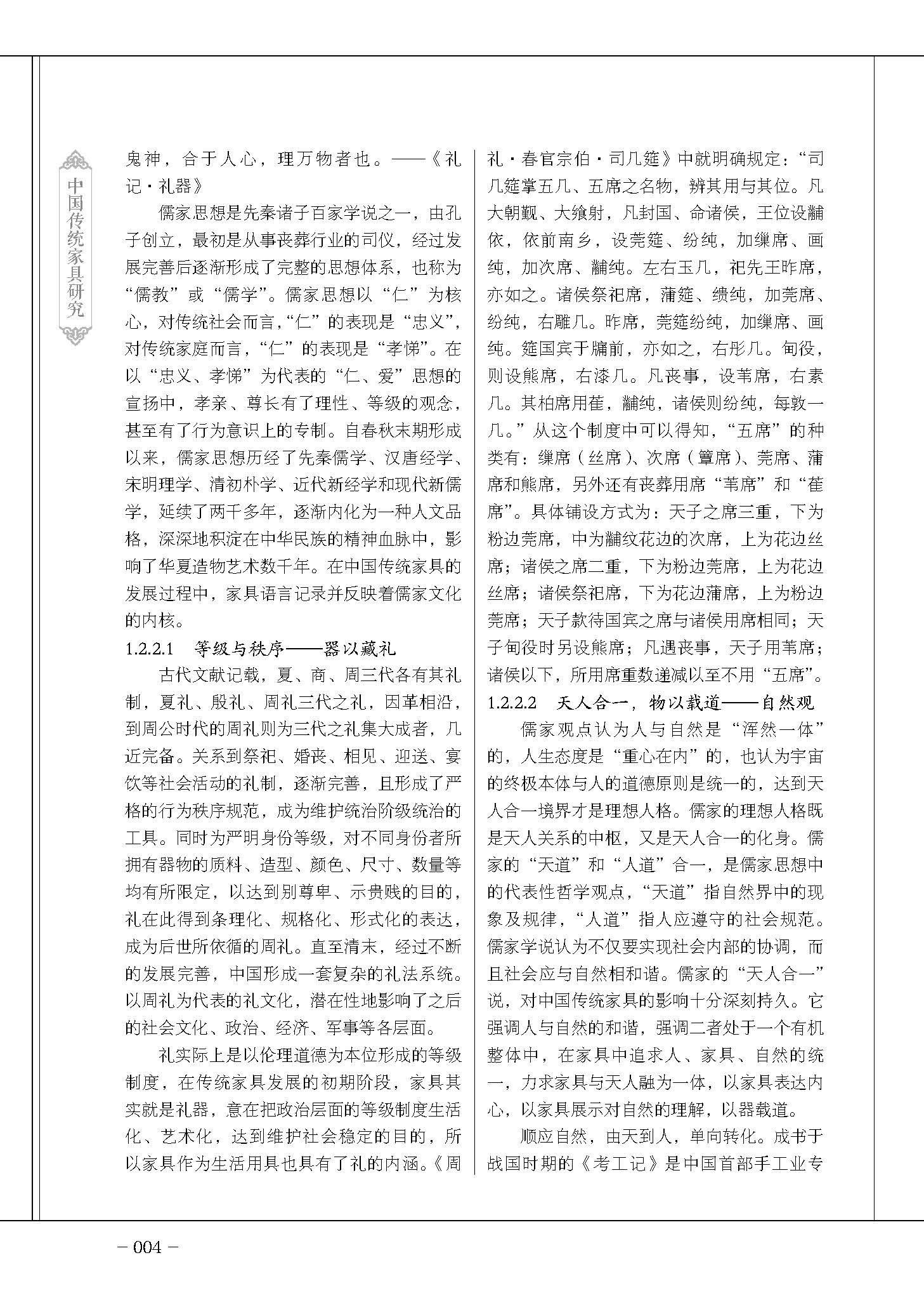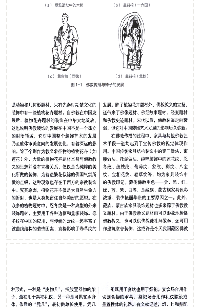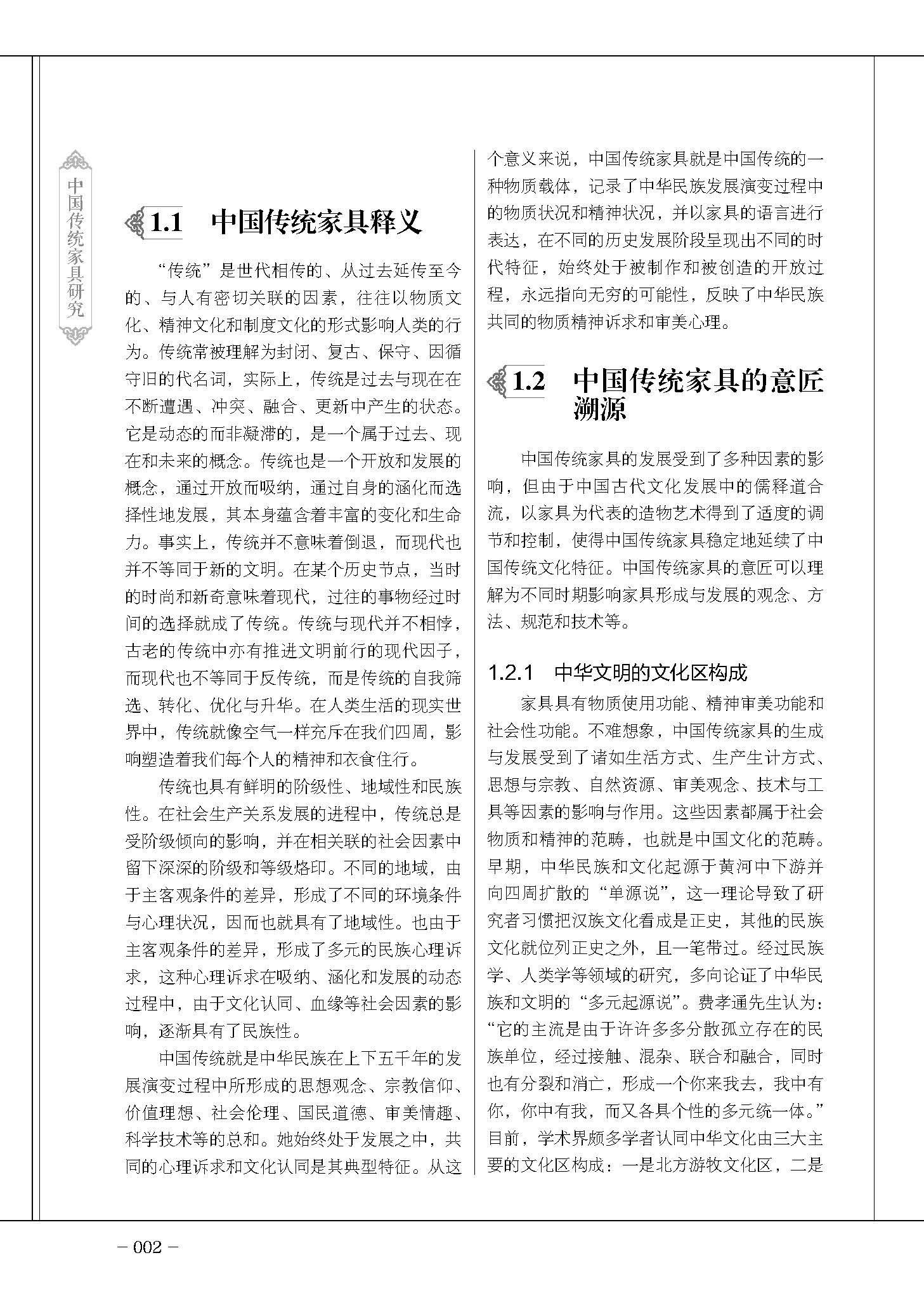 本教材从发展流变、少数民族家具、装饰、结构、创新途径与实践6个方面来展开内容。在教材内容的组织上,第1章通过对概念诠释、意匠溯源、特征分析、研究概况的介绍,意欲界定课程对象的概念、研究进展、内涵和外延范畴。第2章通过对主流传统家具的介绍,突出中国属性,意欲建立课程对象的内涵发展主线。我国是个多民族的国家,少数民族家具文化多姿多彩。近20年来,大江南北的诸多学者对地域性民族家具开展了研究,学术积累颇多。故第3章以我国少数民族家具的研究内容为主,讲好中国的家具故事,意欲扩大课程对象的外延,引发学生的问题意识,也为教材的主要特色之一。在编写组的努力下,原本收集了9个民族的相关文献,由于民族属性的复杂性和教材的篇幅,故只遴选了5个民族的家具研究成果以飨读者。第4章是第2章和第3章的延续,主要介绍中国传统家具的装饰。装饰对传统家具的地域与民族属性、