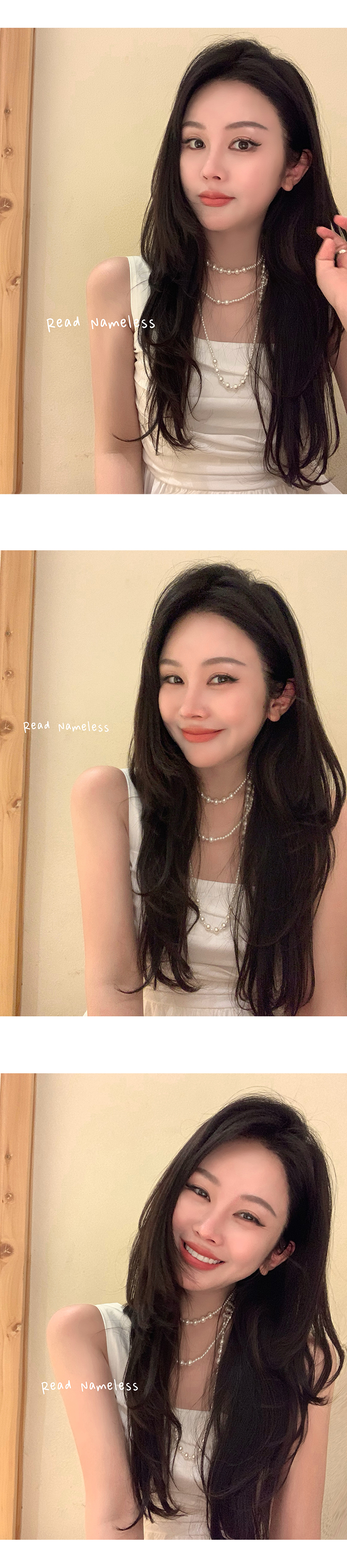 Read Nameless /灰色天丝羊毛超薄开衫+白色斜开衩吊带+灰色缎面松紧腰伞裙