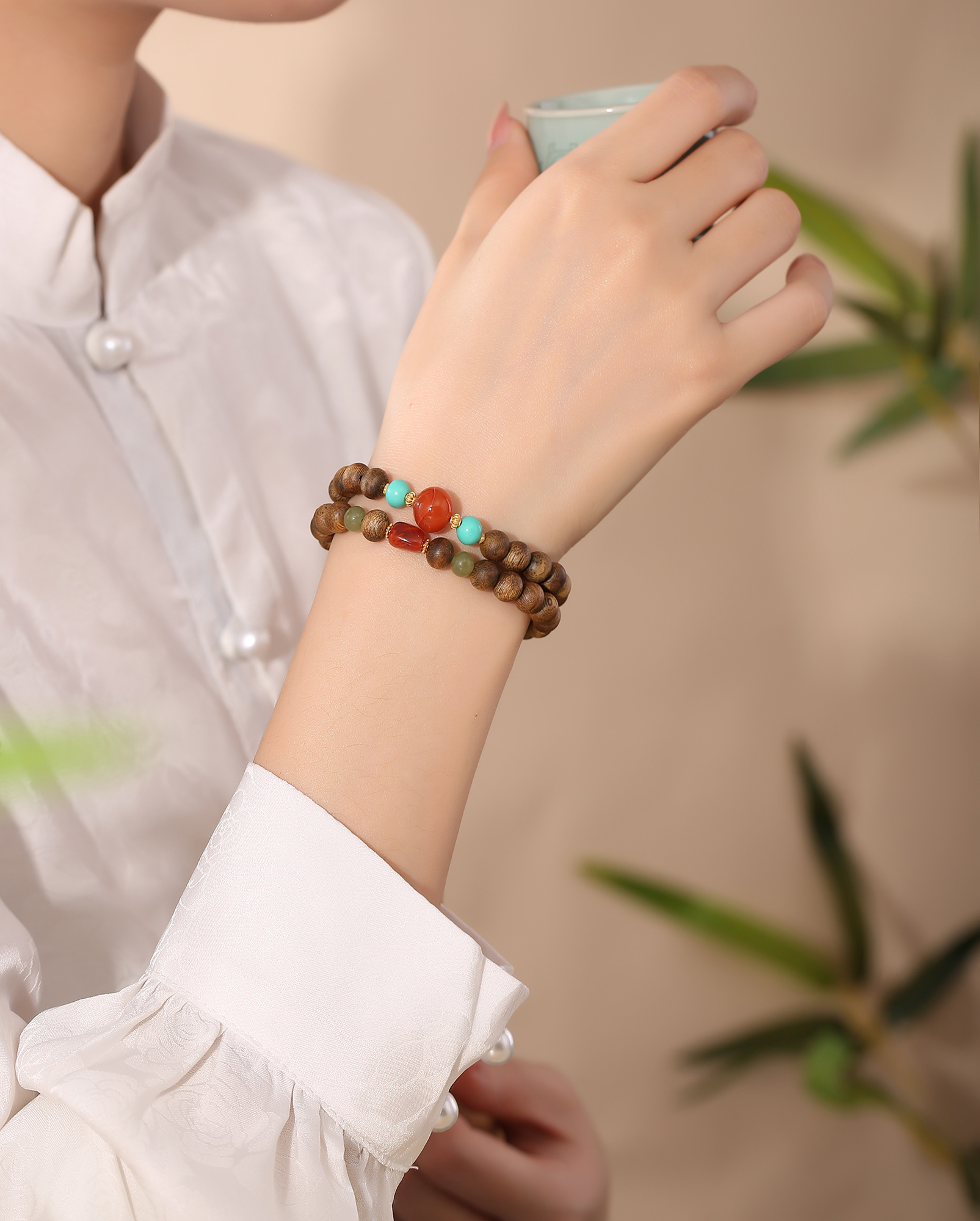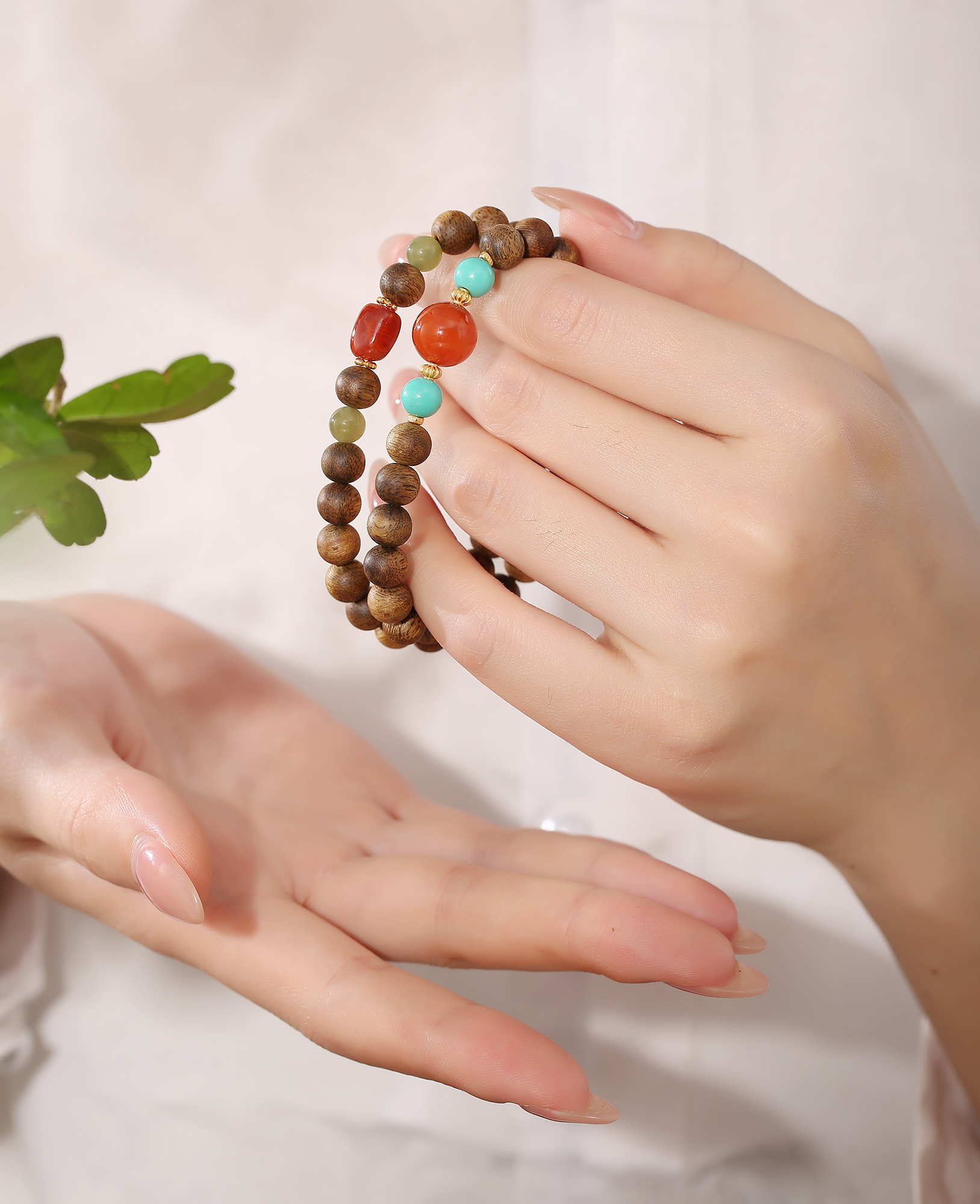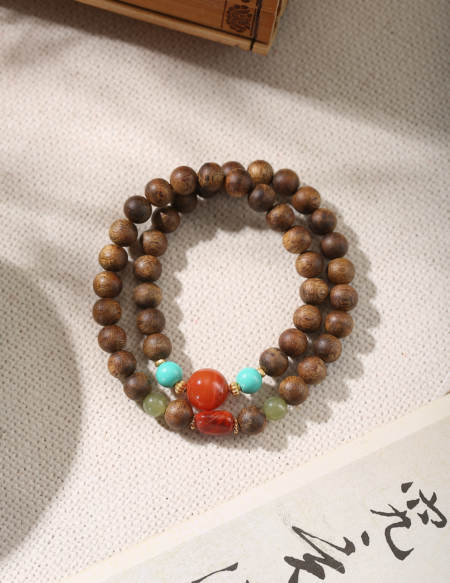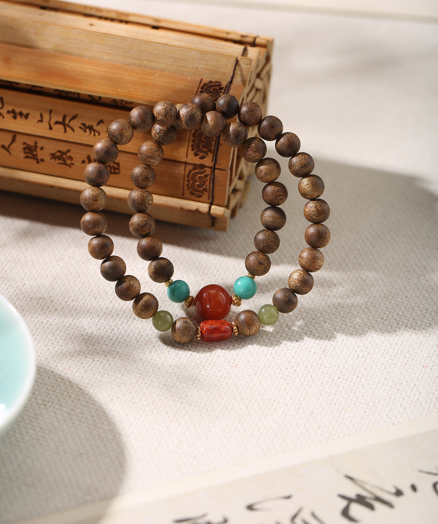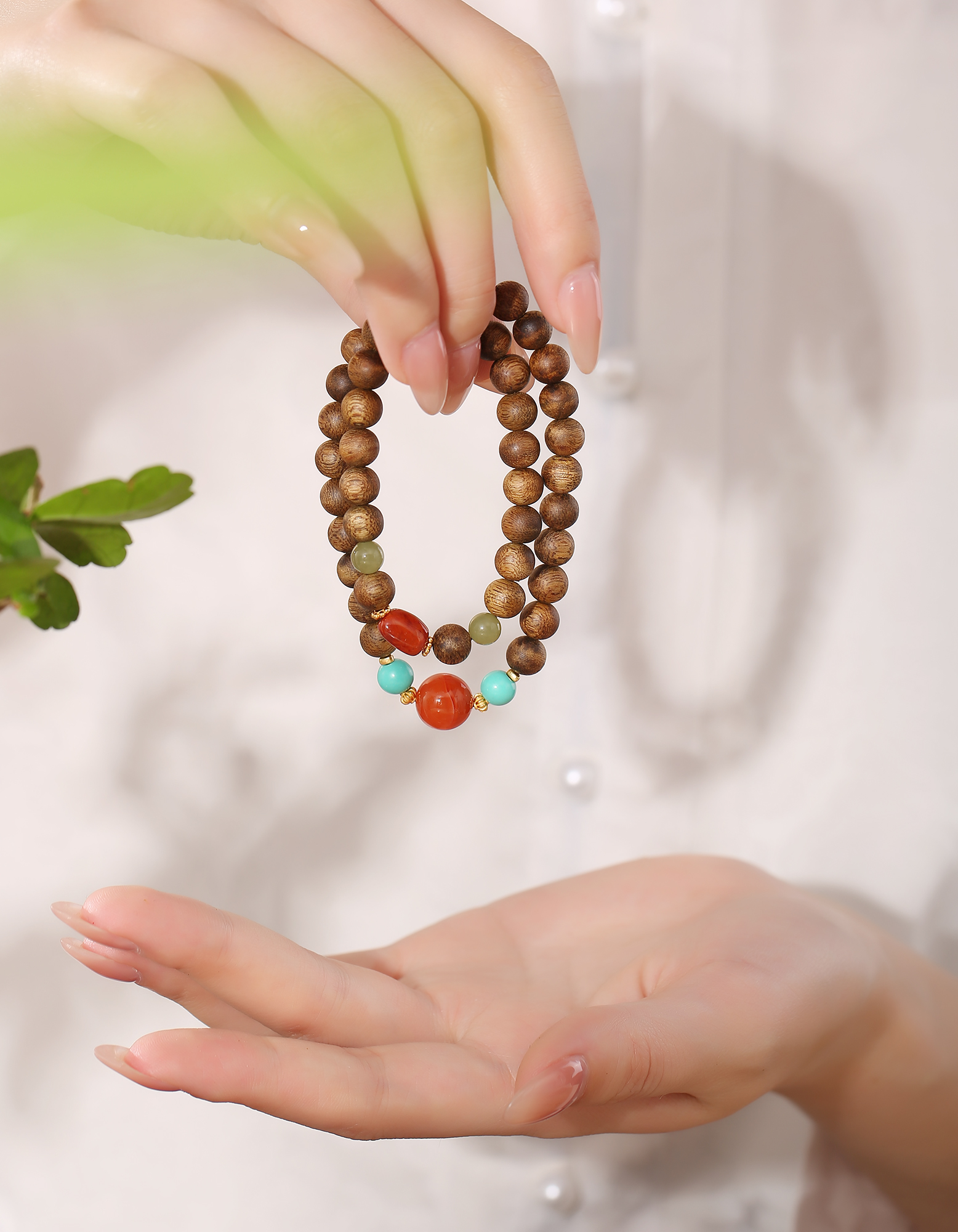 【沉香溯源】沉红翠绕双圈手串 约7mm棋楠圆珠、约10mm南红、约6mm菱镁矿、约6mm和田玉、S925银镀金配件 (特殊商品请在收货之后48小时内申请退换货,过期不予处理!!!)
