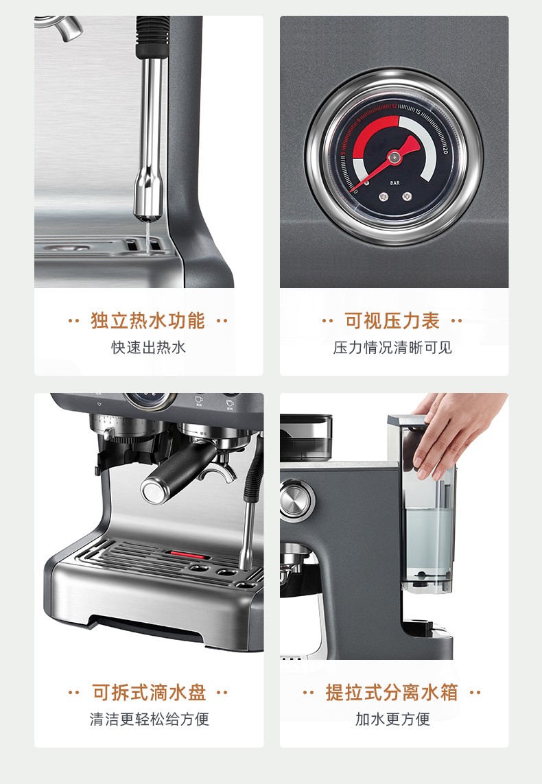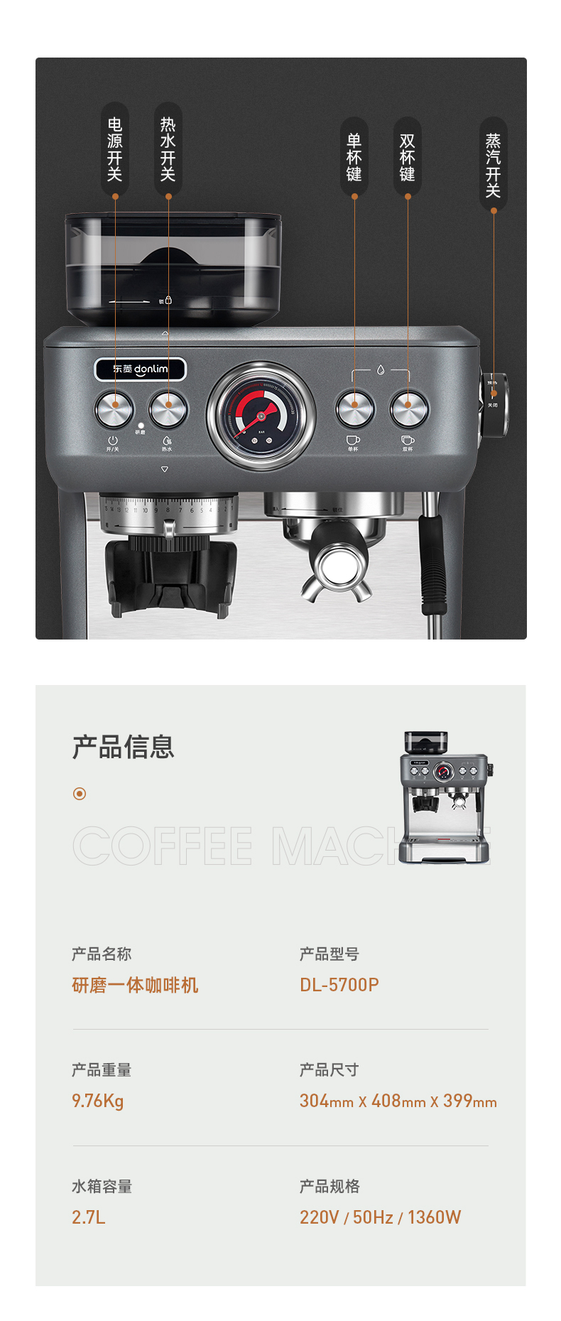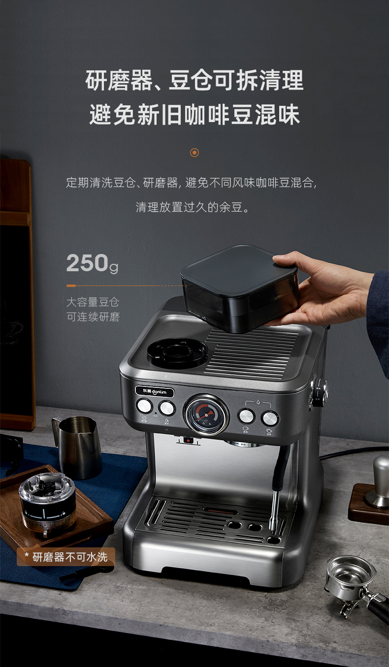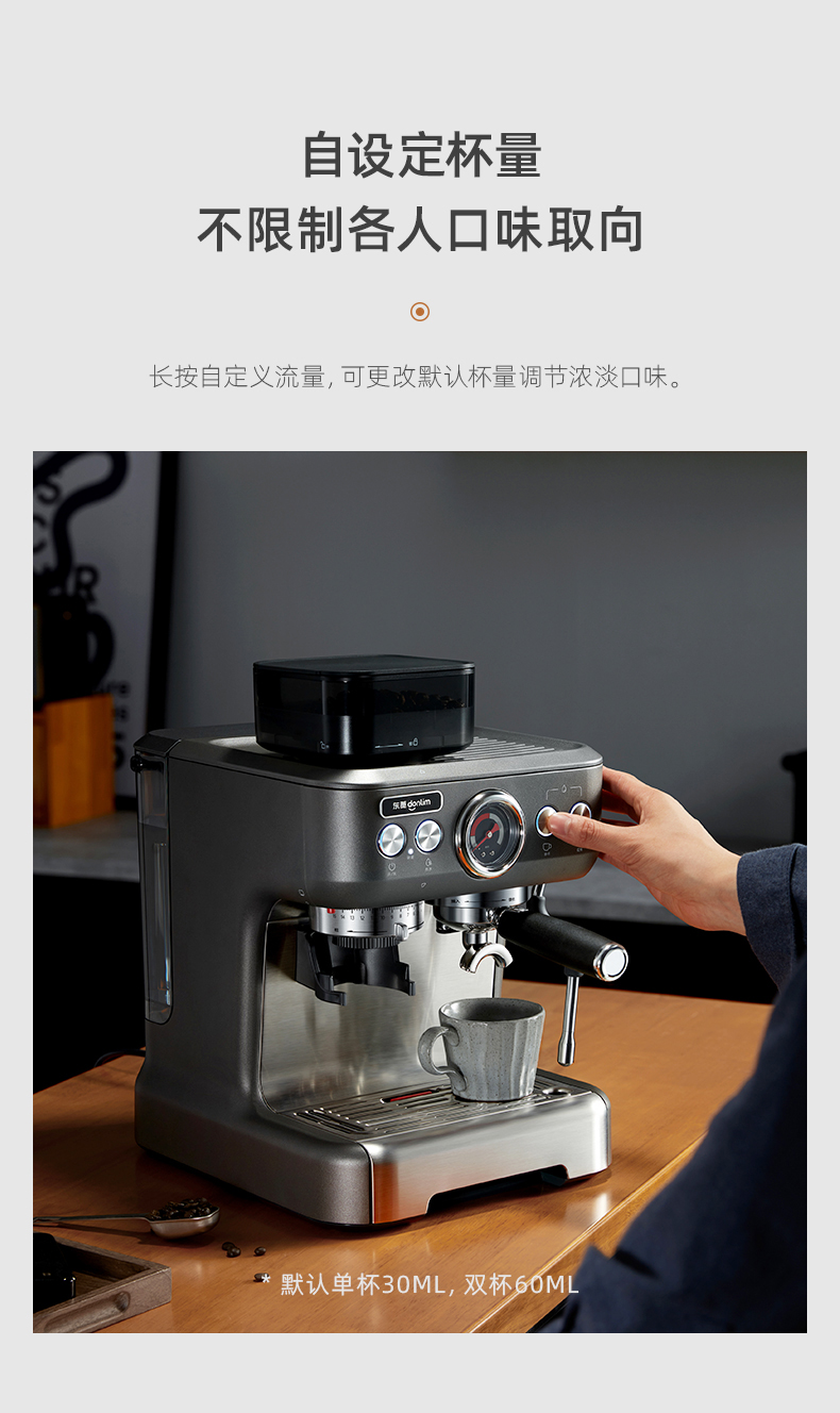 东菱(Donlim) 咖啡机 咖啡机家用 意式半自动 研磨一体机 20Bar高压萃取 蒸汽打奶泡 DL-5700P(钛金灰) 心选到家