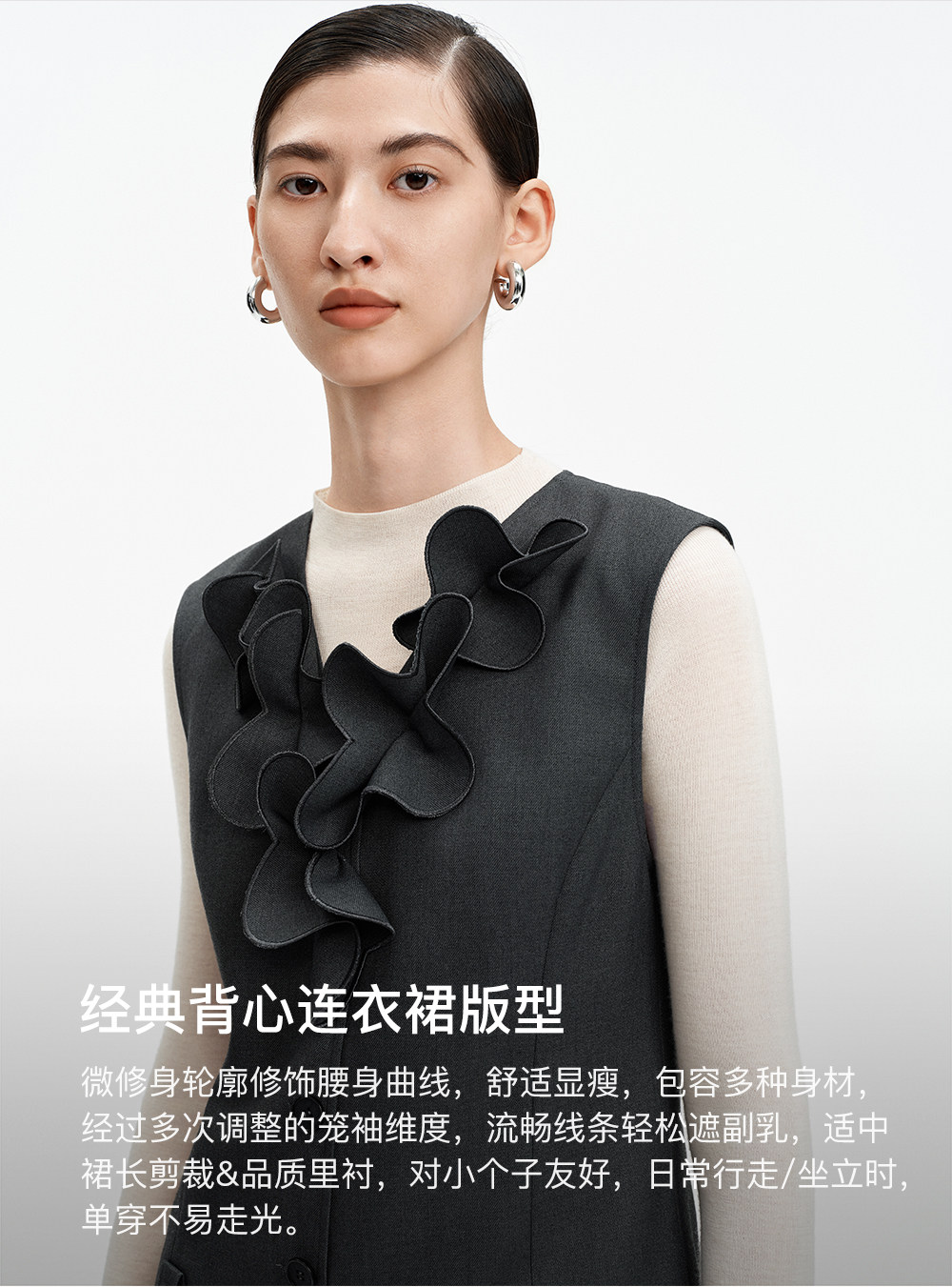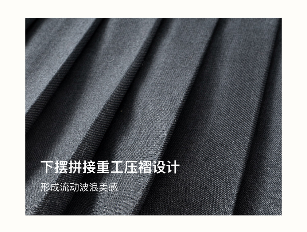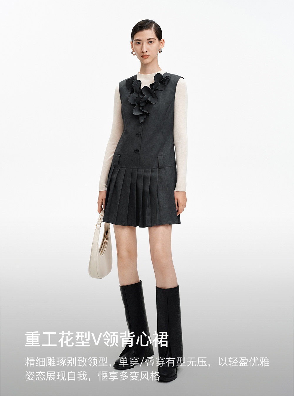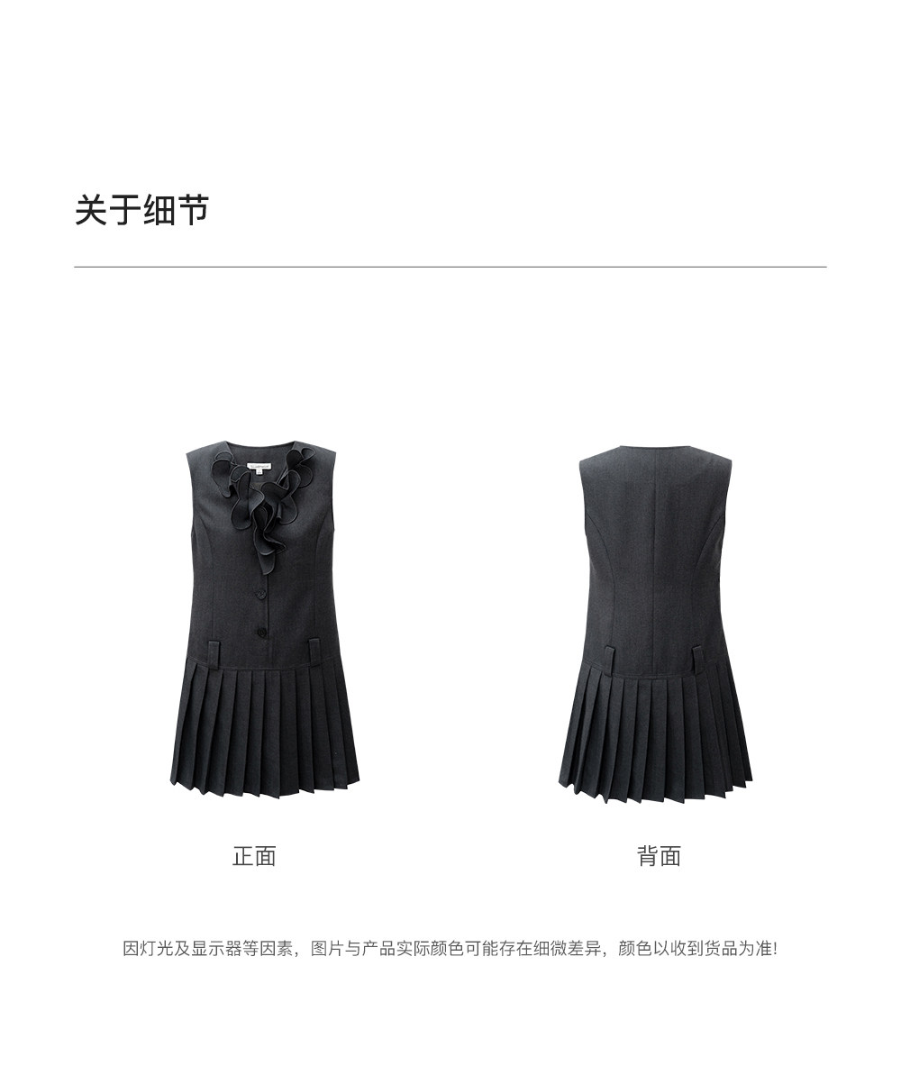 SELFWHO绵羊毛混纺V领灰色连衣裙女2026春新款立体钉花压褶无袖裙