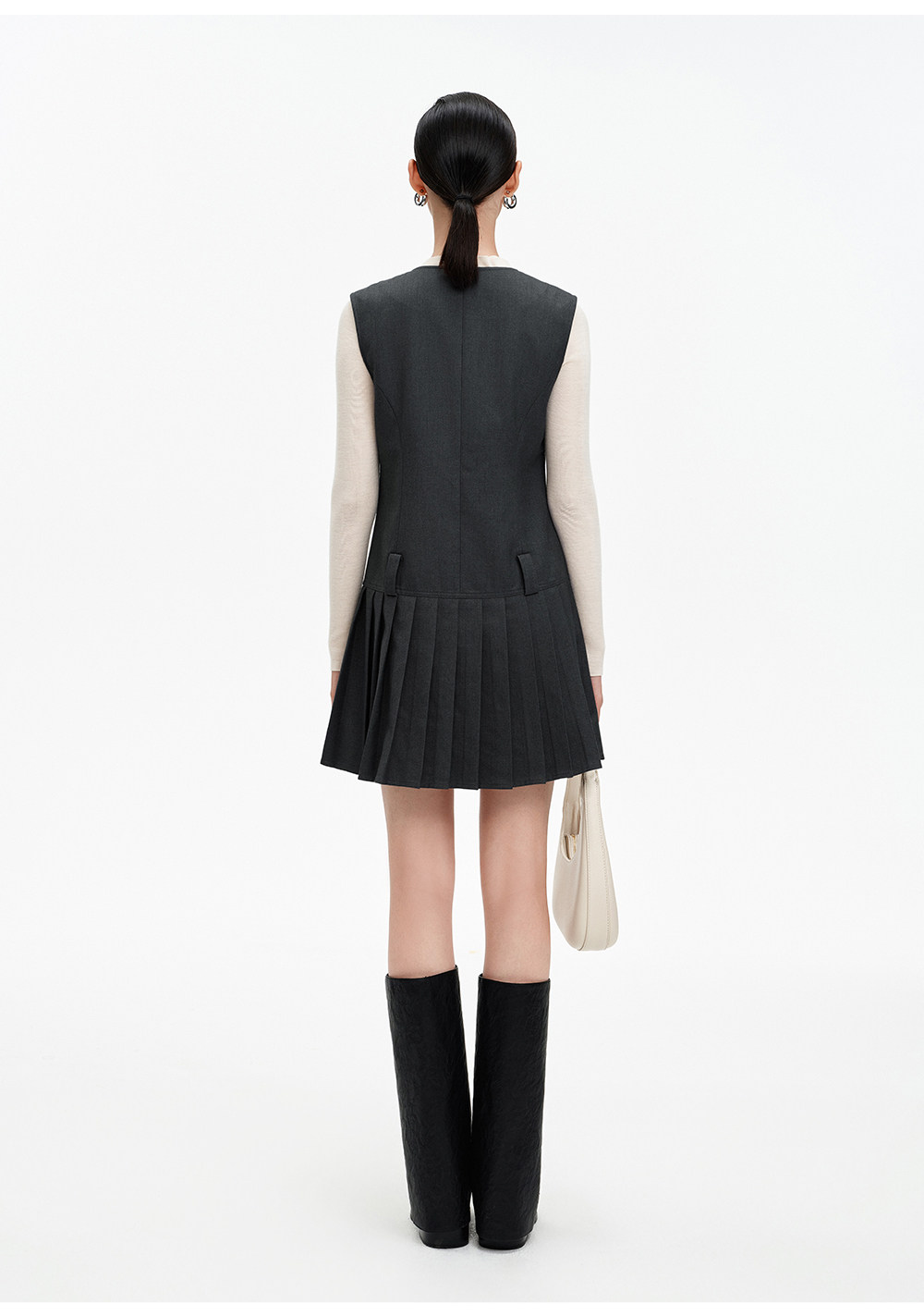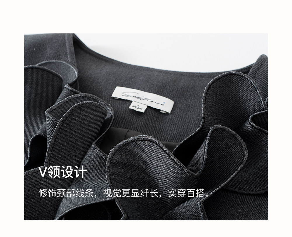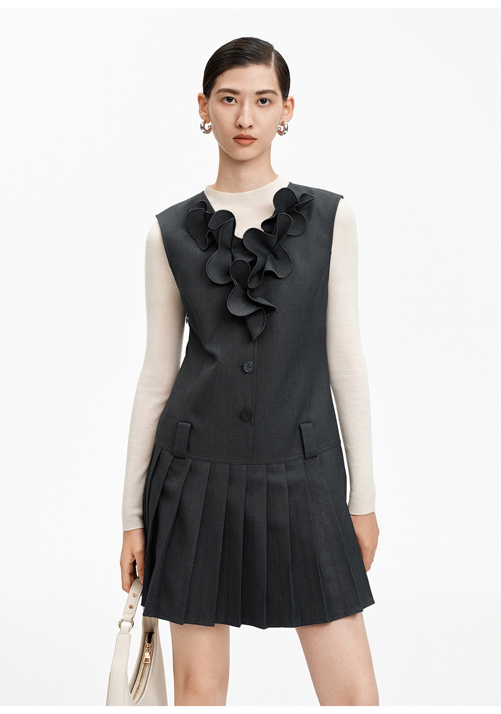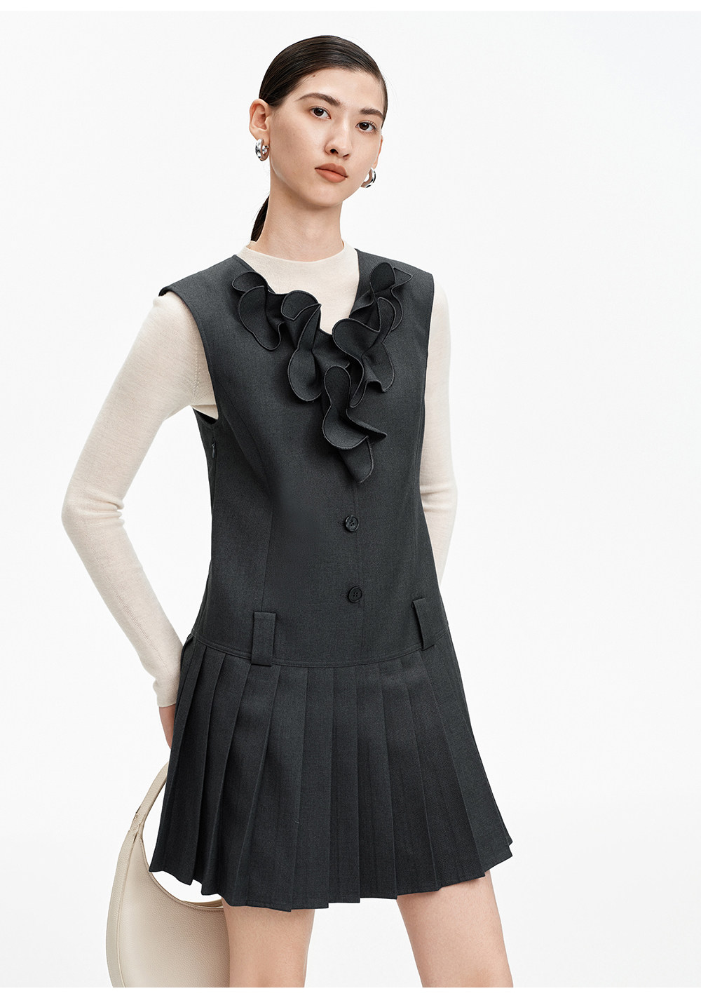 SELFWHO绵羊毛混纺V领灰色连衣裙女2026春新款立体钉花压褶无袖裙