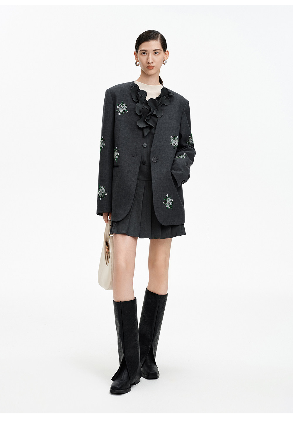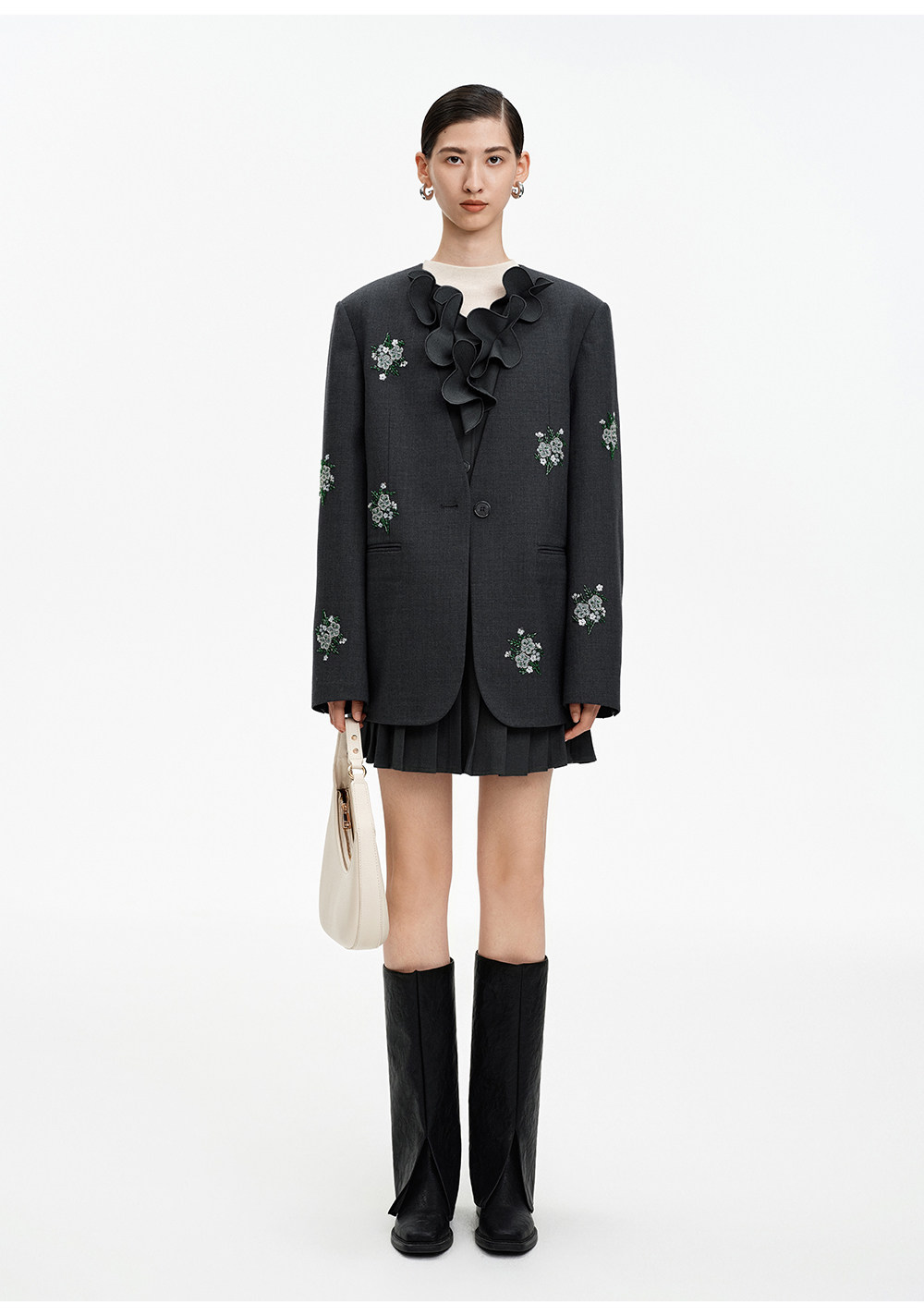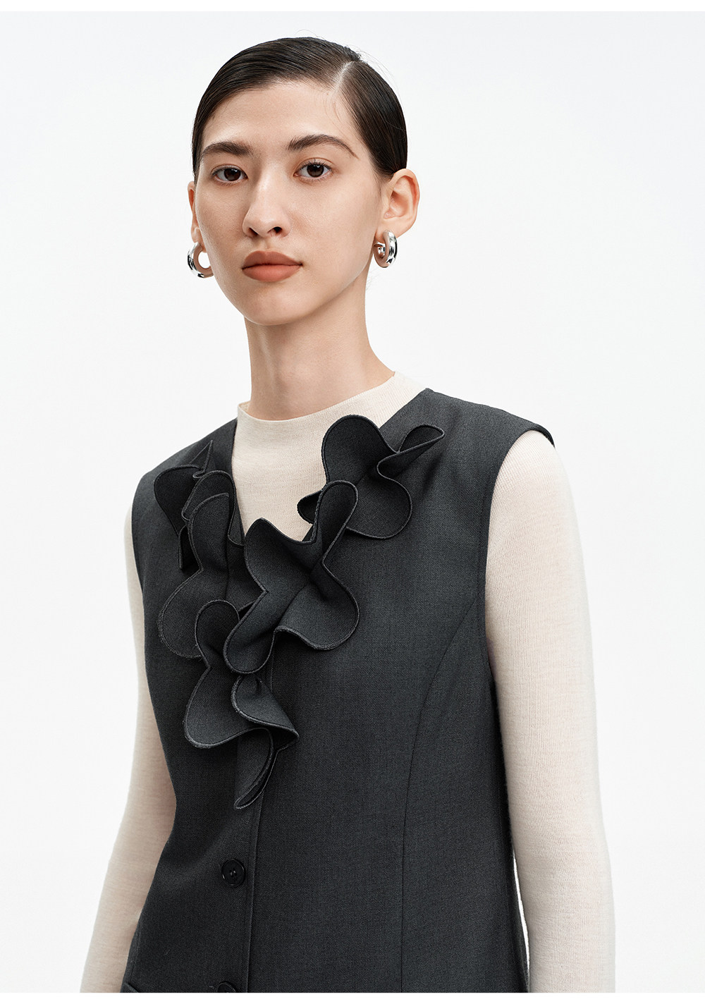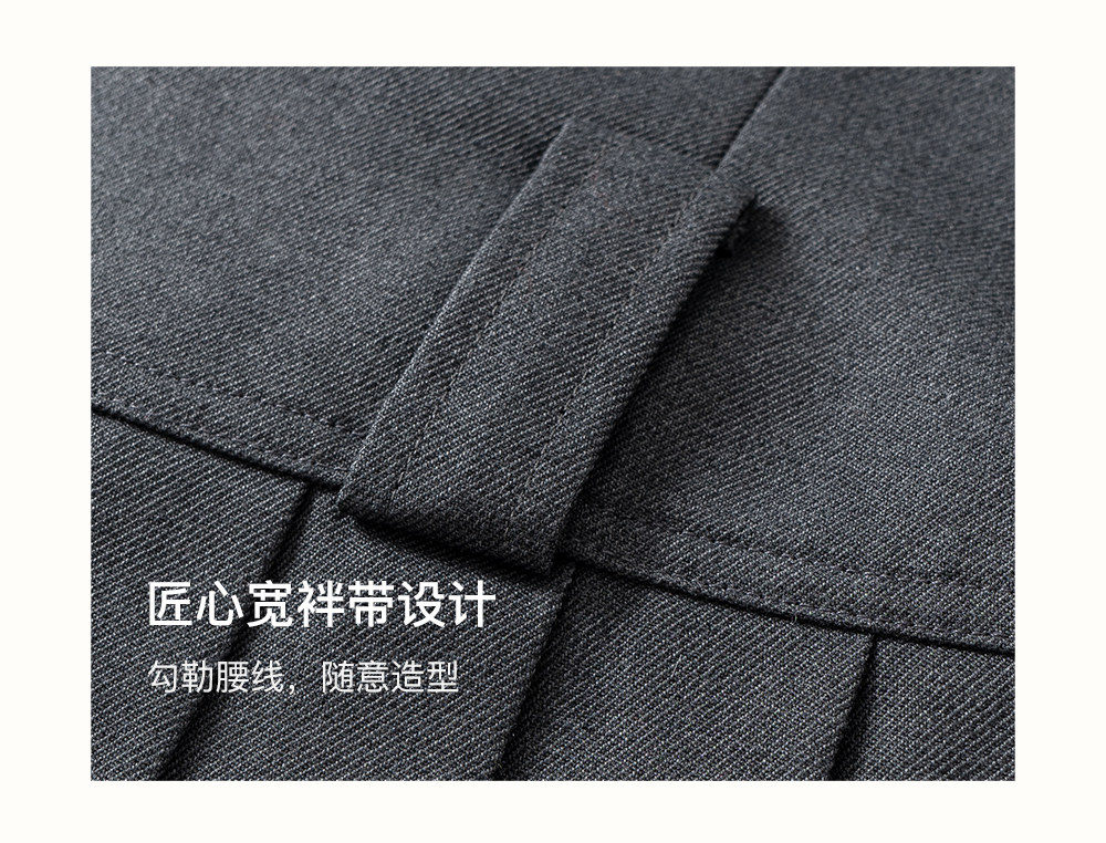 SELFWHO绵羊毛混纺V领灰色连衣裙女2026春新款立体钉花压褶无袖裙