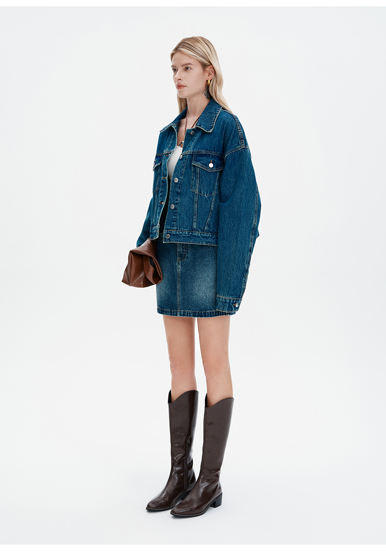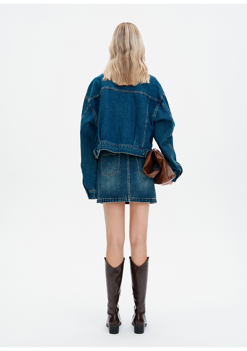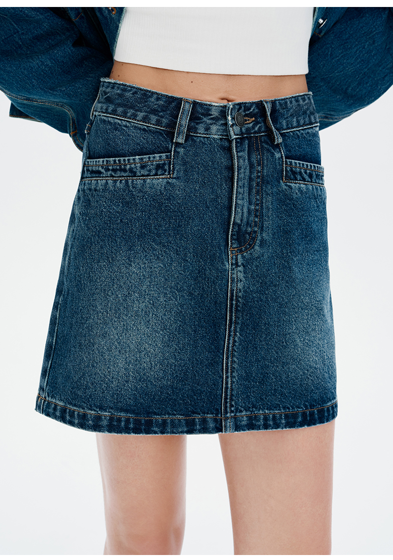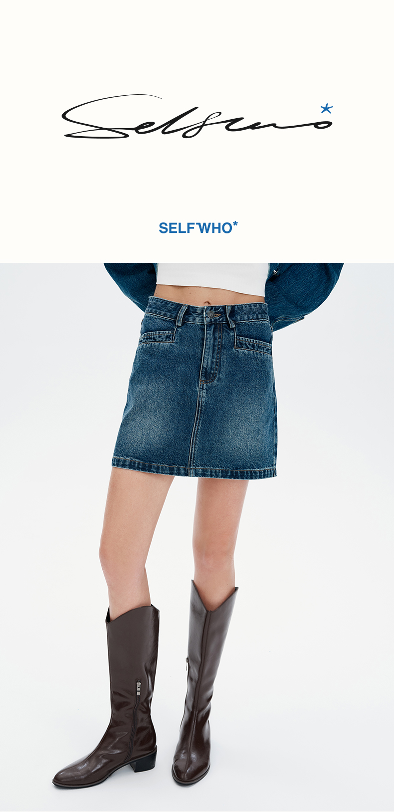SELFWHO纯棉蓝色牛仔短裙秋女2024新款水洗做旧高腰包臀a字半身裙