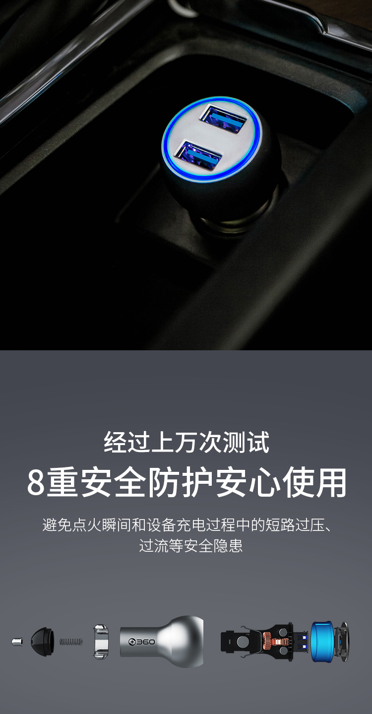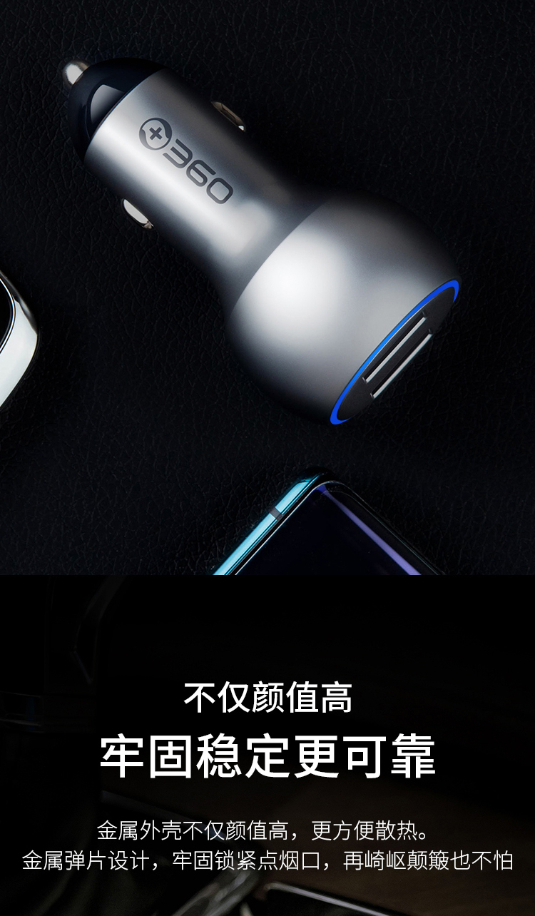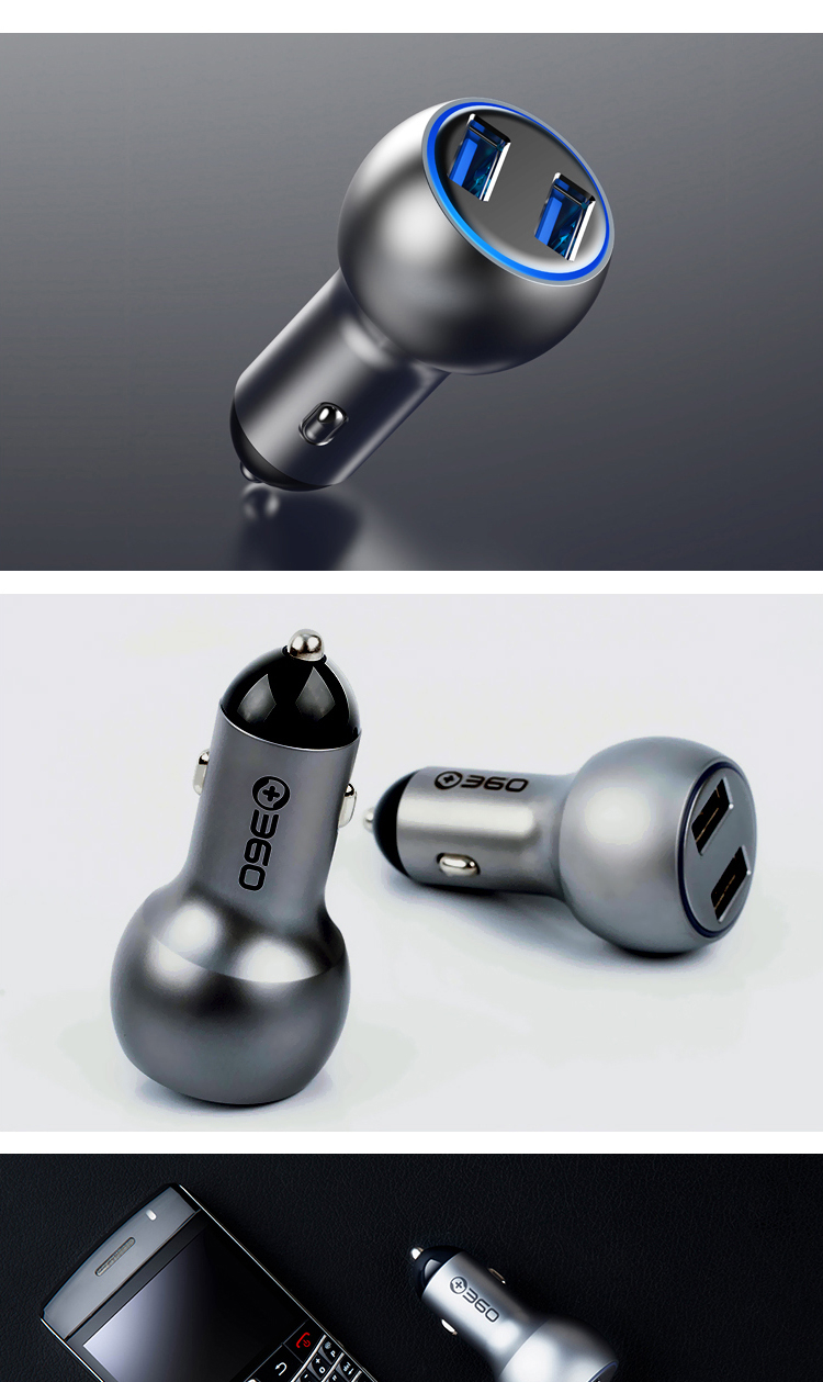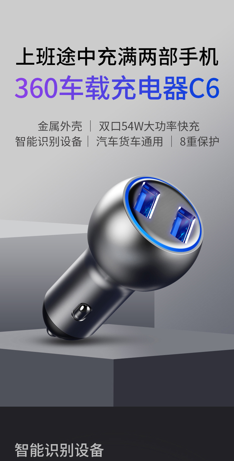360 车载充电器C6 双口54W汽车点烟器一拖二 QC3.0快充USB接口 转换器分线器插头 通用苹果华为小米手机平板