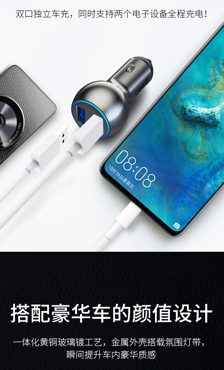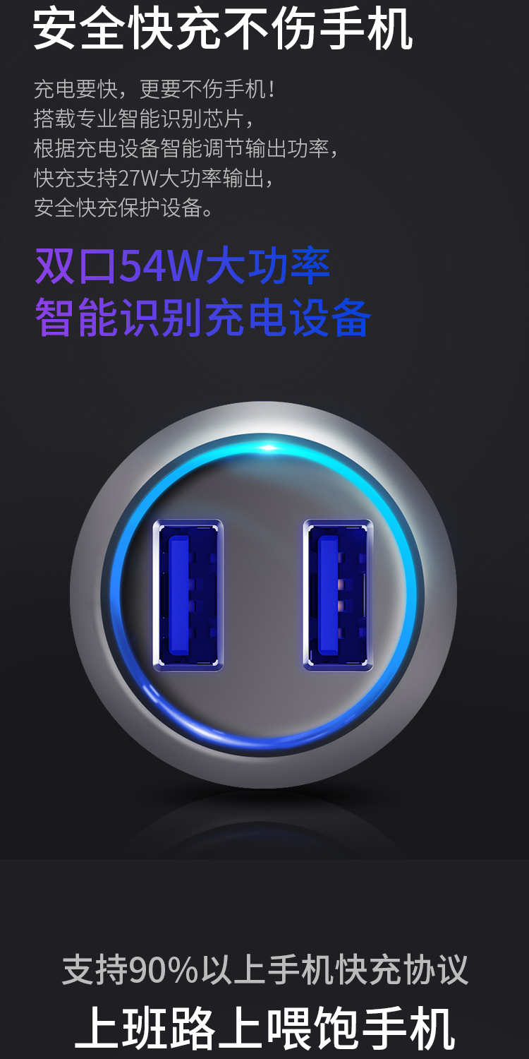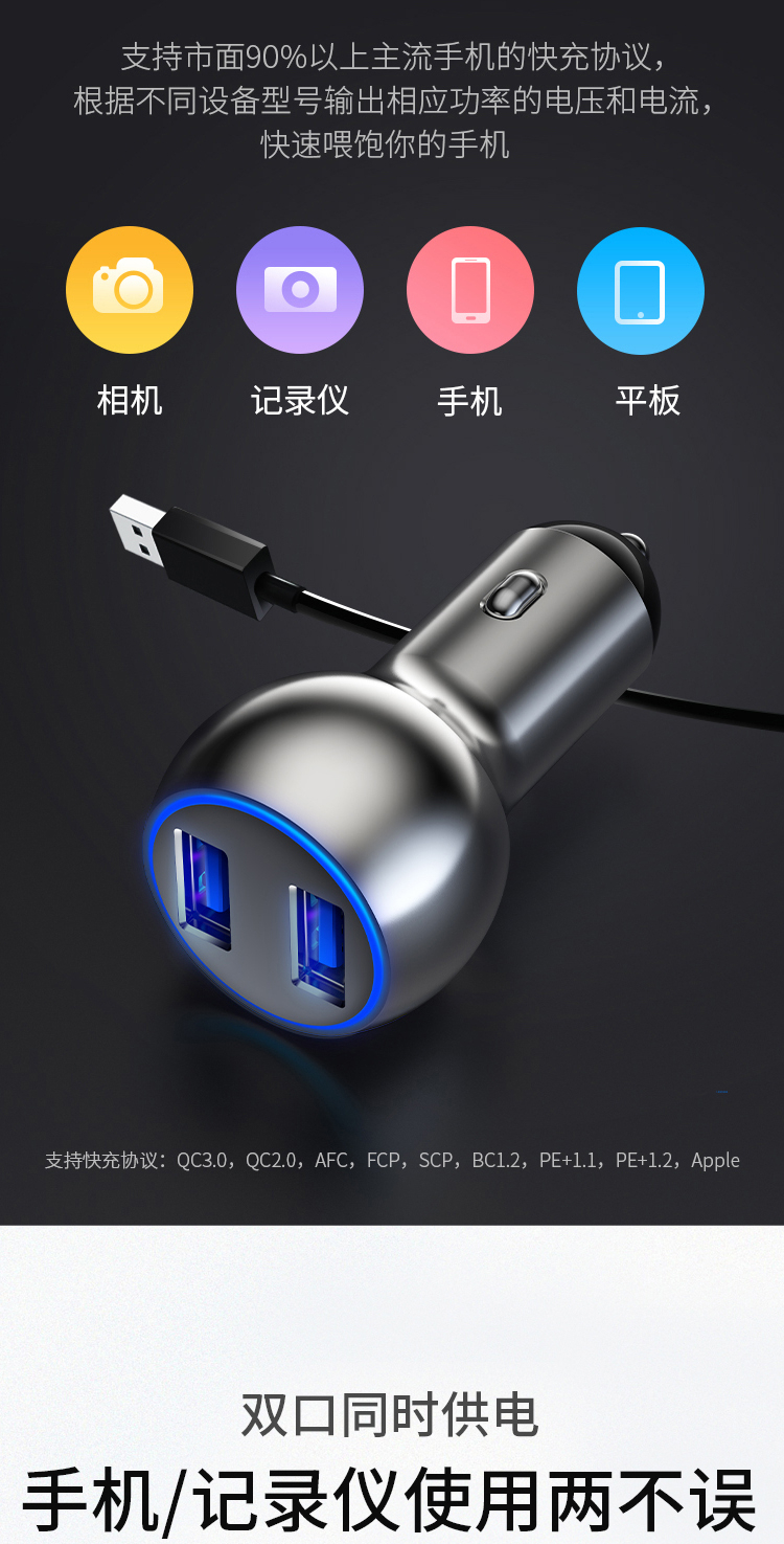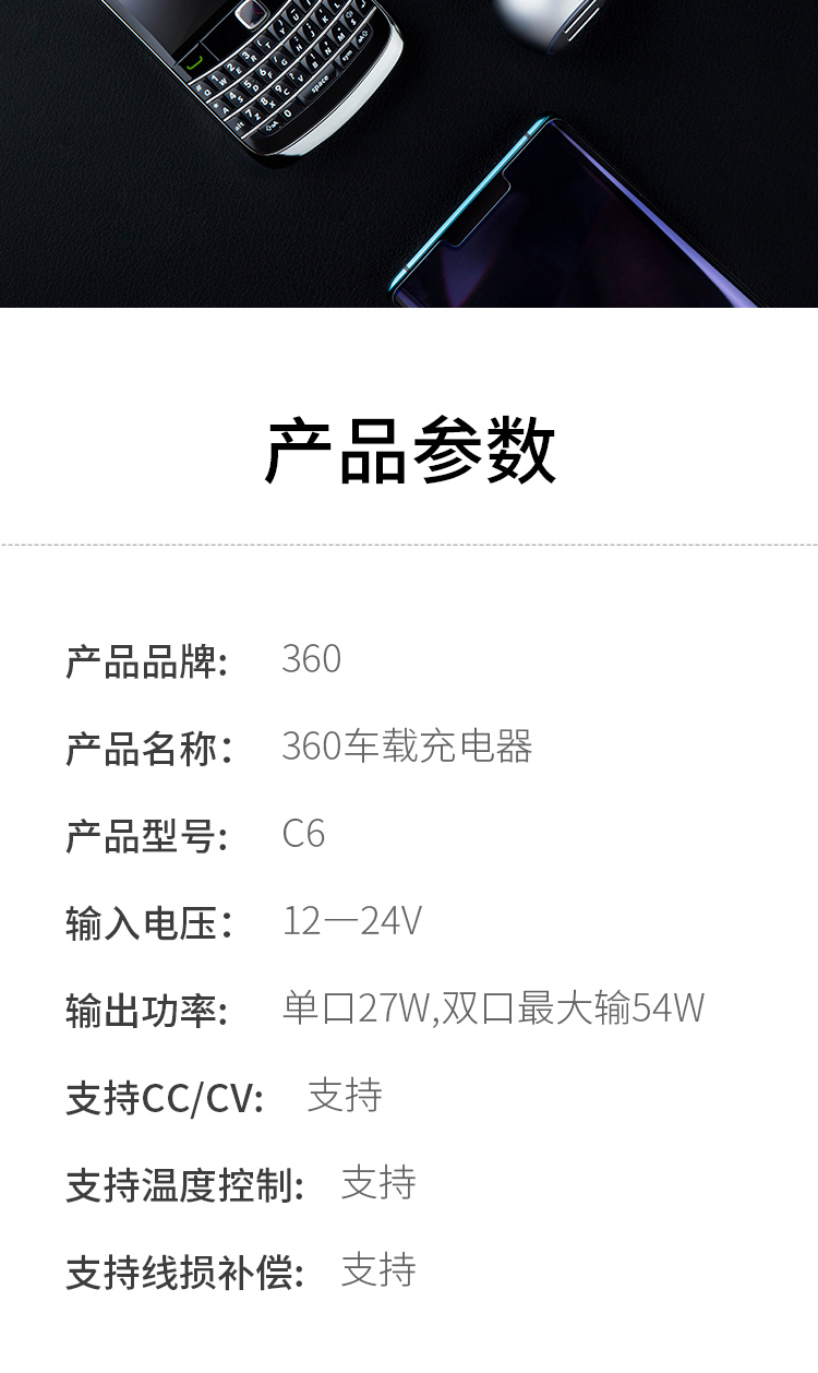 360 车载充电器C6 双口54W汽车点烟器一拖二 QC3.0快充USB接口 转换器分线器插头 通用苹果华为小米手机平板