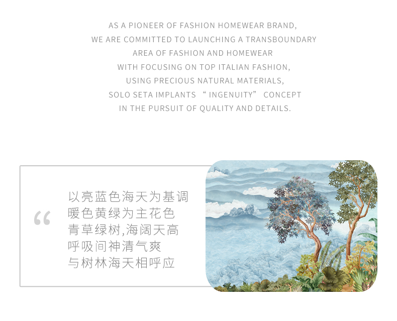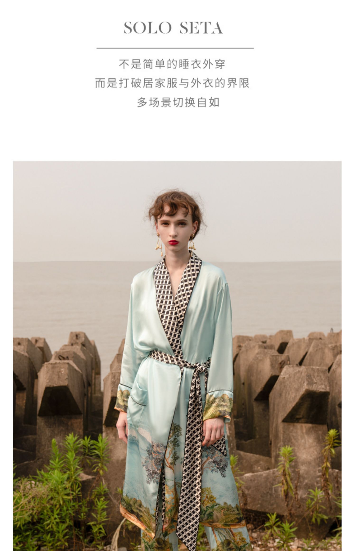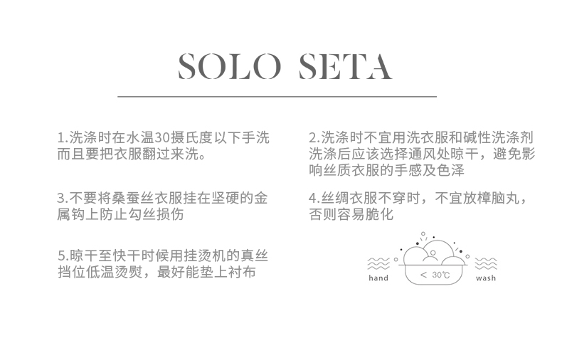 - soloseta专注于真丝织物,灵感源自意大利语,中文含义为“只做真丝”的意思。让睡衣变时尚,居家和外出瞬间切换,使其更具有出街,度假,参加宴会等功能。