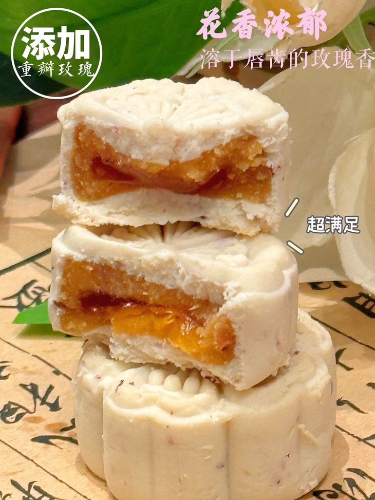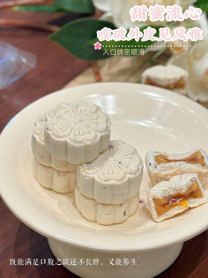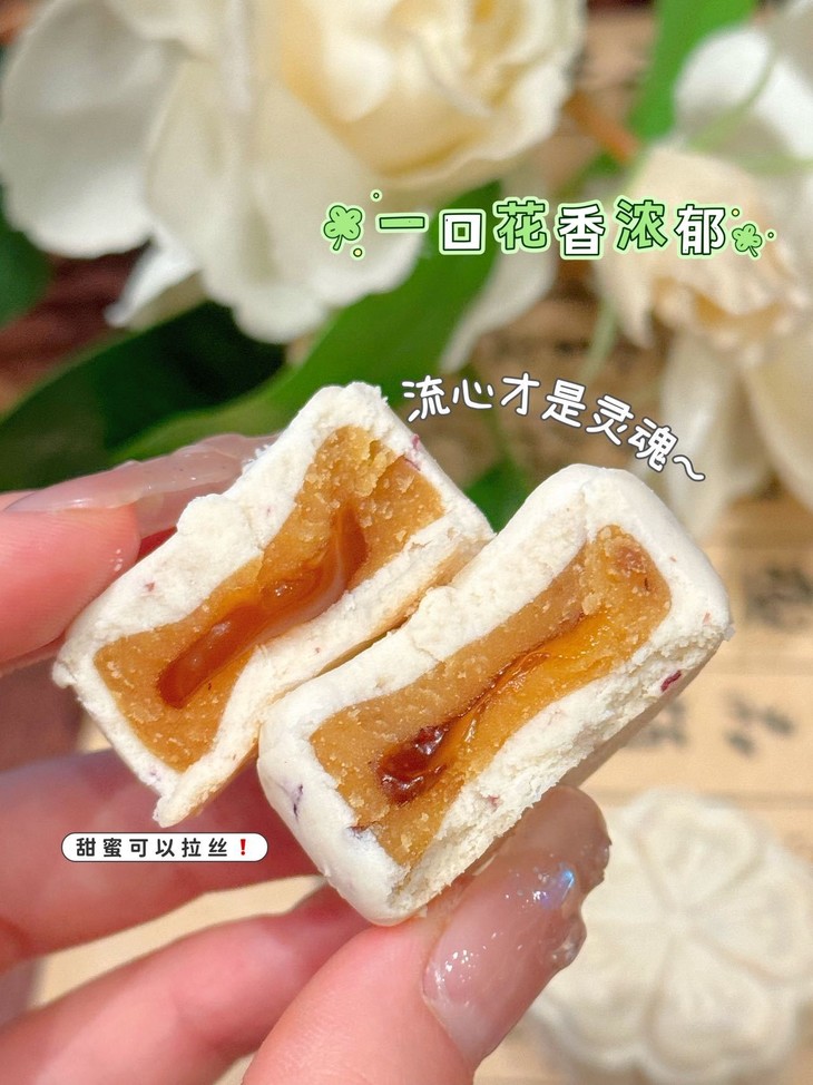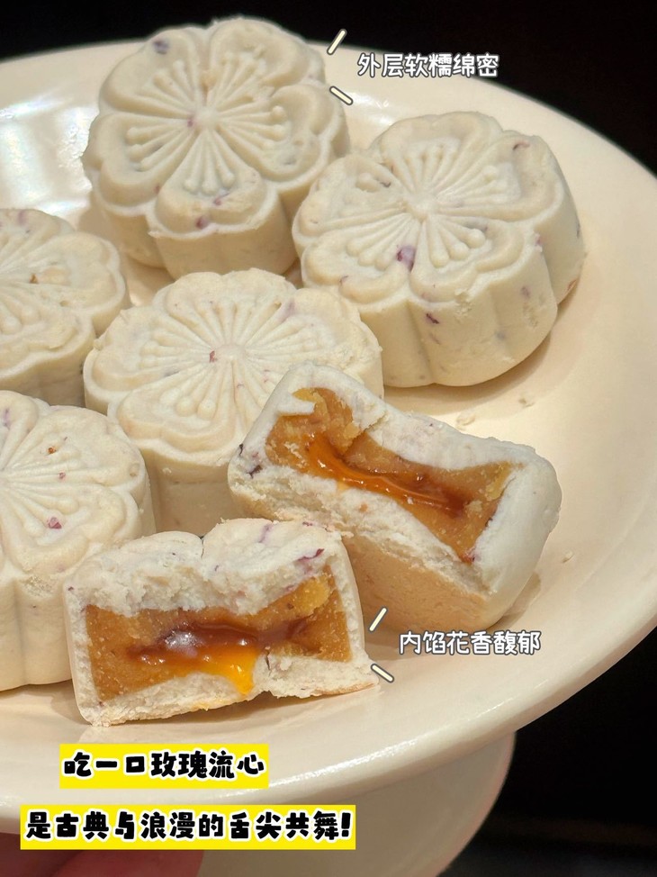 还有谁没吃过这款玫瑰流心七白糕! 一口下去满是玫瑰的浪漫 吃过一次就爱上! 💕 七白糕传统上一般由山药、莲子、百合、杏仁、银耳、茯苓、芡实等七种白色食材制作而成 这款玫瑰流心七白糕在此基础上加入了红枣和重瓣玫瑰 中间呈现流心效果😋 既为整个糕点增添了玫瑰的芳香 又丰富了口感层次 使其兼具美味与营养!🏻