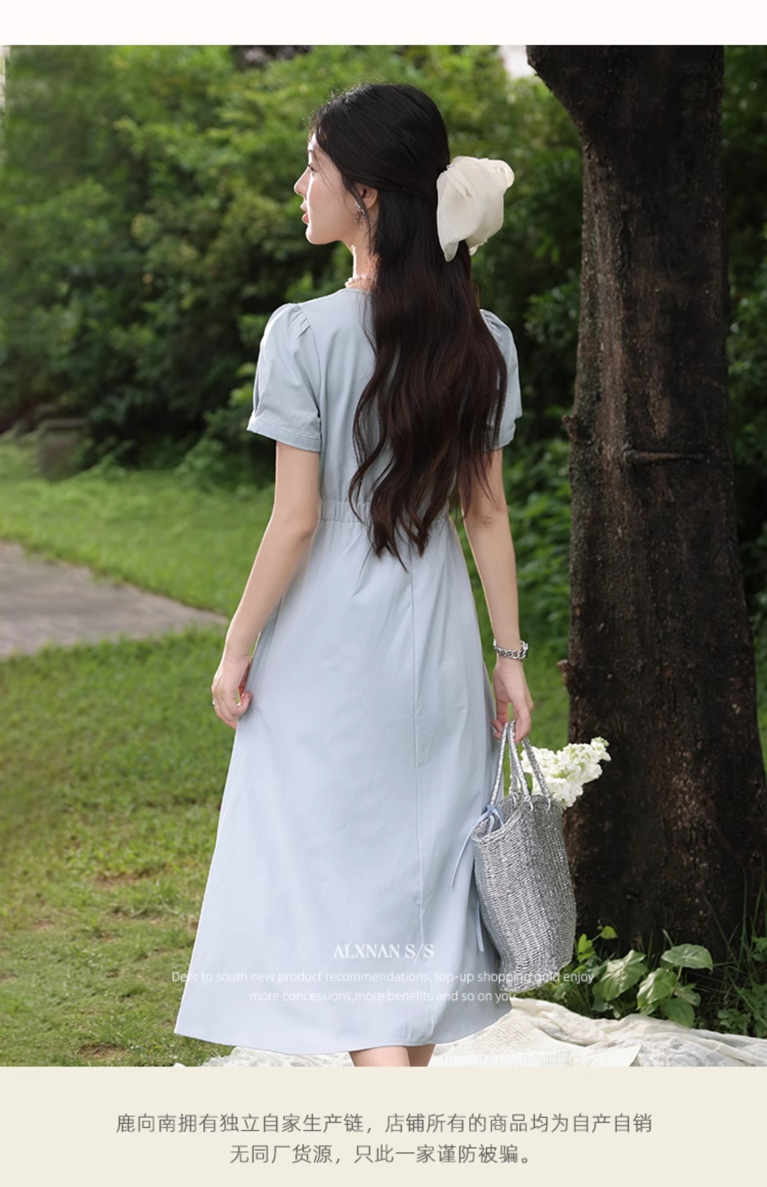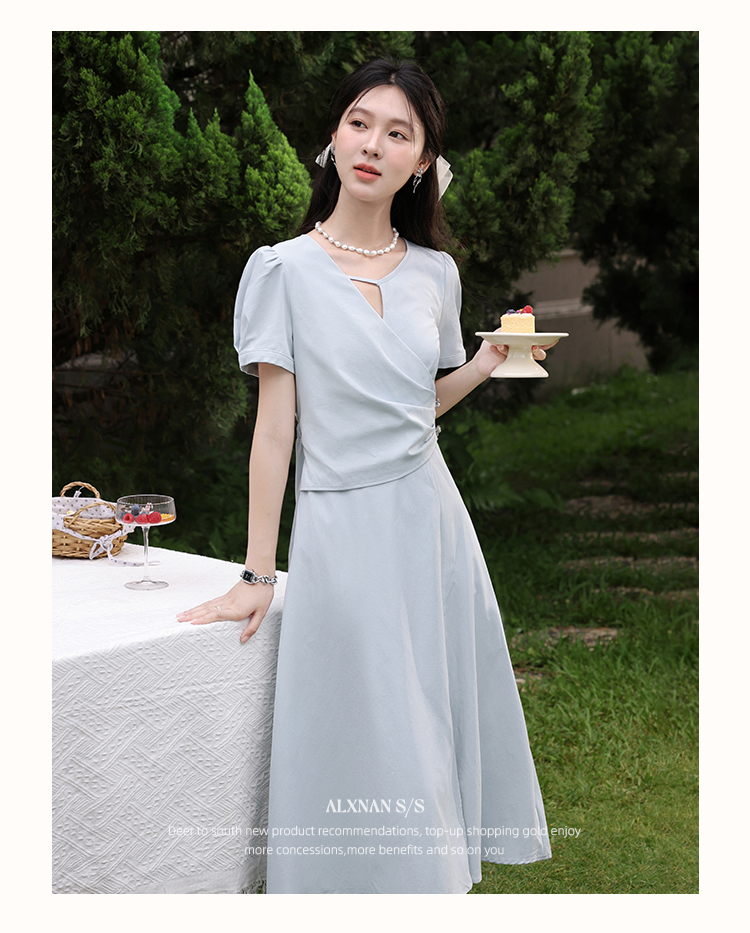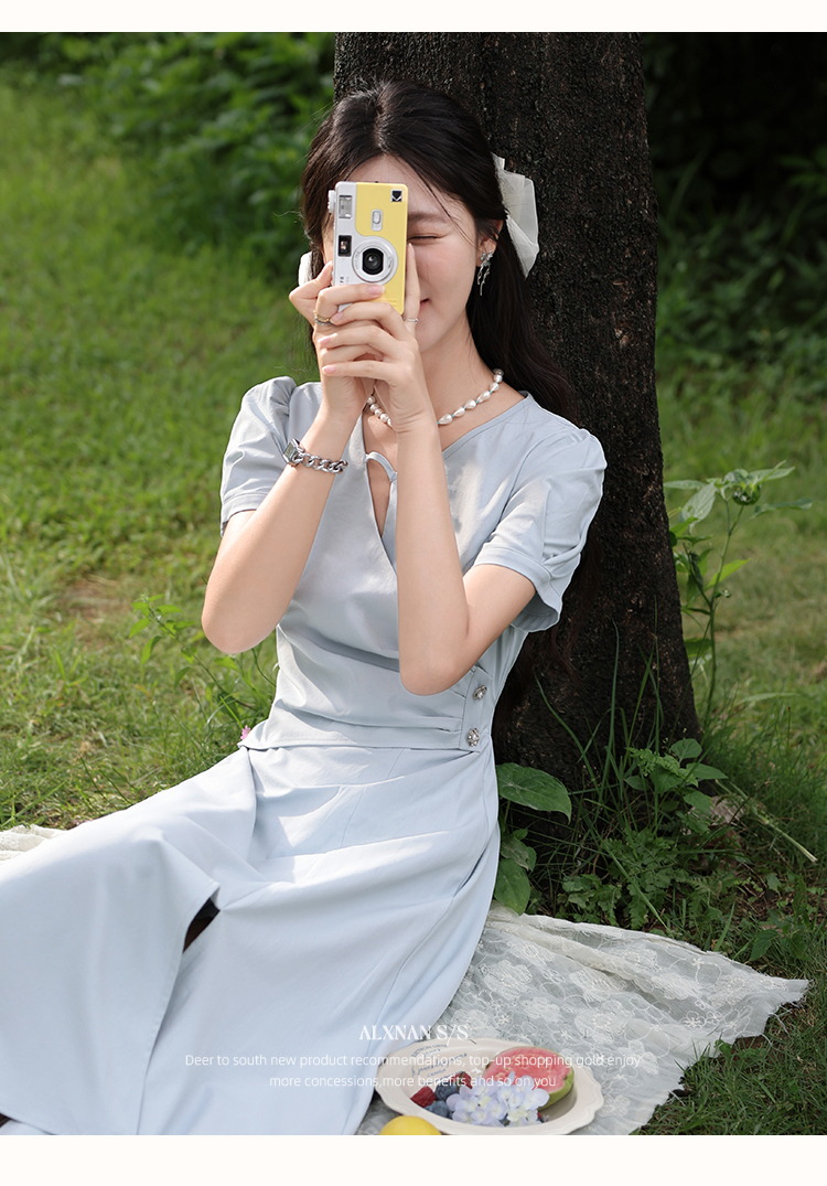 鹿向南「海盐特调」法式蓝色镂空连衣裙女夏季收腰设计感气质裙子