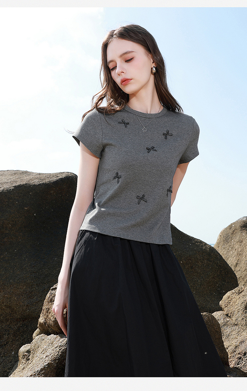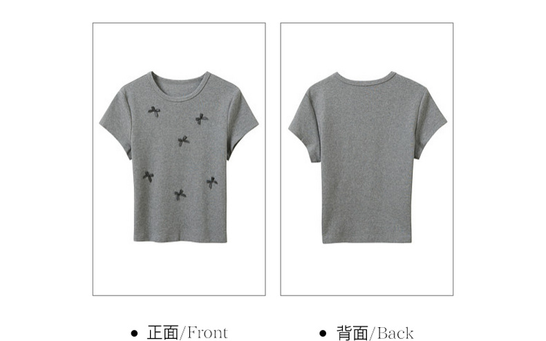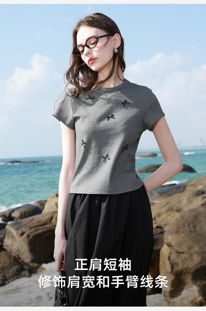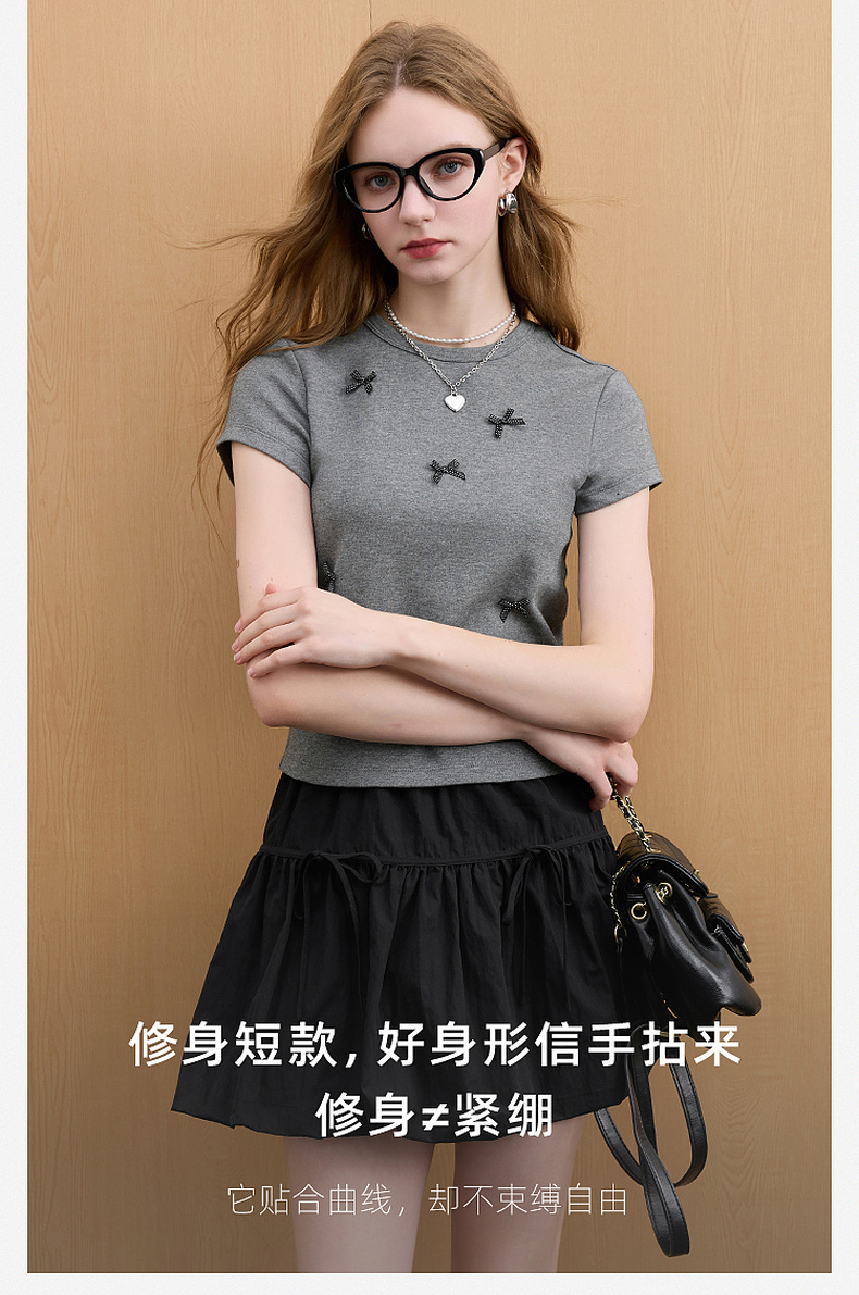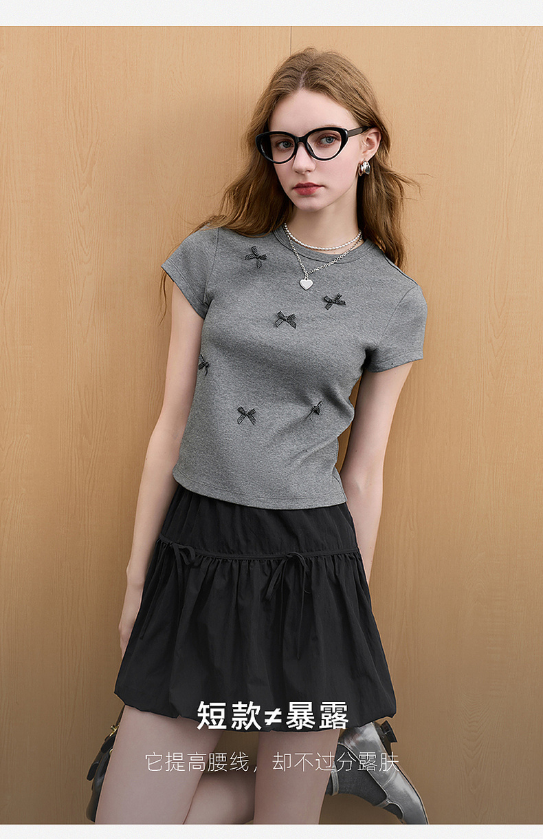 三彩2026夏季新款蝴蝶结T恤修身短款圆领正肩短袖套头衫上衣M
