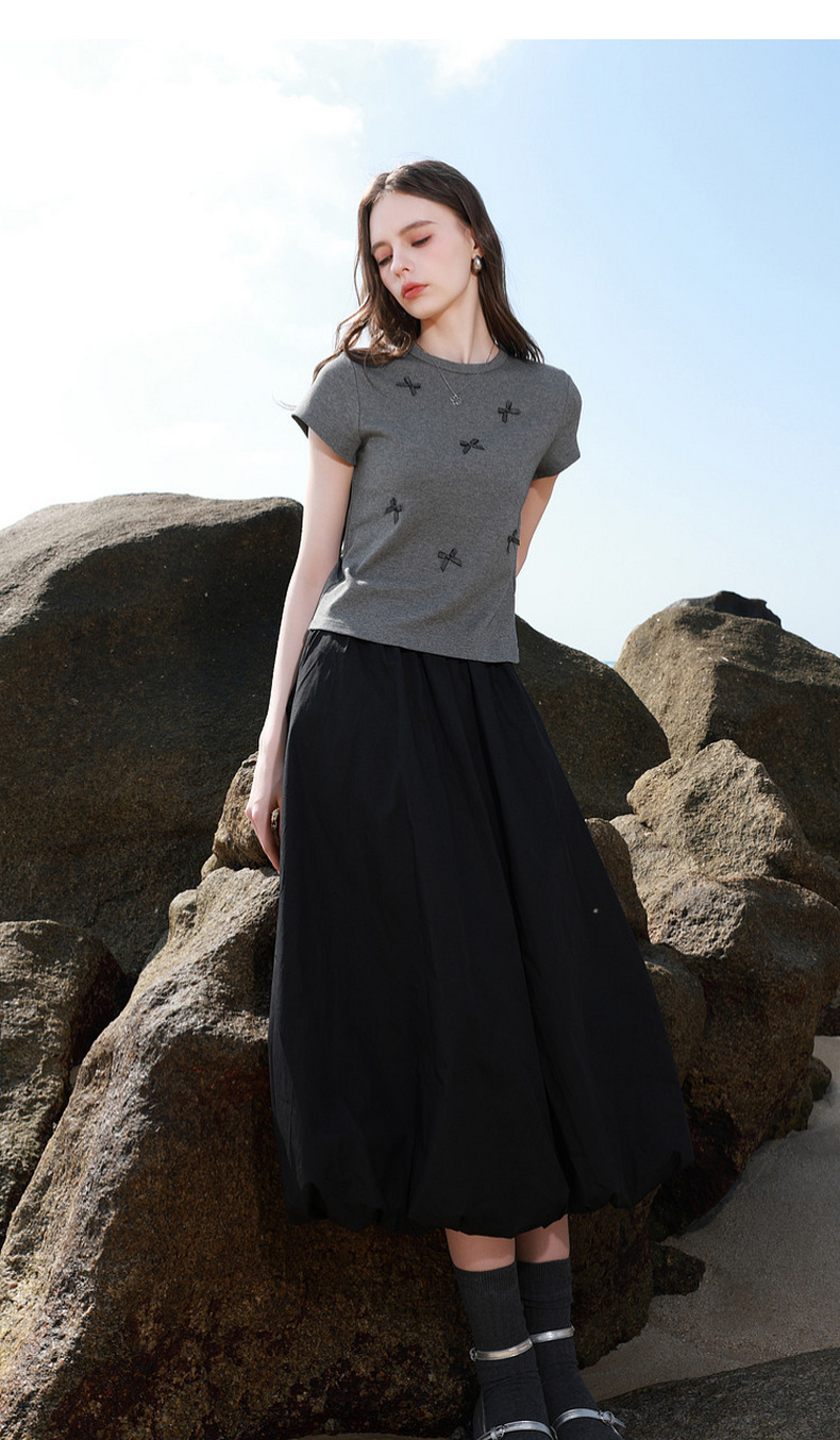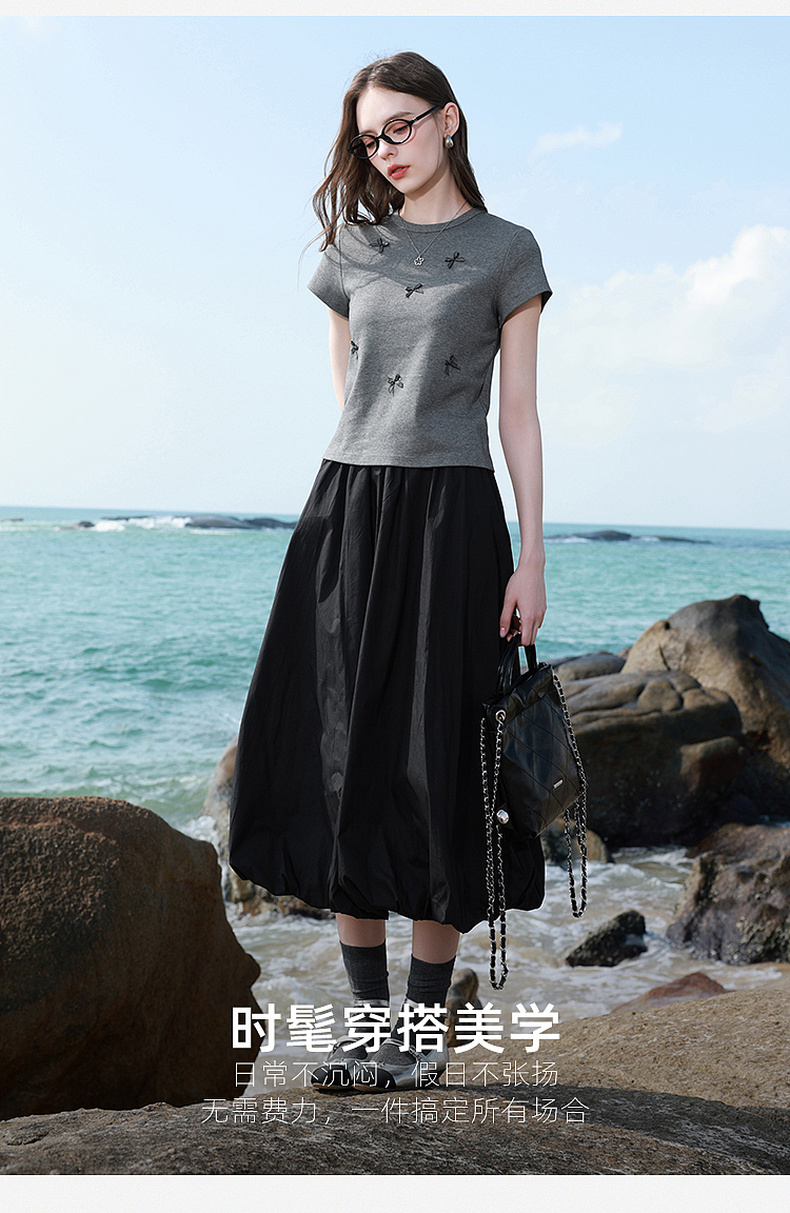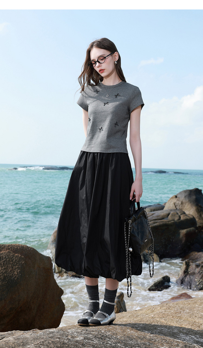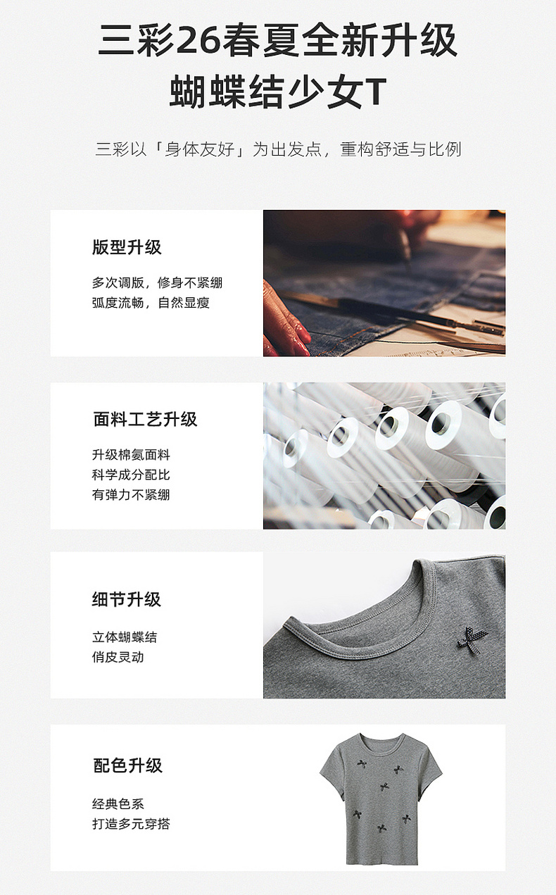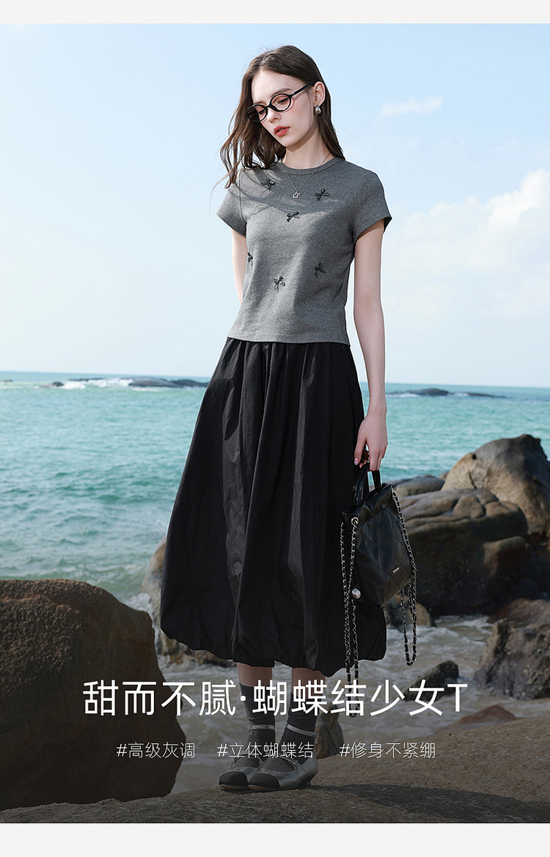 三彩2026夏季新款蝴蝶结T恤修身短款圆领正肩短袖套头衫上衣M