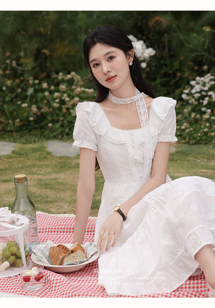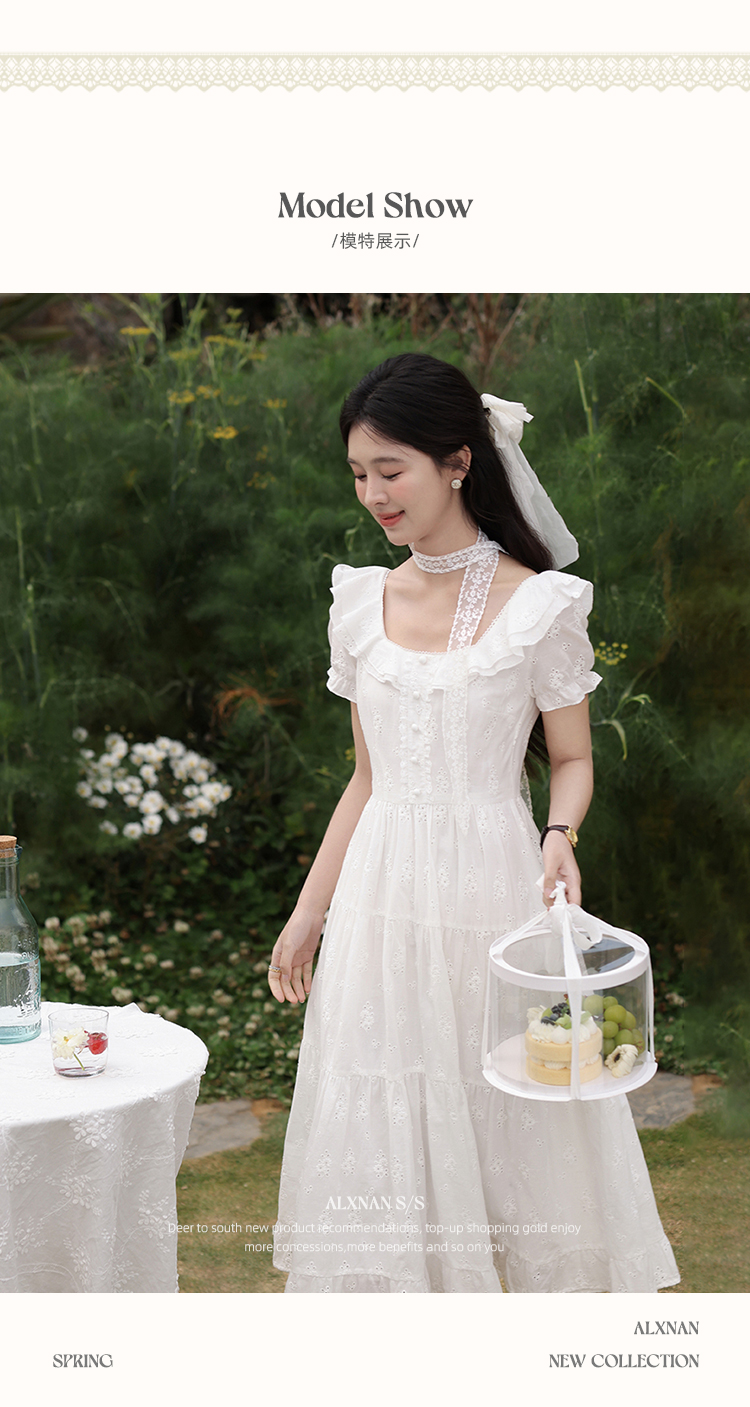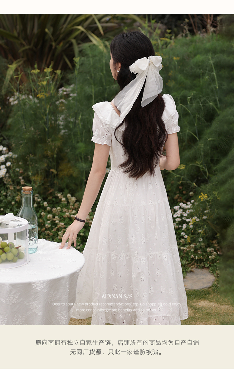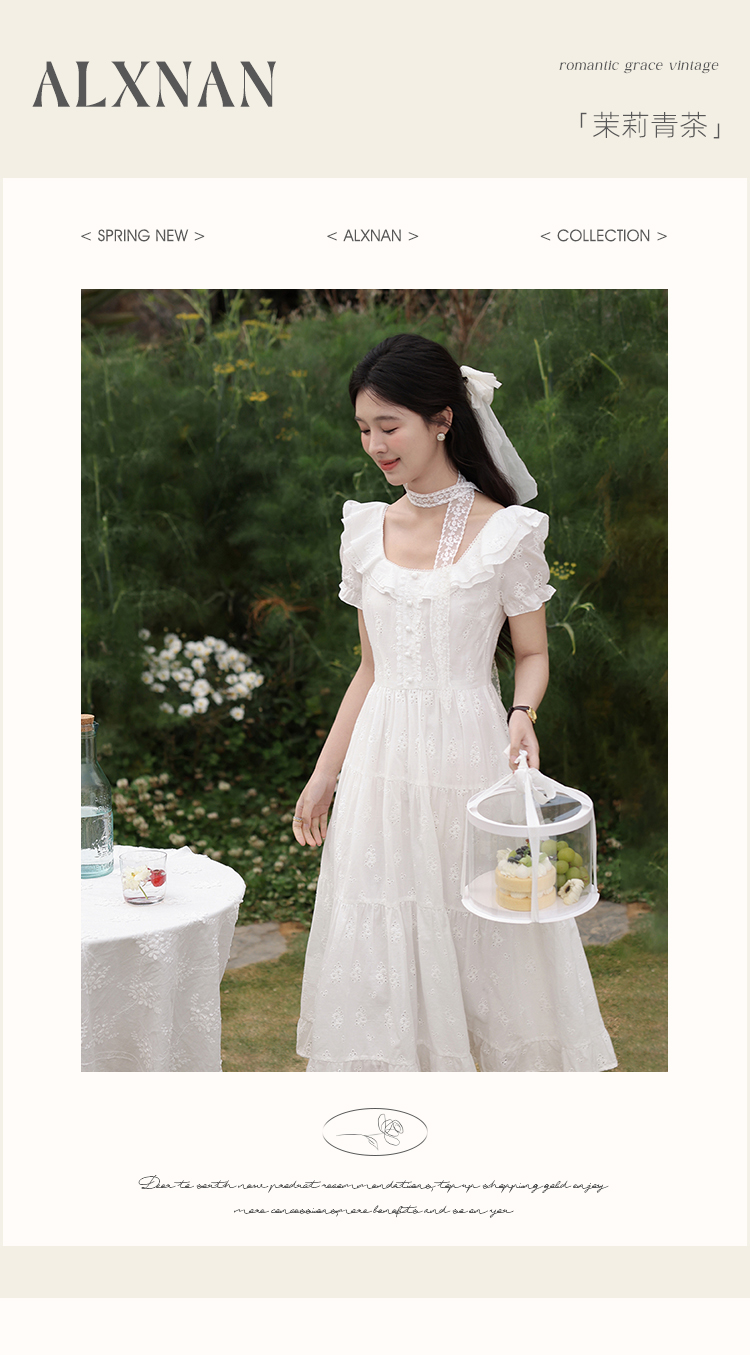 鹿向南「茉莉青茶」米白色方领蕾丝短袖连衣裙夏季新款收腰长裙女