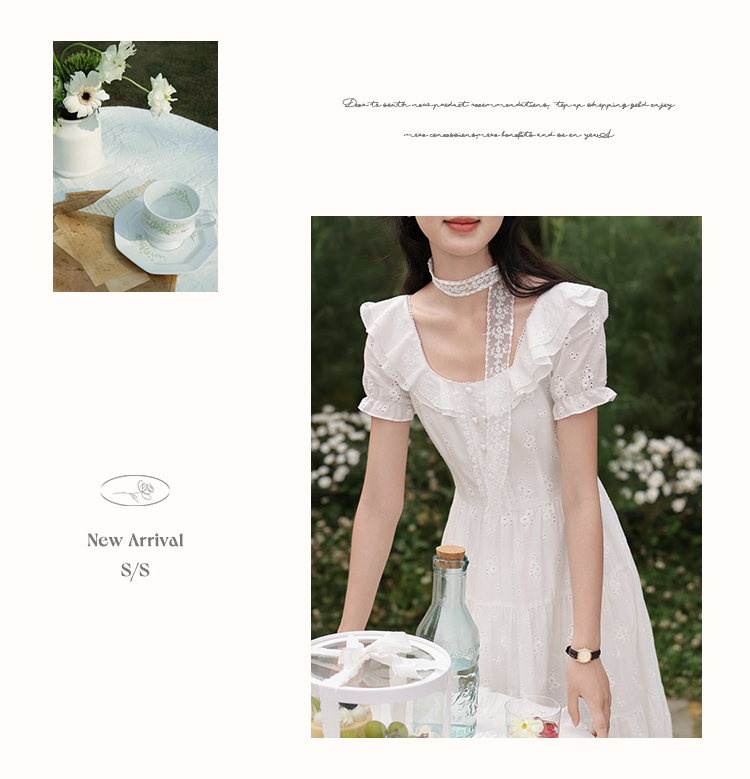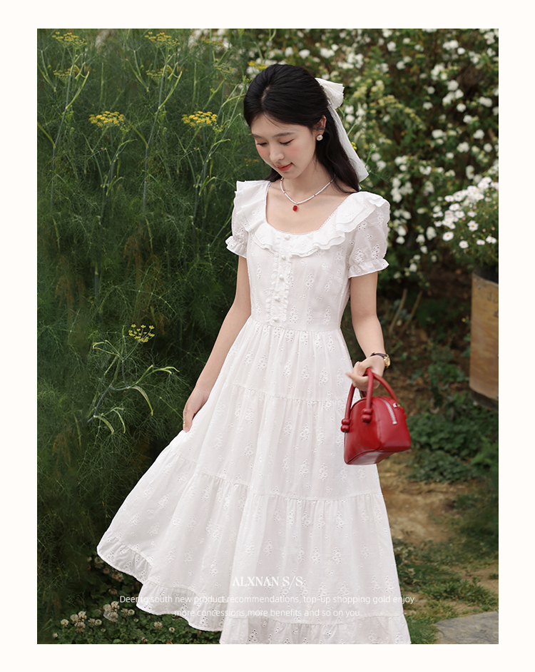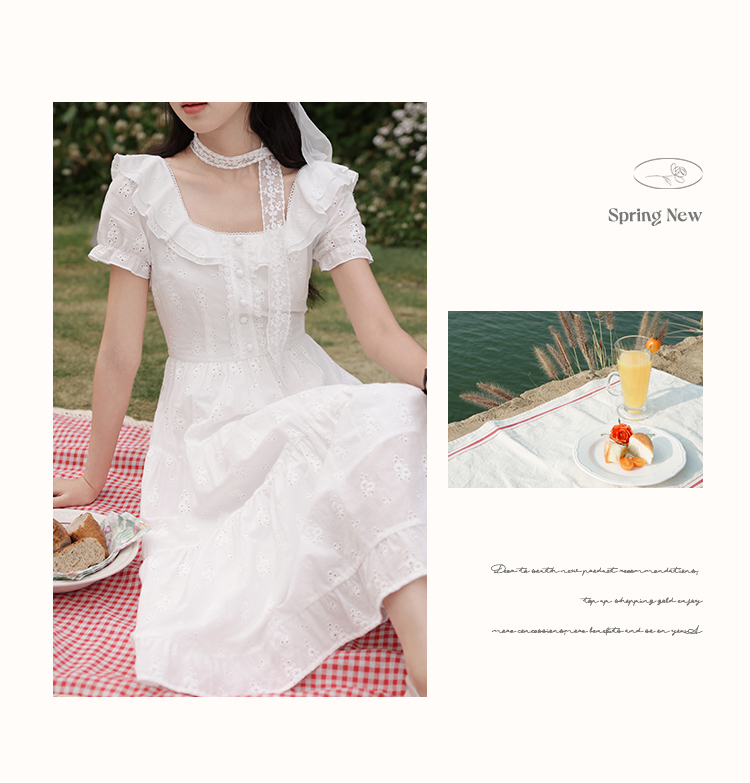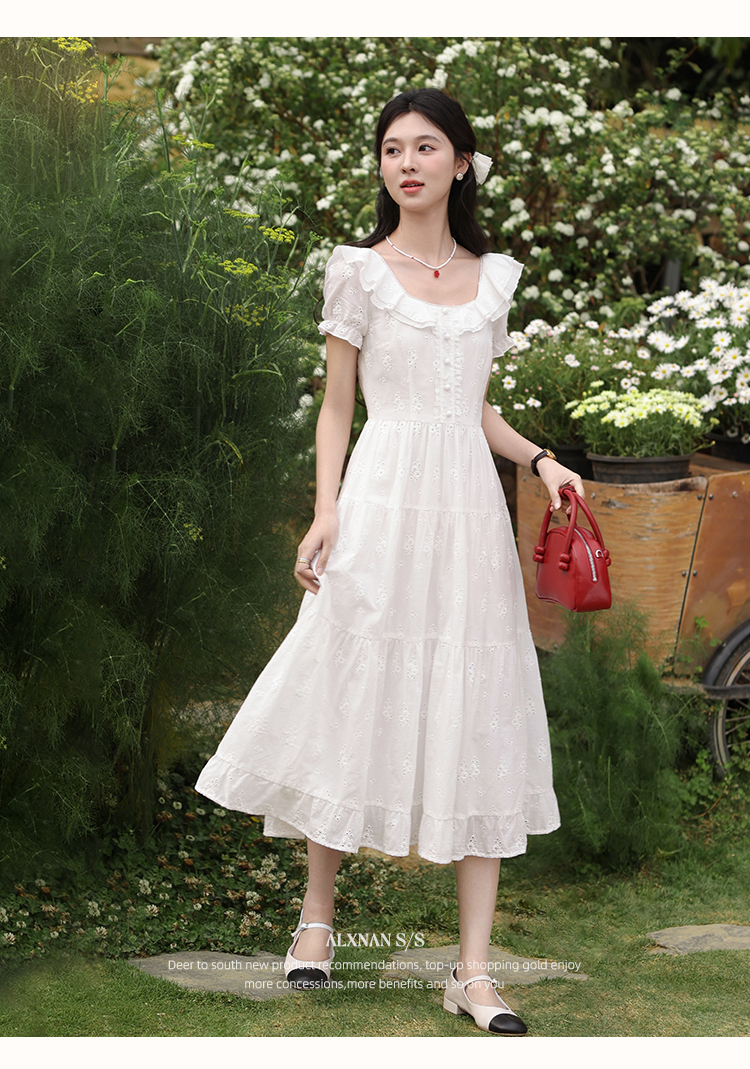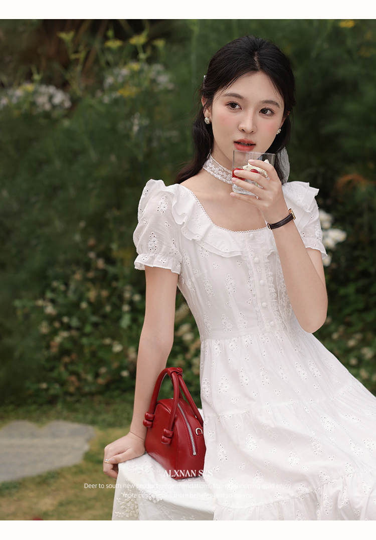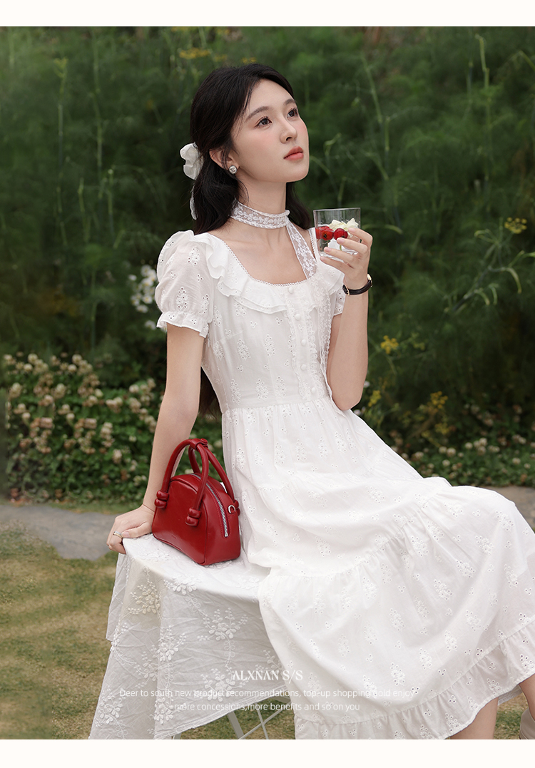 鹿向南「茉莉青茶」米白色方领蕾丝短袖连衣裙夏季新款收腰长裙女