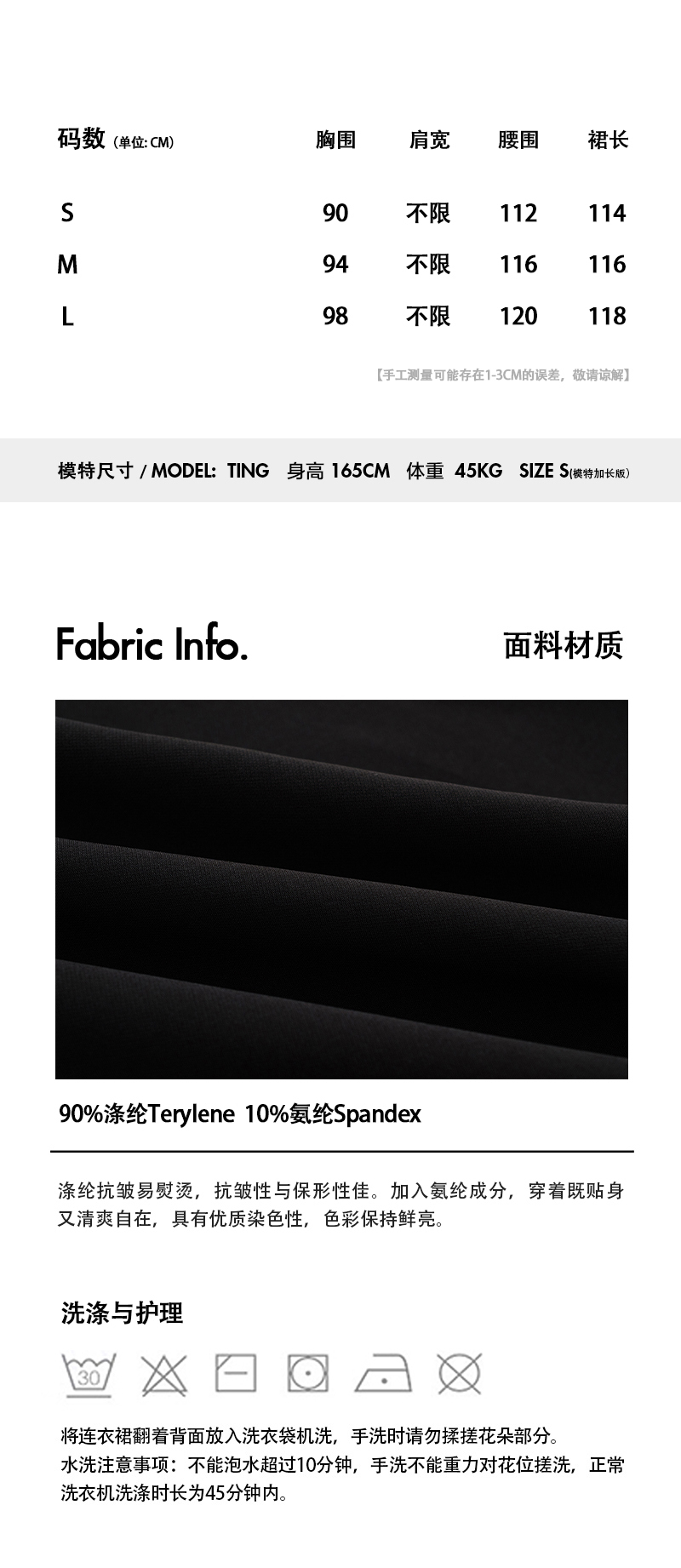 | 廓形: A型 | 材质成分: 聚对苯二甲酸乙二酯(涤纶)90% 聚氨酯弹性纤维(氨纶)10% |
