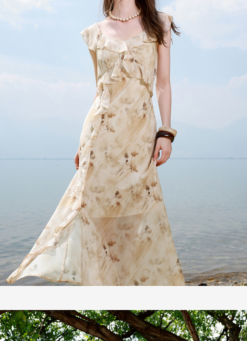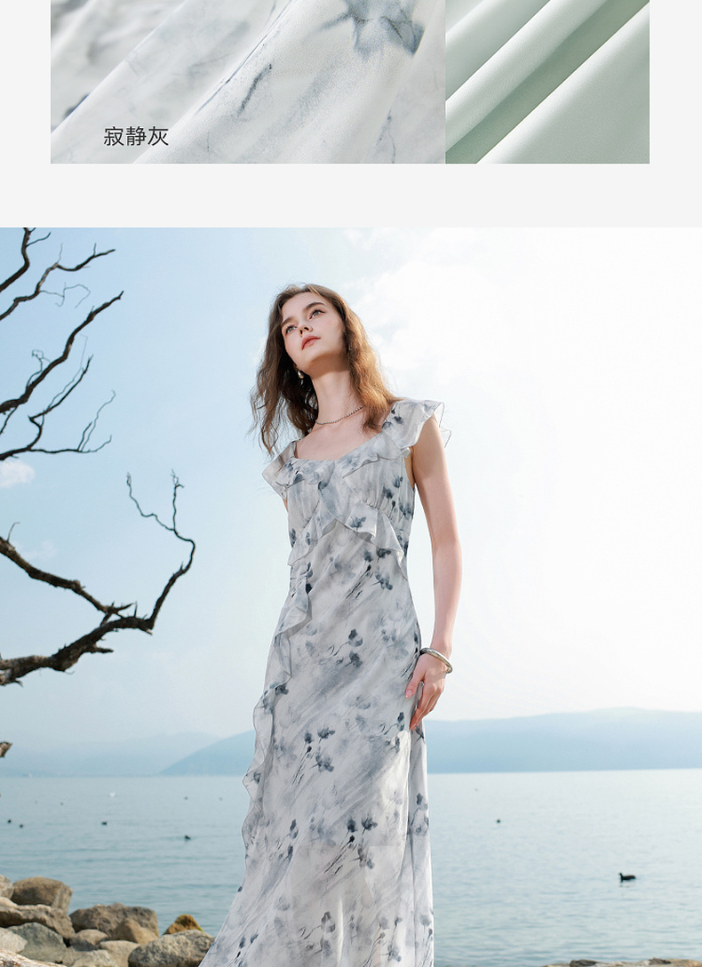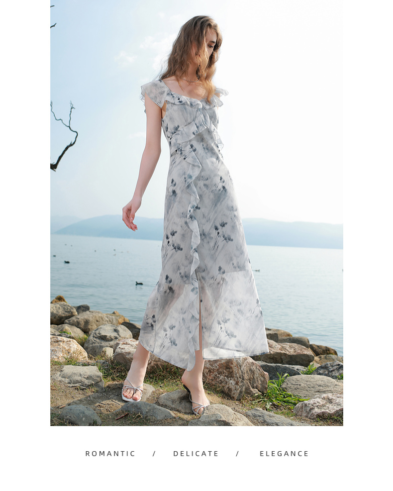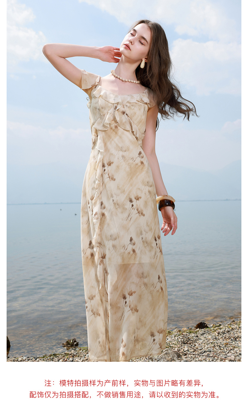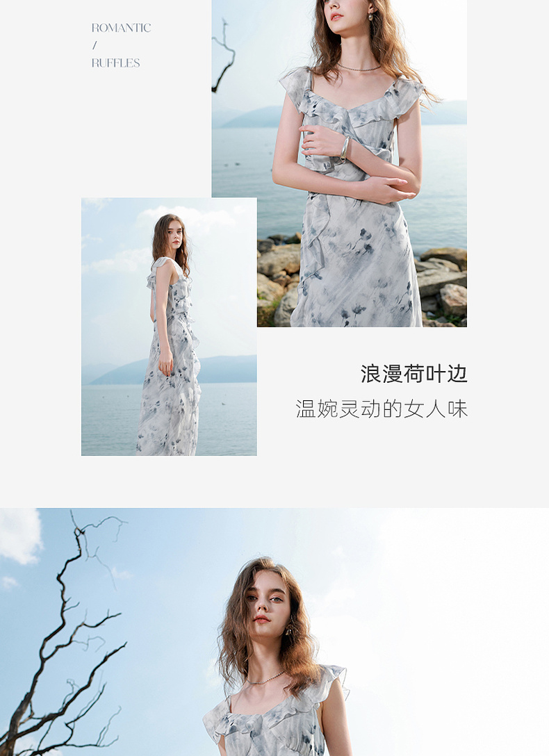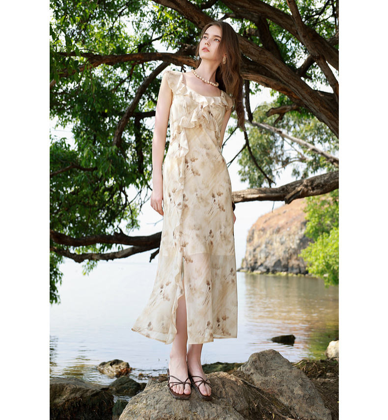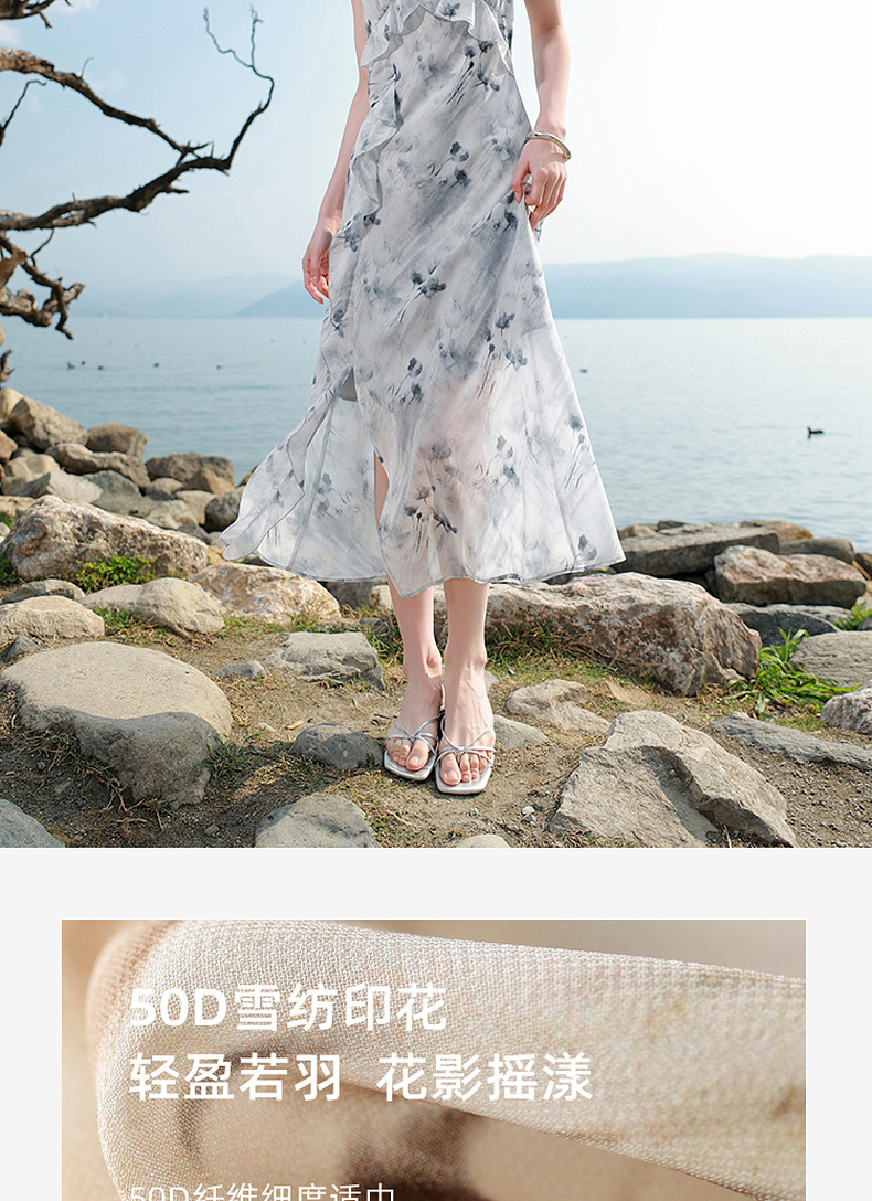 三彩2025夏季新款荷叶边连衣裙法式收腰A字裙鱼尾长裙浪漫M