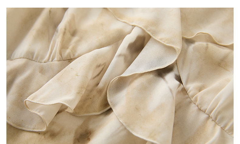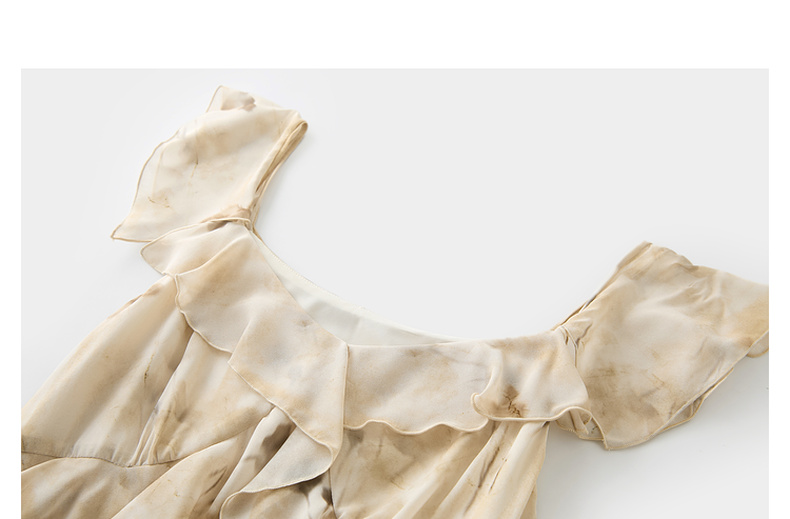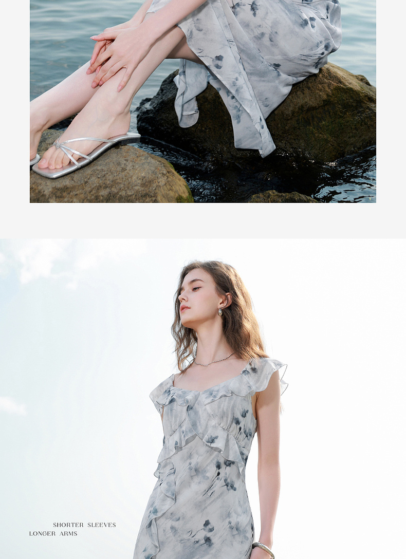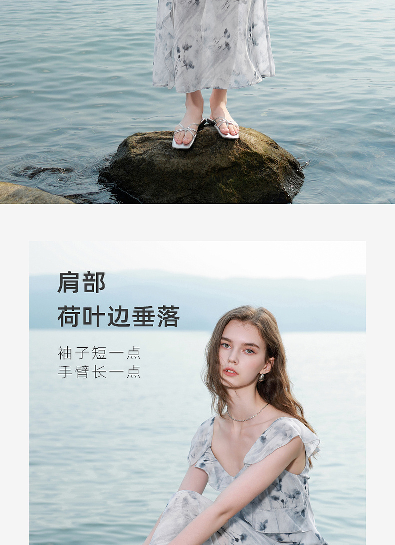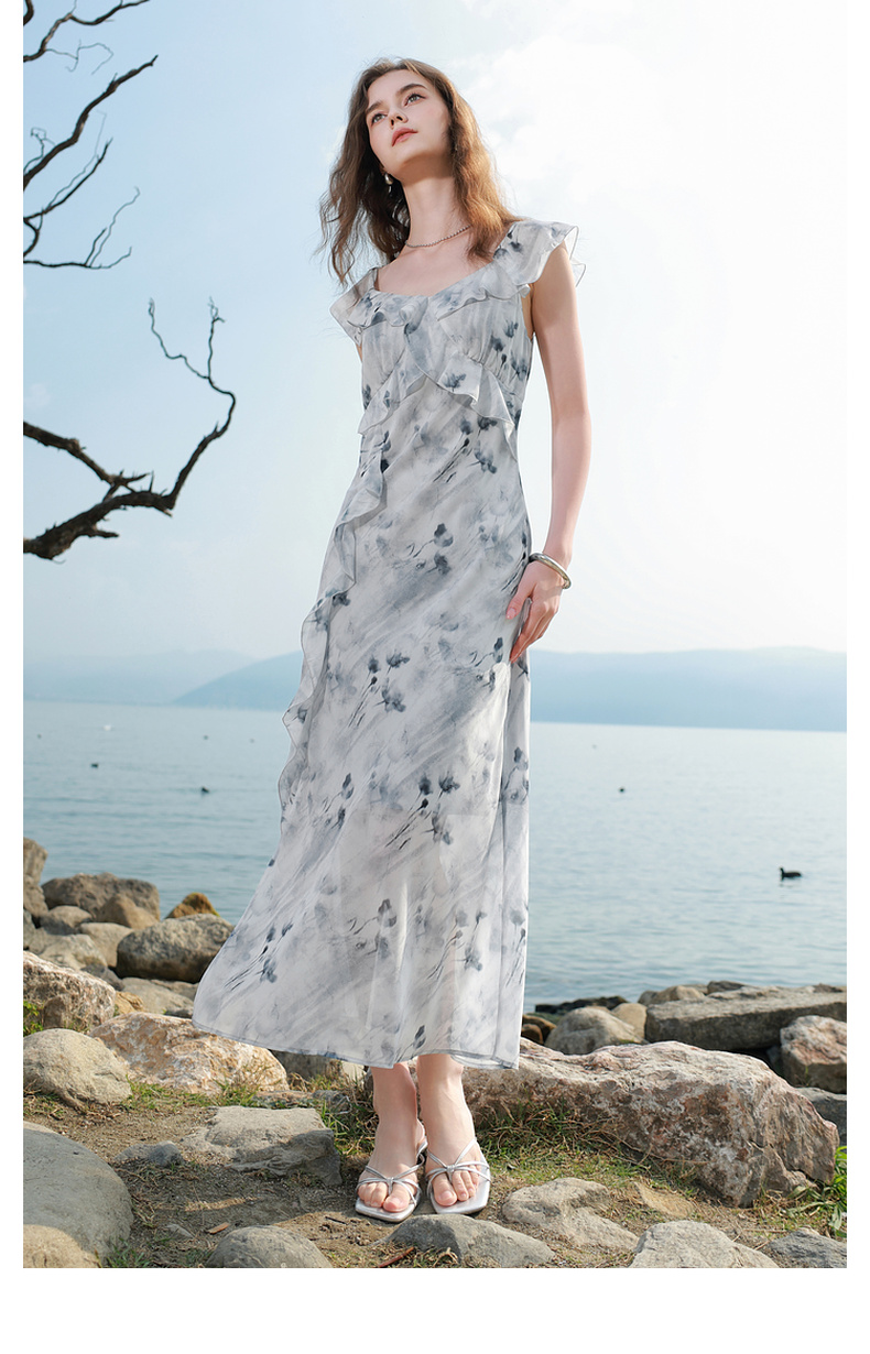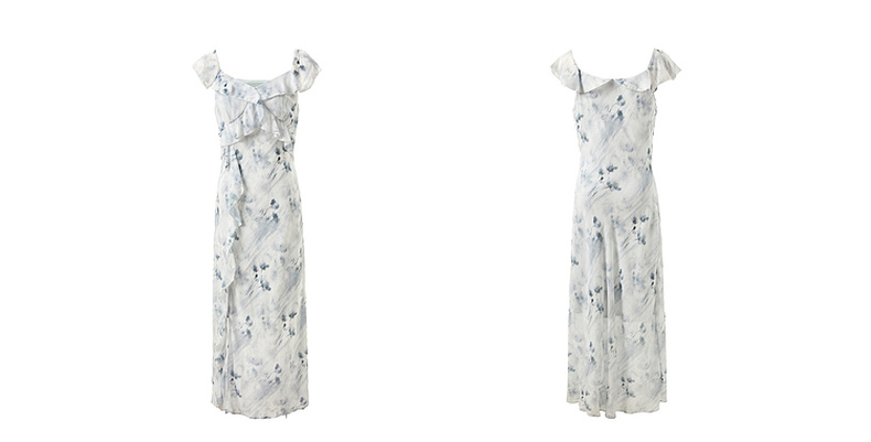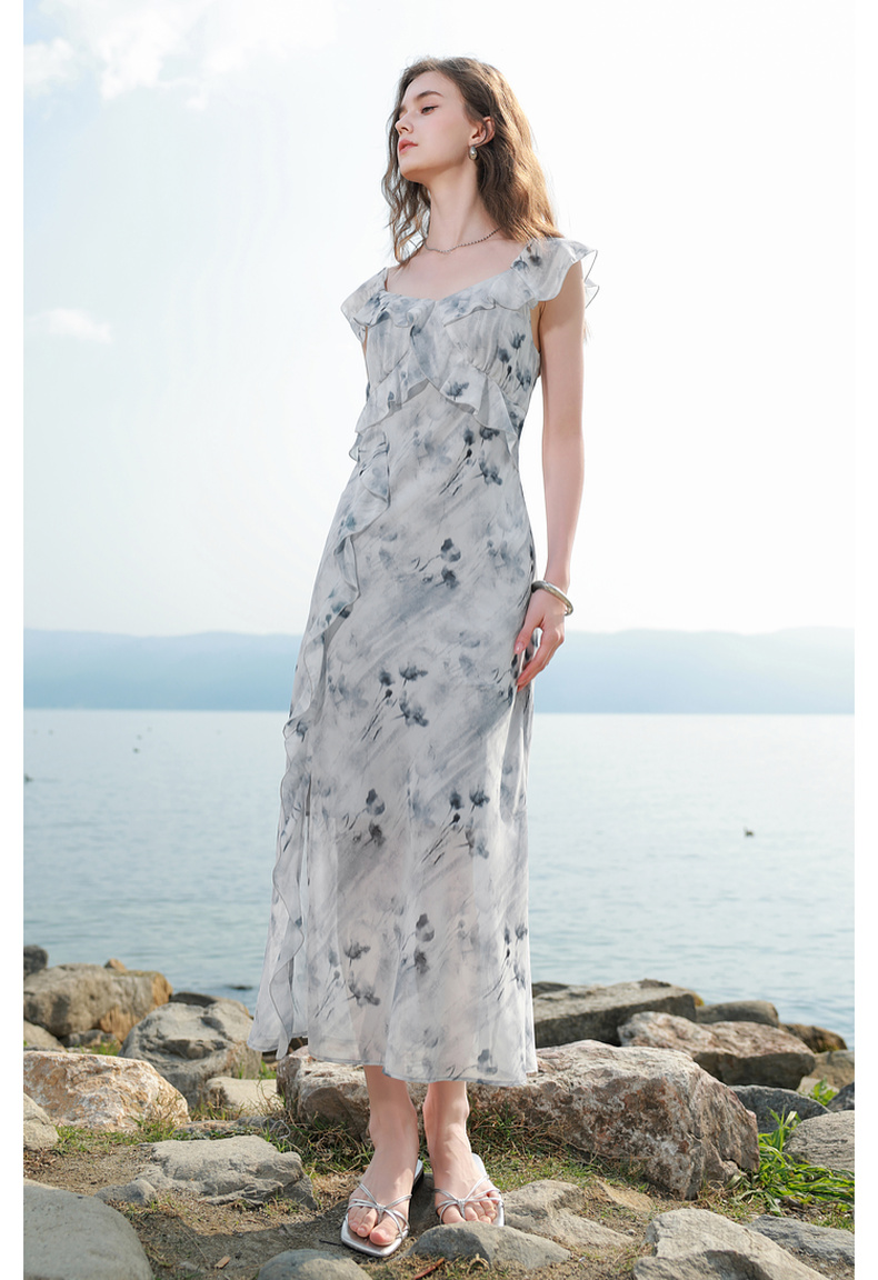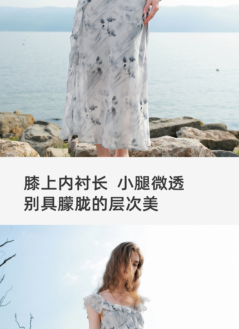三彩2025夏季新款荷叶边连衣裙法式收腰A字裙鱼尾长裙浪漫M