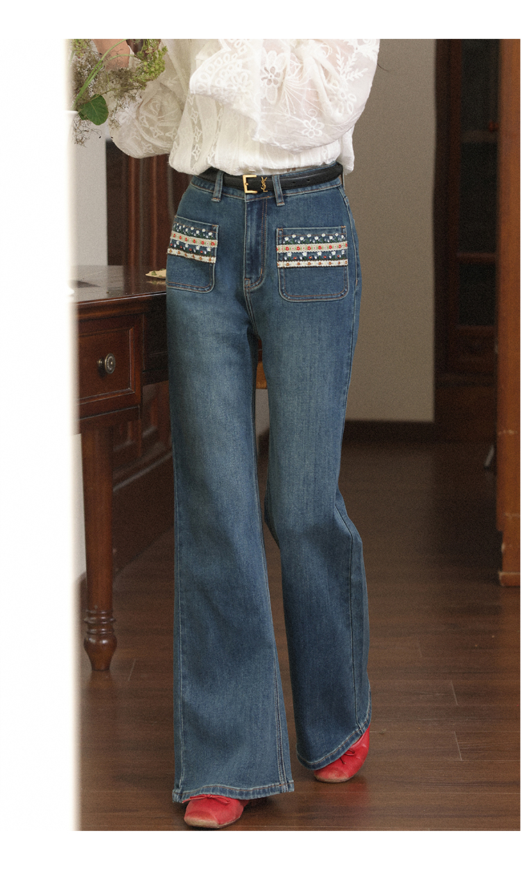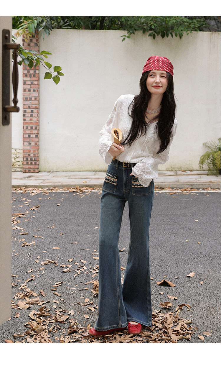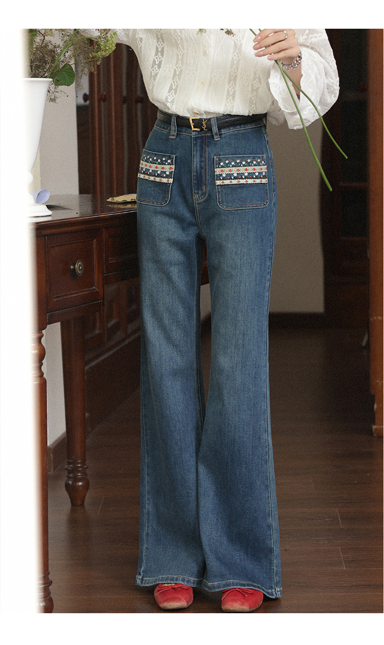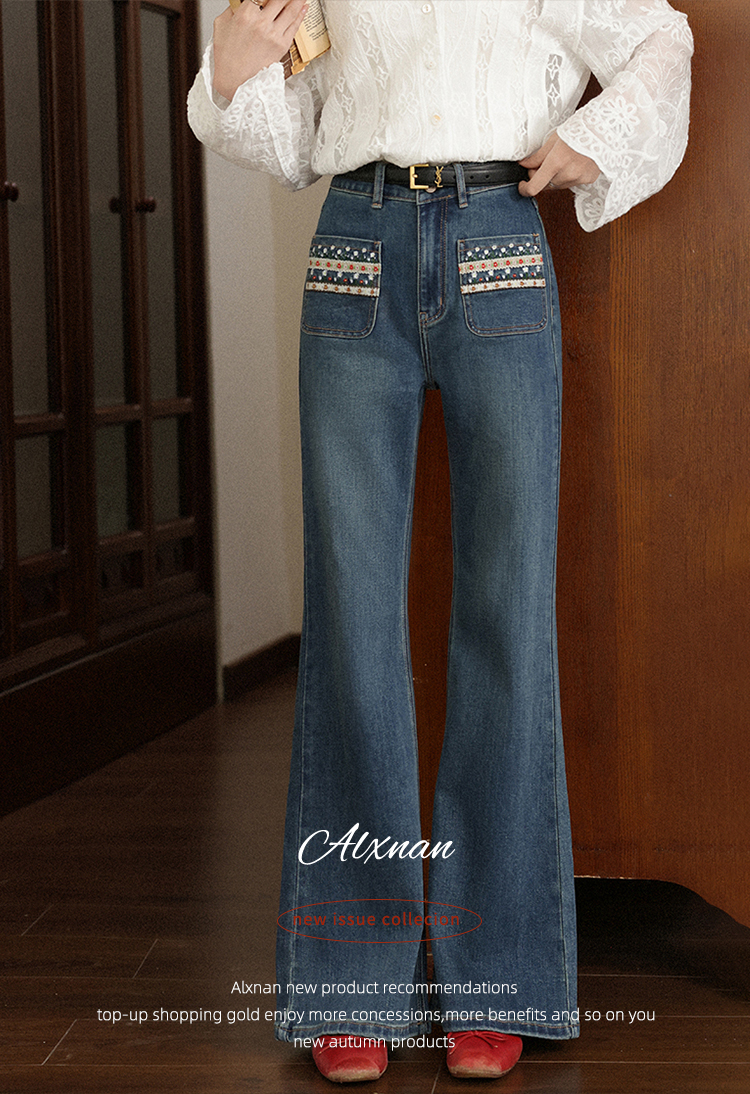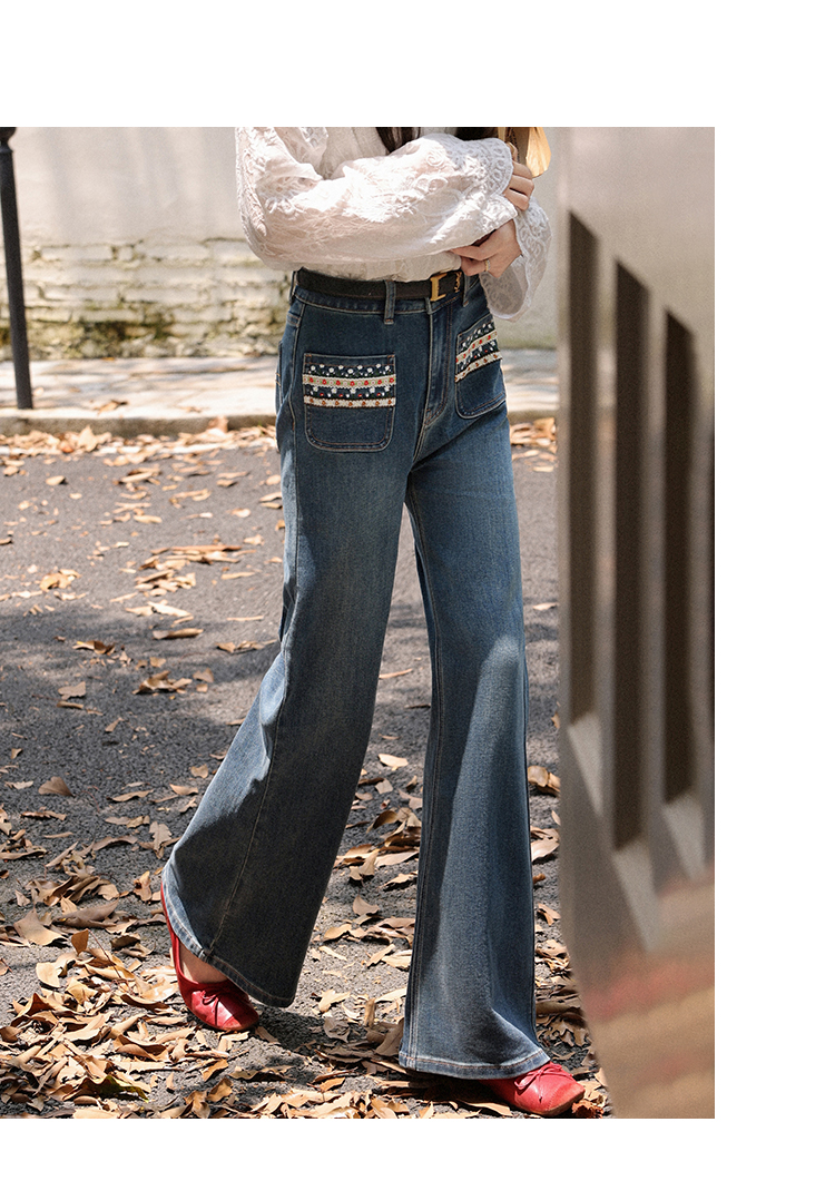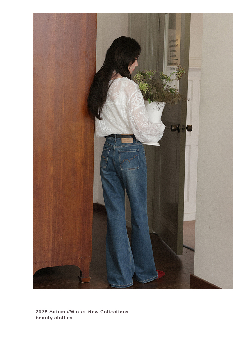 鹿向南「阿莫蓝调」蓝色复古高腰牛仔裤女秋修身显瘦直筒阔腿长裤
