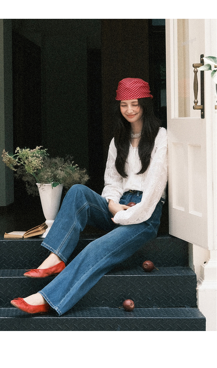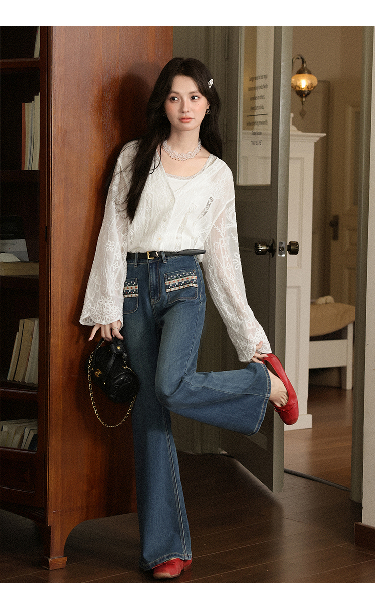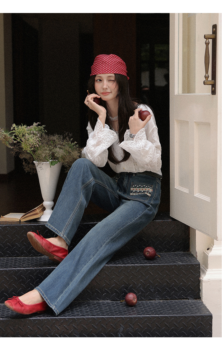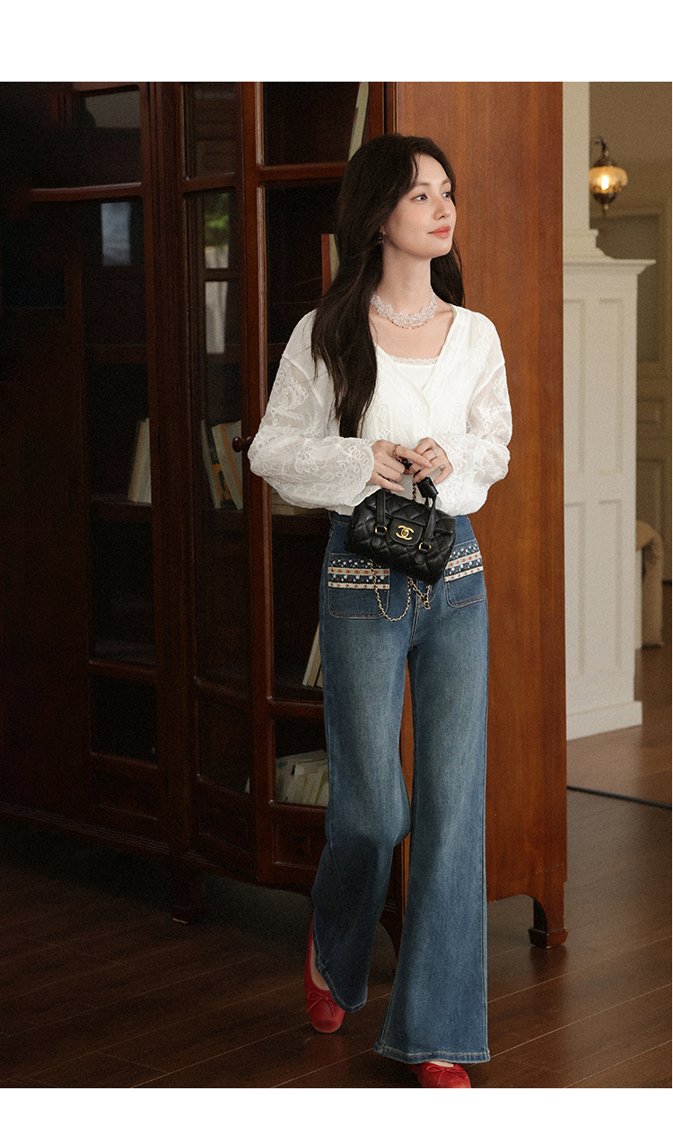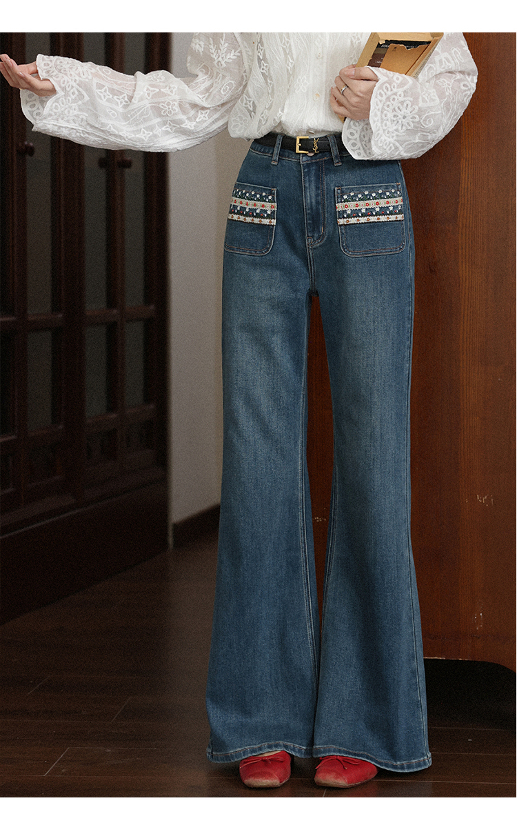 鹿向南「阿莫蓝调」蓝色复古高腰牛仔裤女秋修身显瘦直筒阔腿长裤