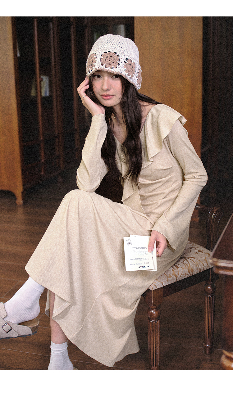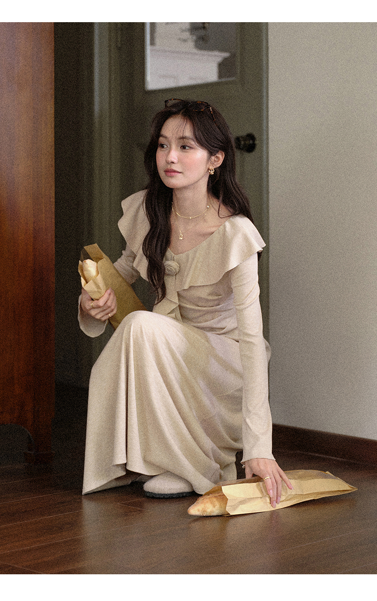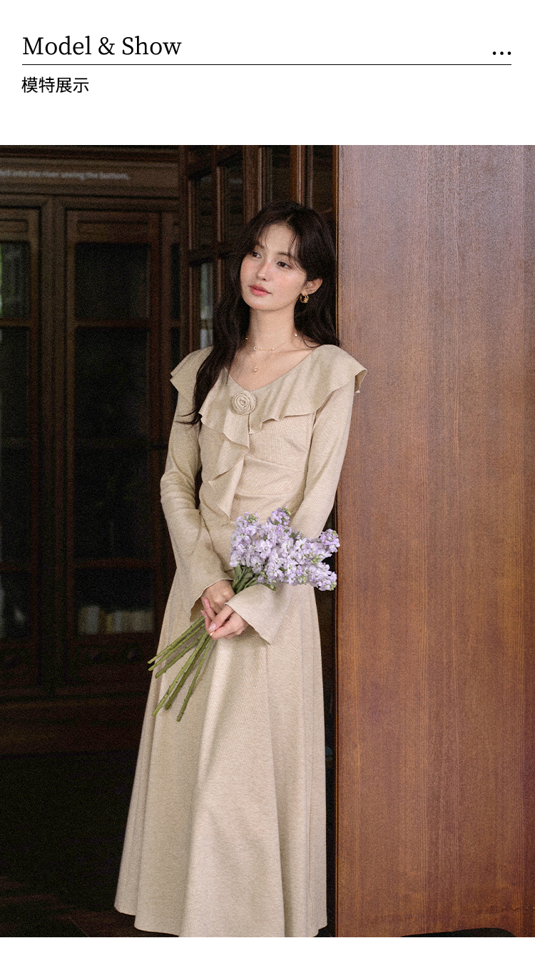 鹿向南「初秋兮痕」燕麦色法式长袖连衣裙秋季新款设计感长款裙子