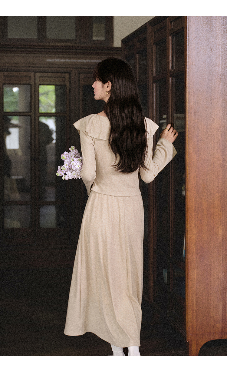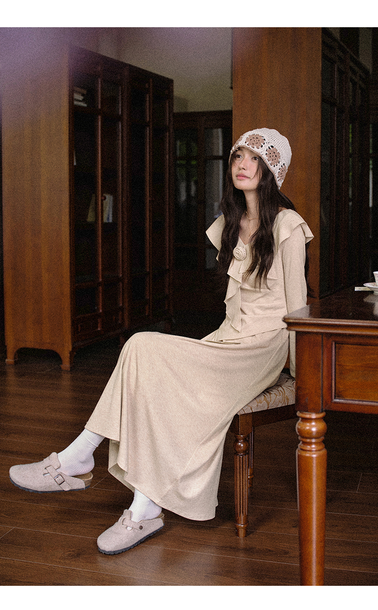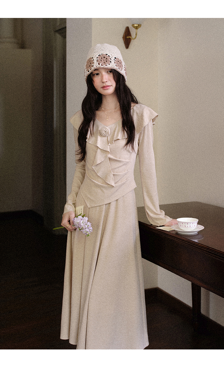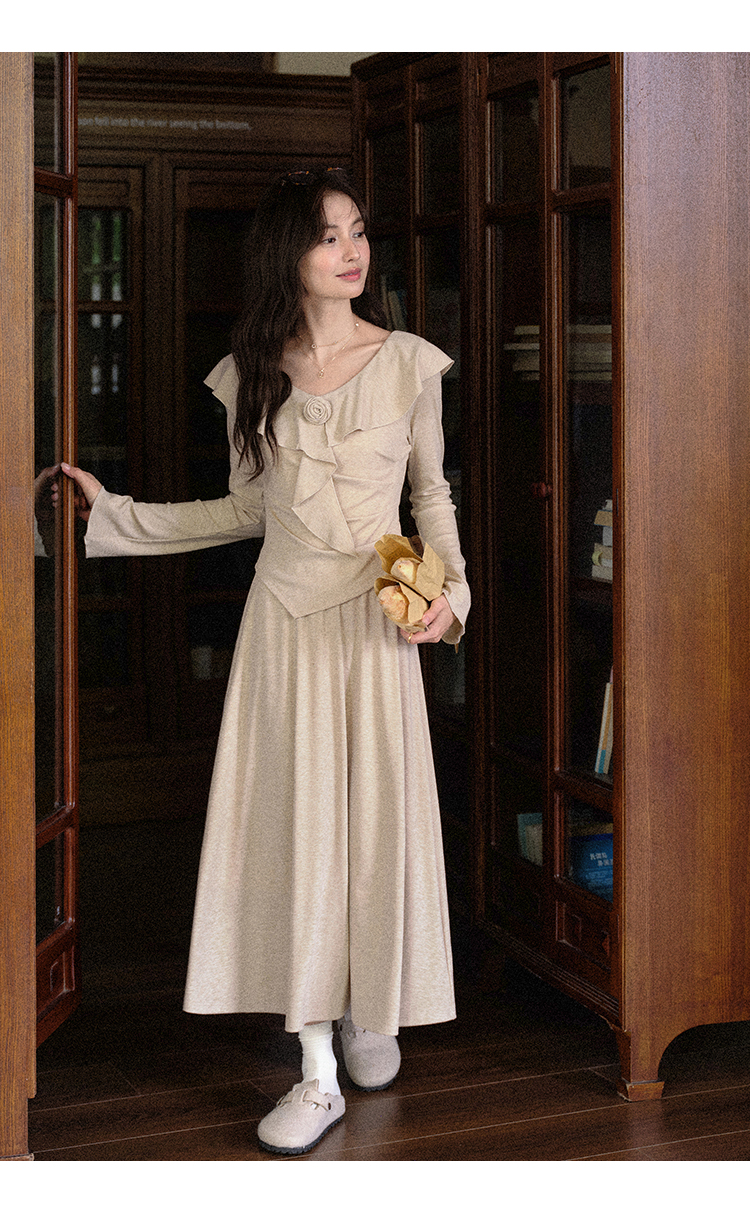 鹿向南「初秋兮痕」燕麦色法式长袖连衣裙秋季新款设计感长款裙子