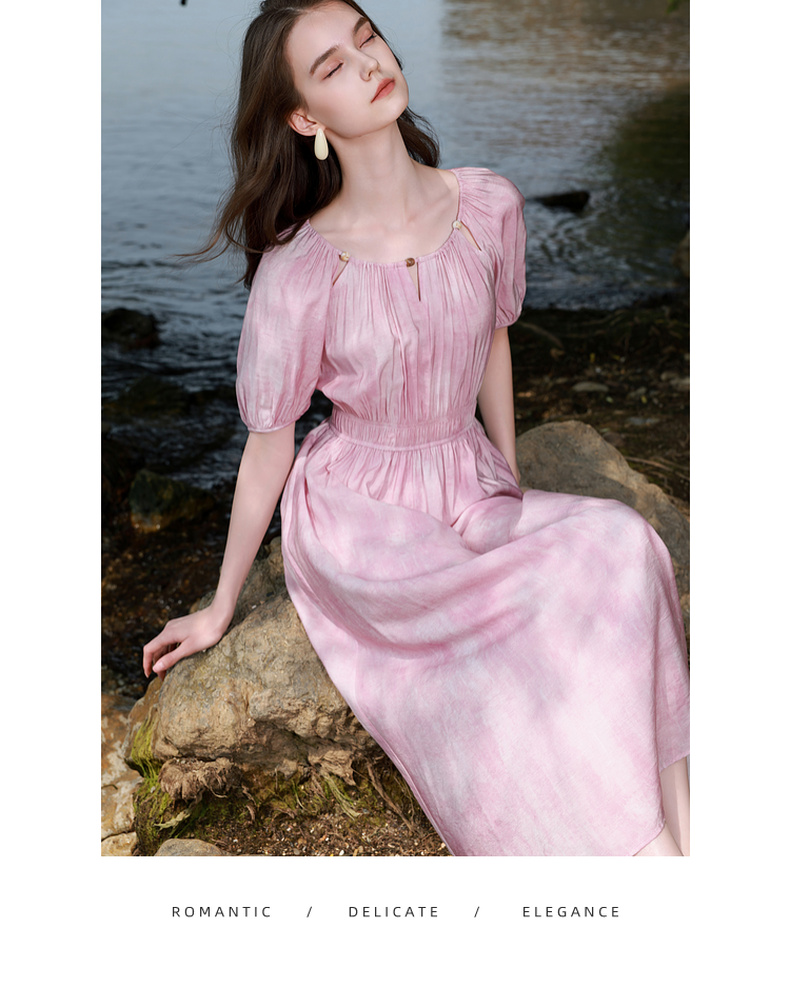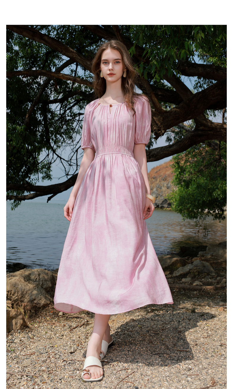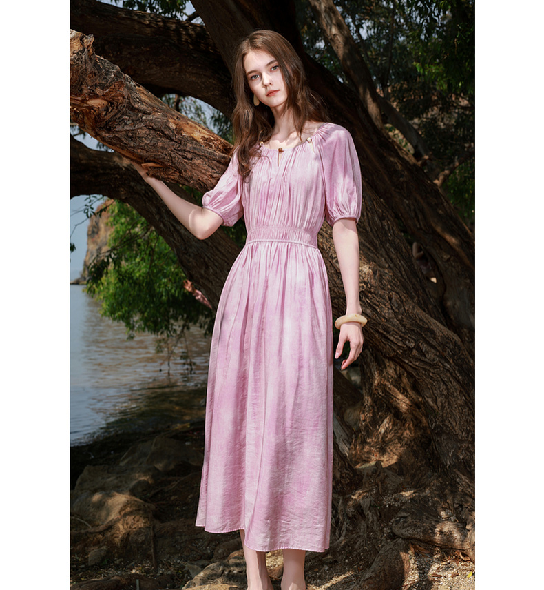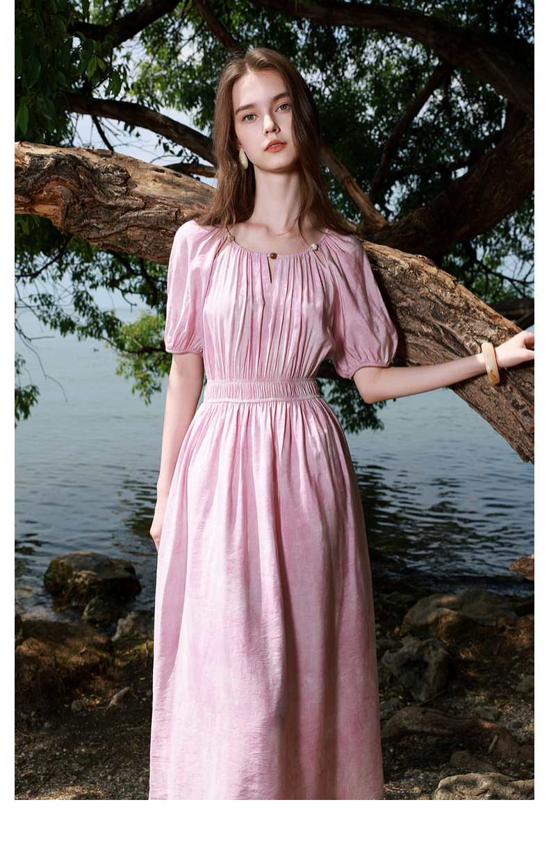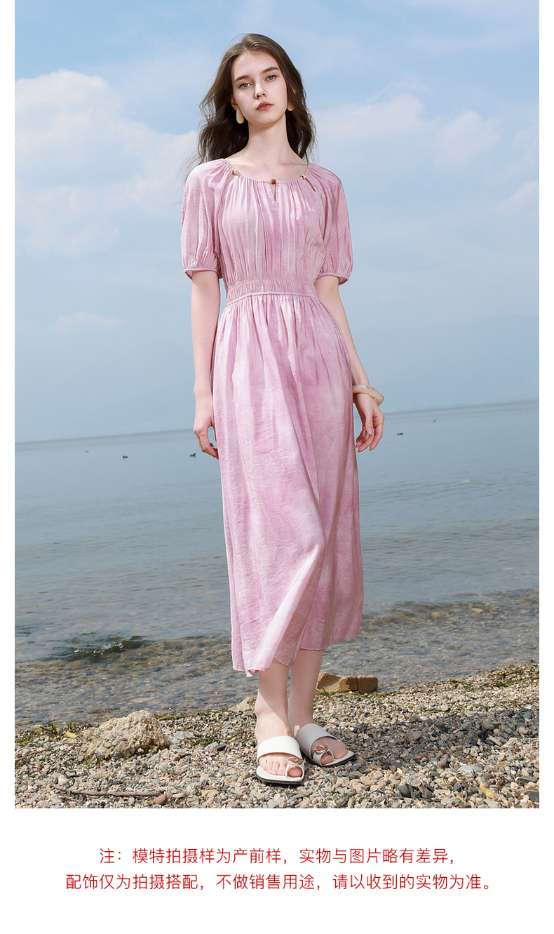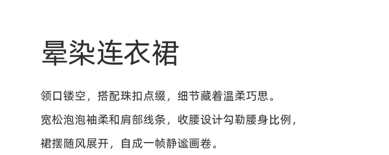 三彩2025夏季新款晕染连衣裙圆领镂空收腰A字裙灯笼袖长裙M