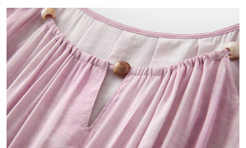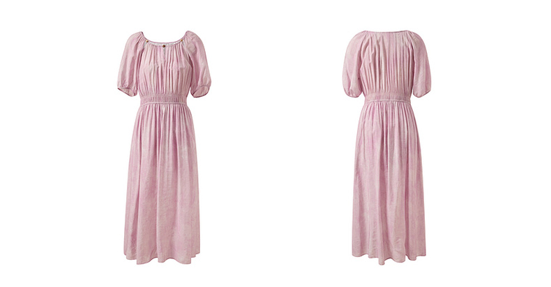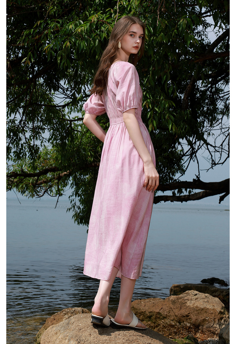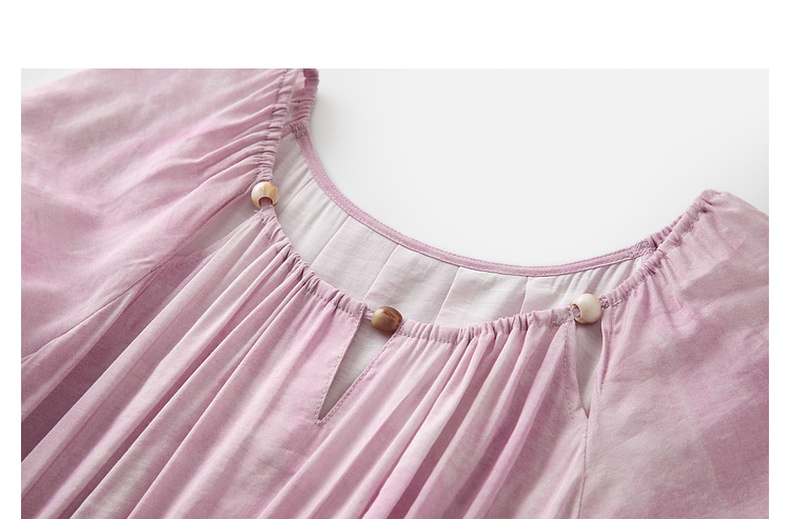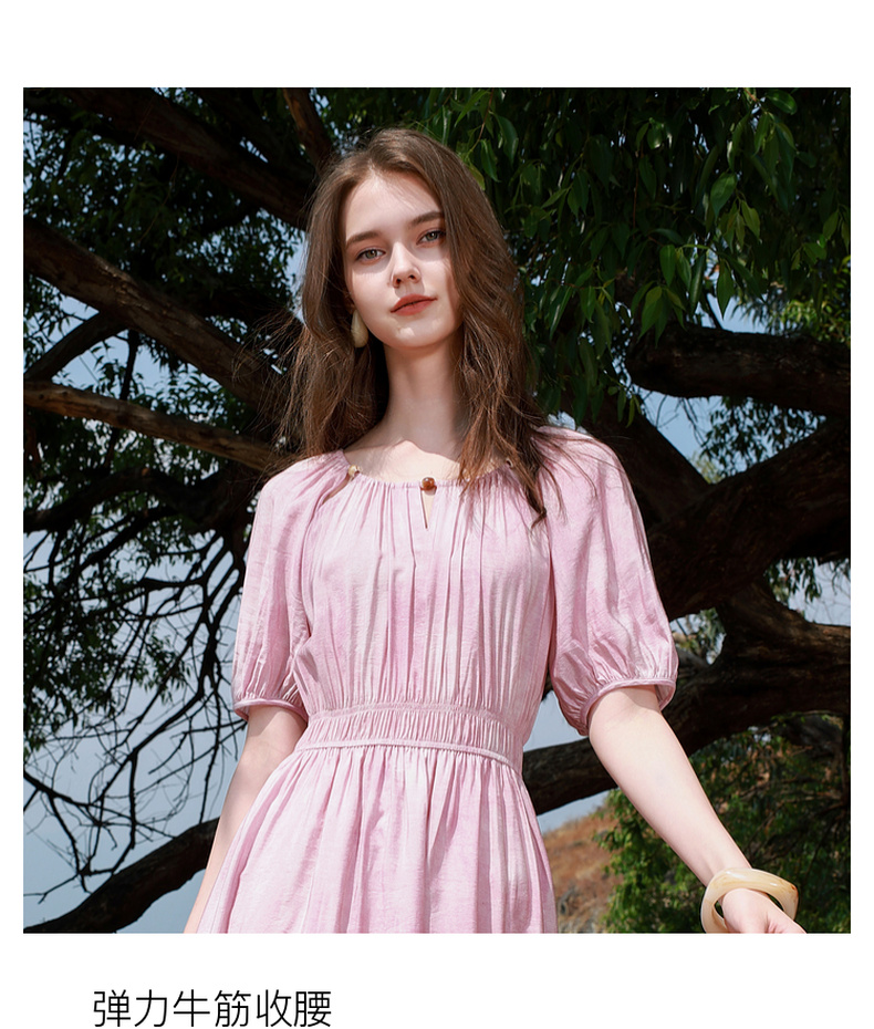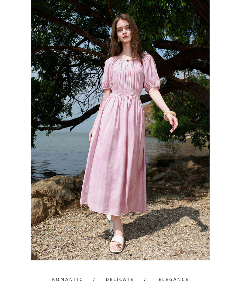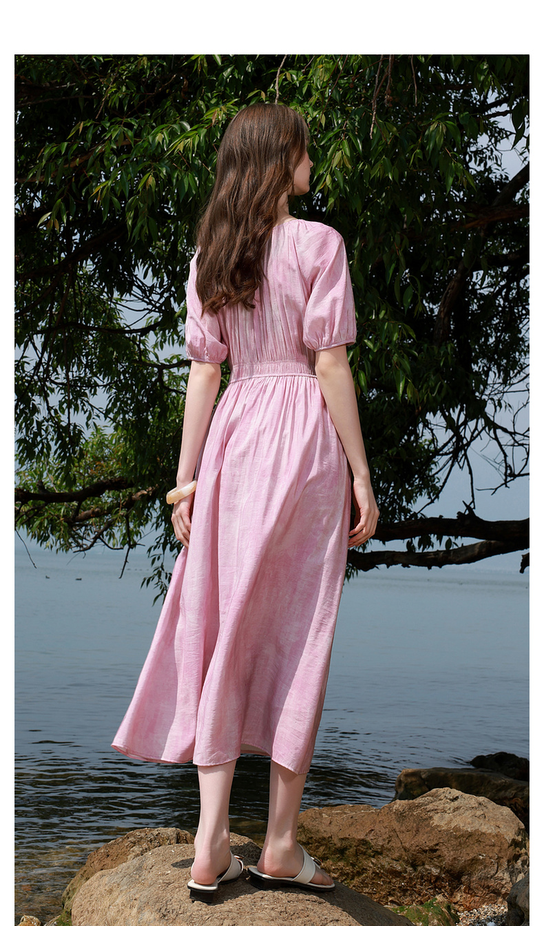 三彩2025夏季新款晕染连衣裙圆领镂空收腰A字裙灯笼袖长裙M