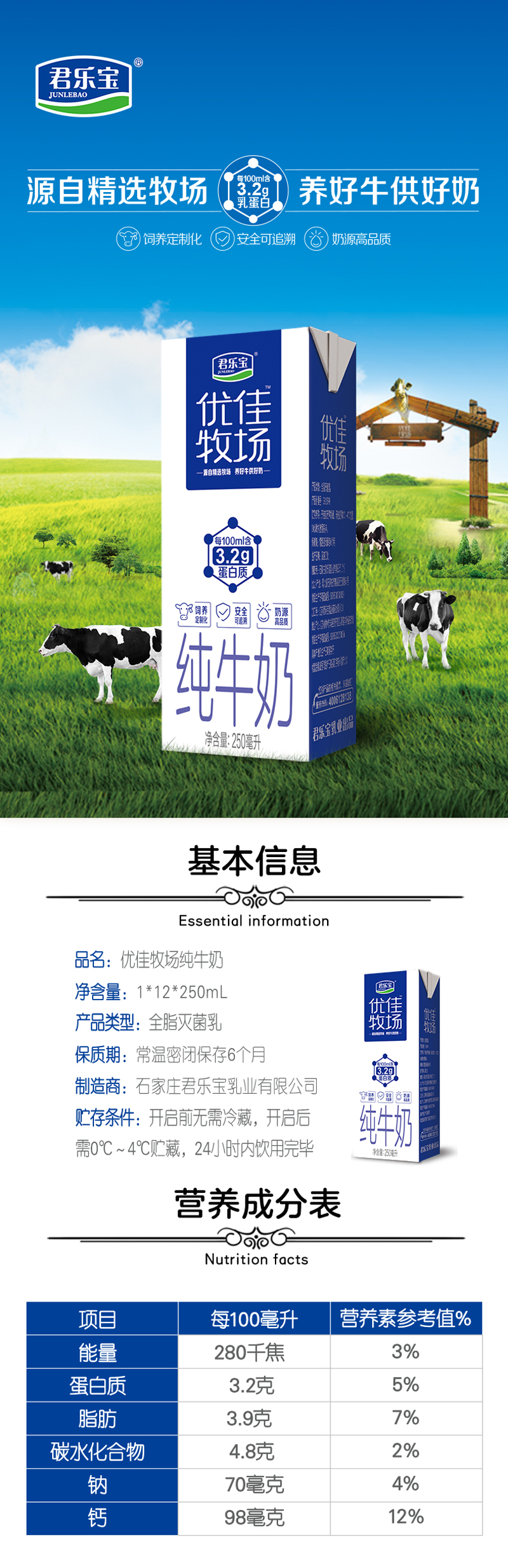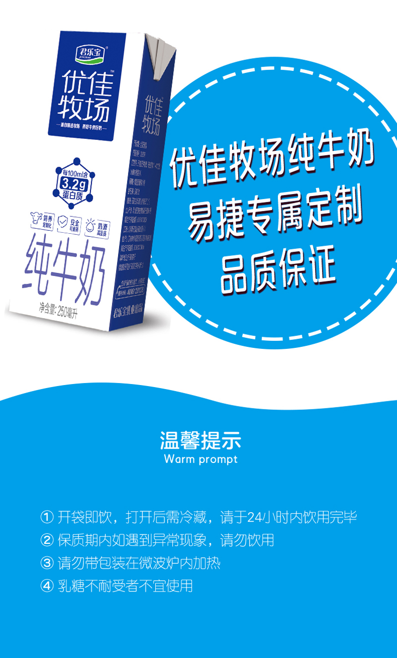 君乐宝优佳牧场纯牛奶250ml*12盒整箱装牛奶营养早餐奶3.2克蛋白 优佳牧场250ml*12盒