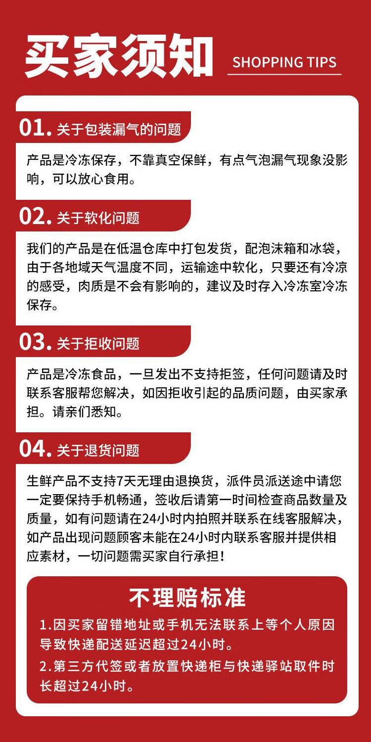 二、售后条件:不接受七天无理由,不接受拒收。个人口感喜好不在售后范围内,有质量问题签收4小时内拍照发给客服。