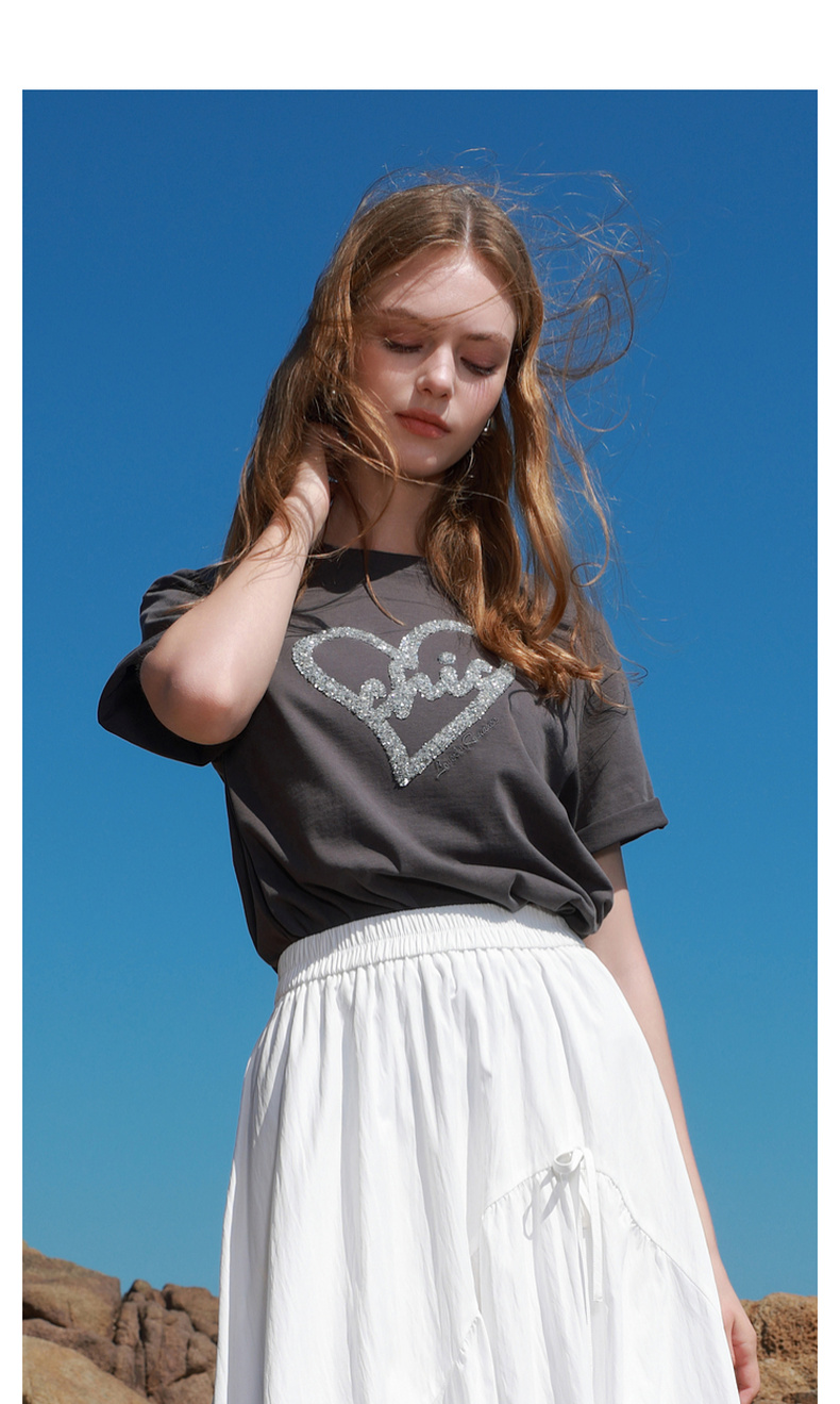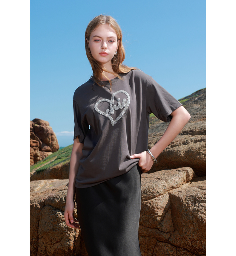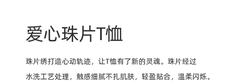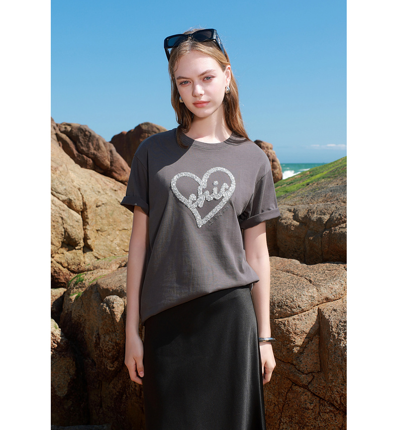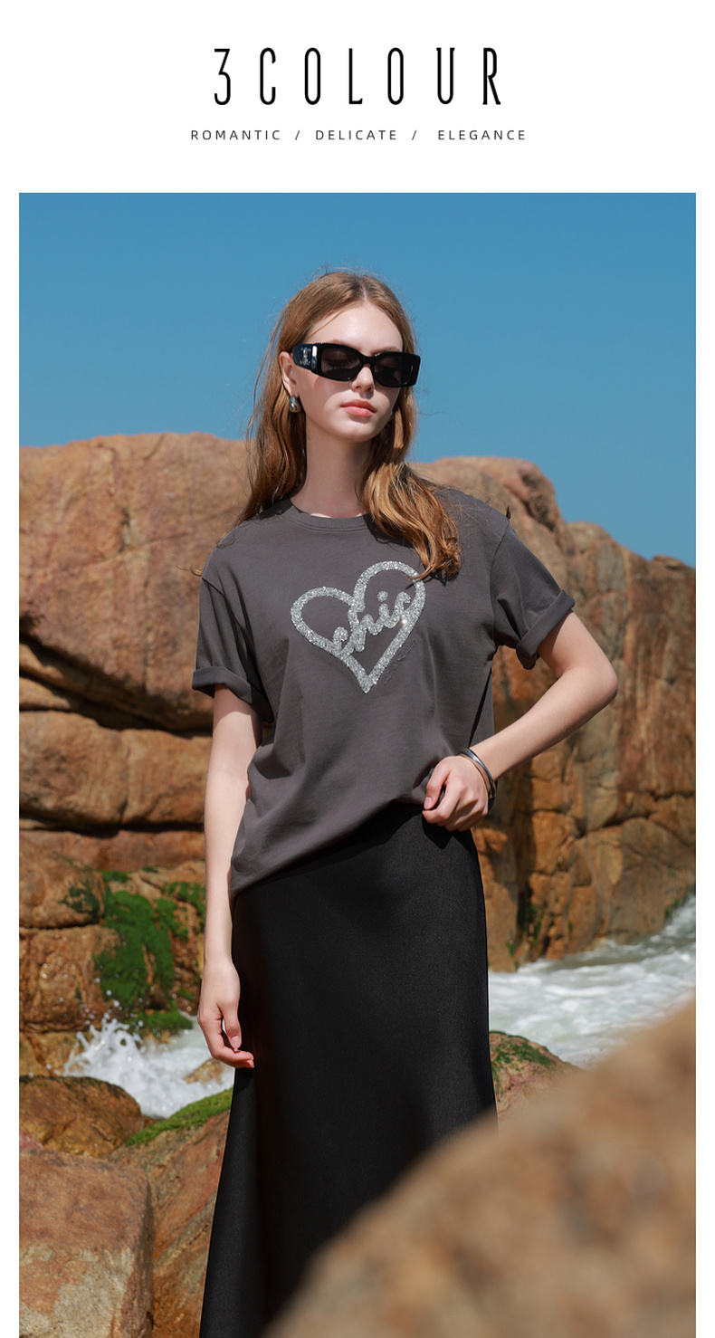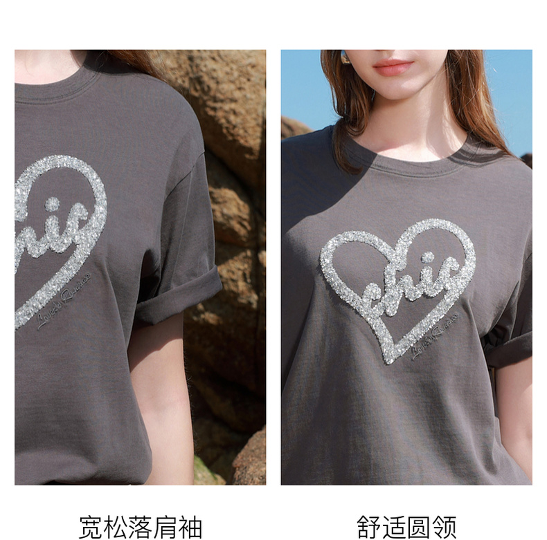 三彩2025夏季新款爱心珠片T恤圆领落肩袖宽松上衣新疆长绒棉M
