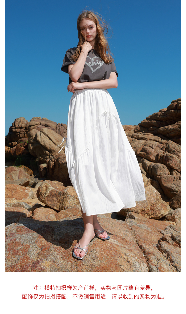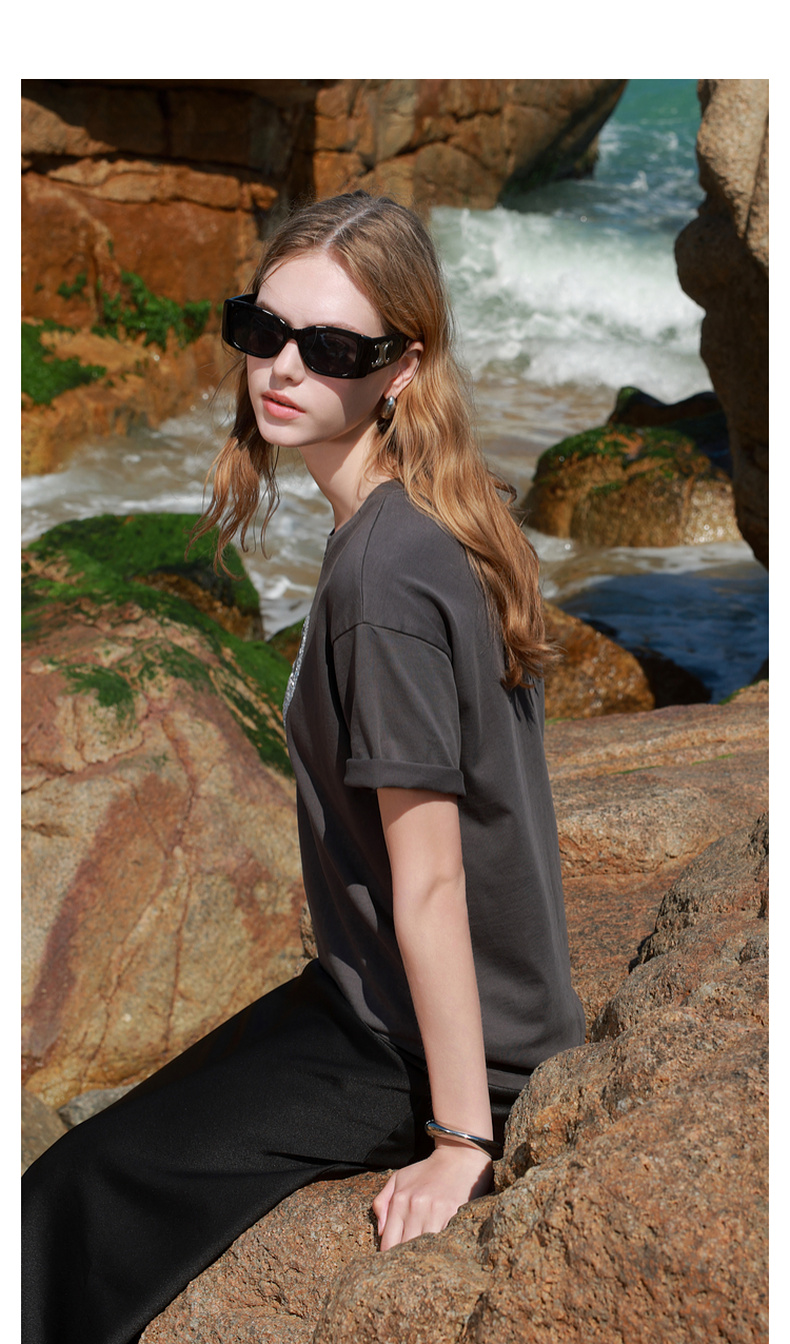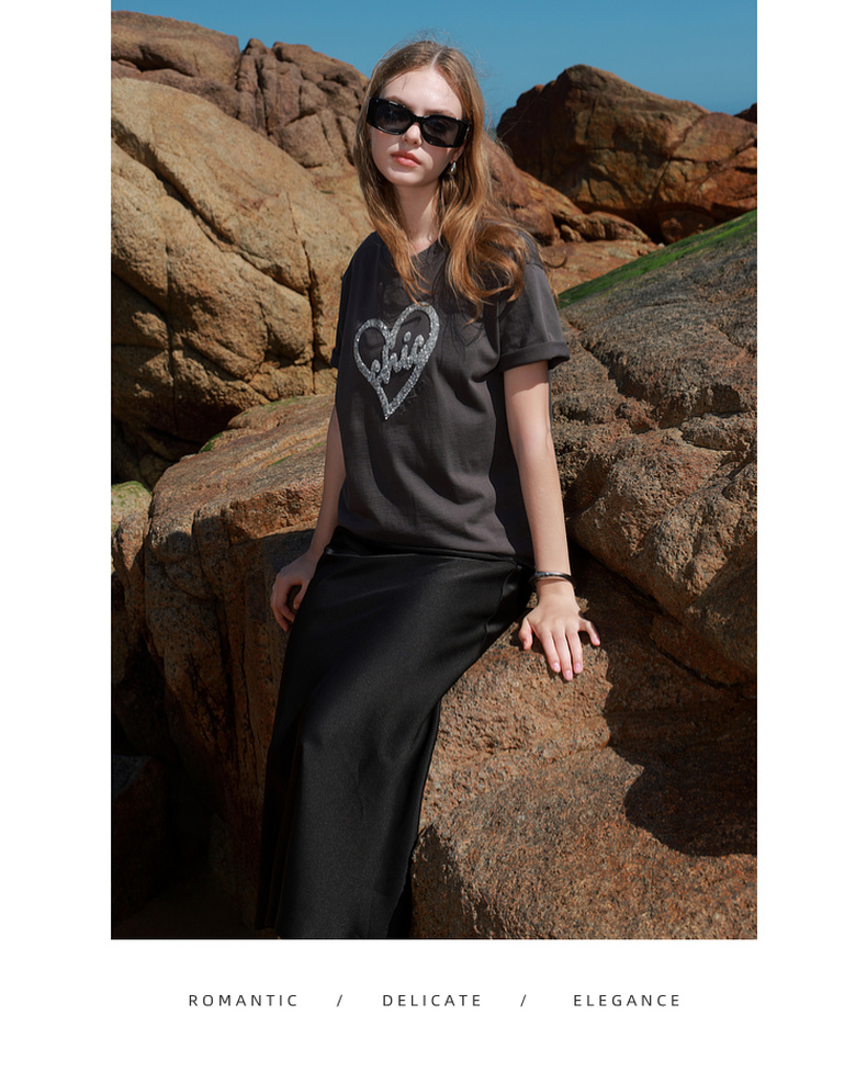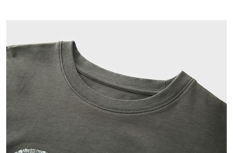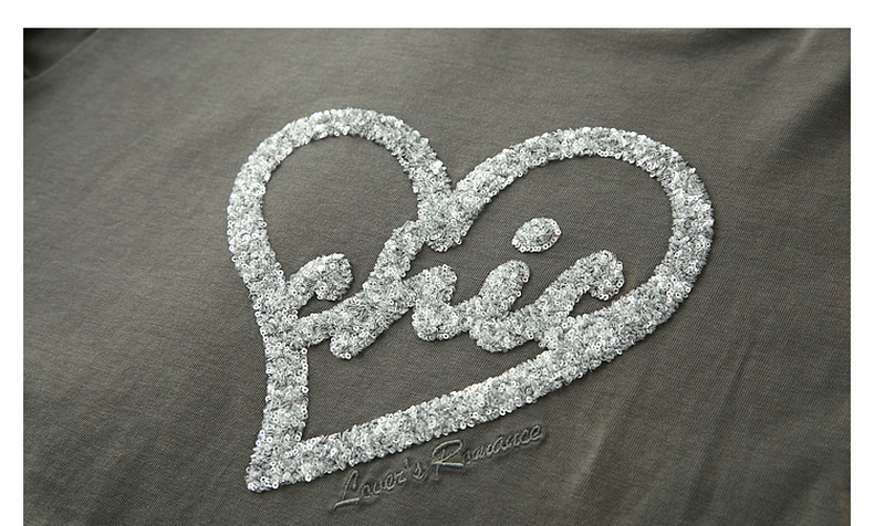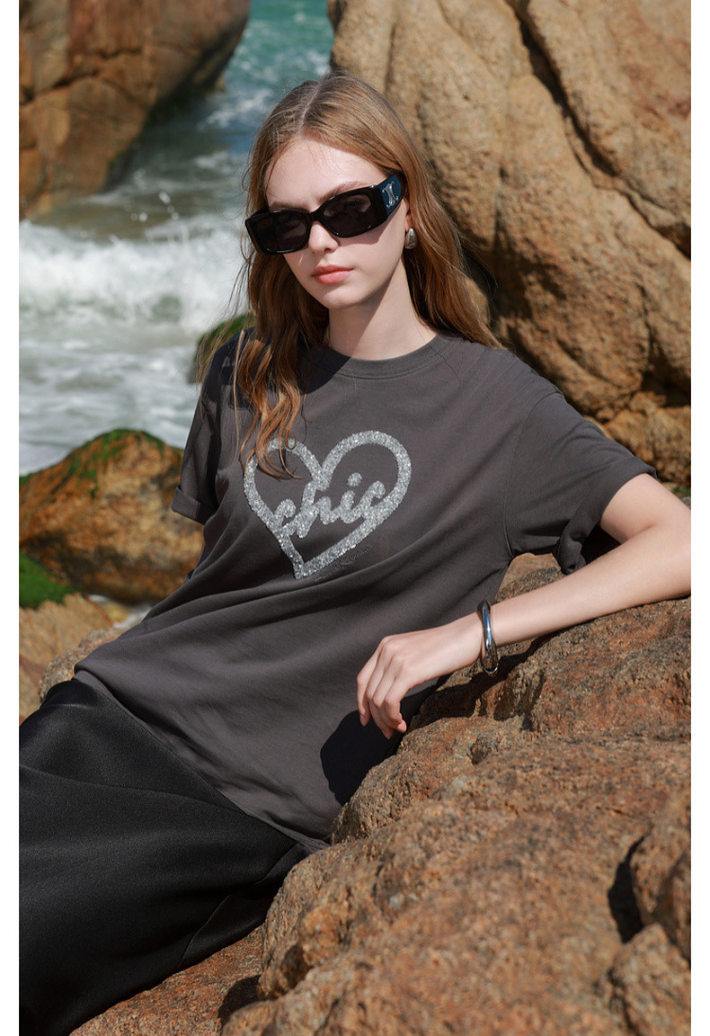 三彩2025夏季新款爱心珠片T恤圆领落肩袖宽松上衣新疆长绒棉M