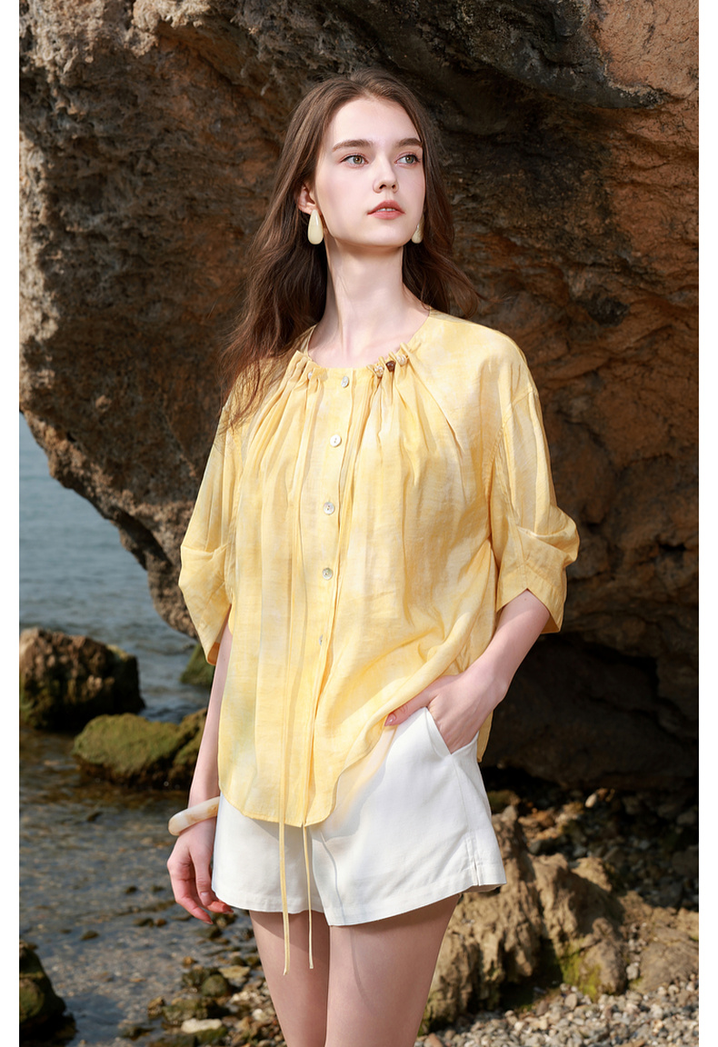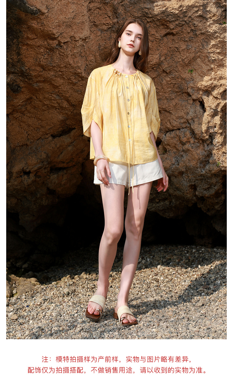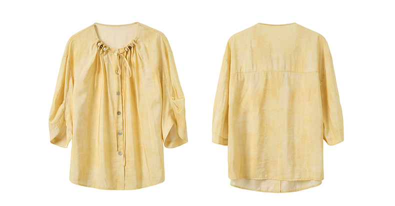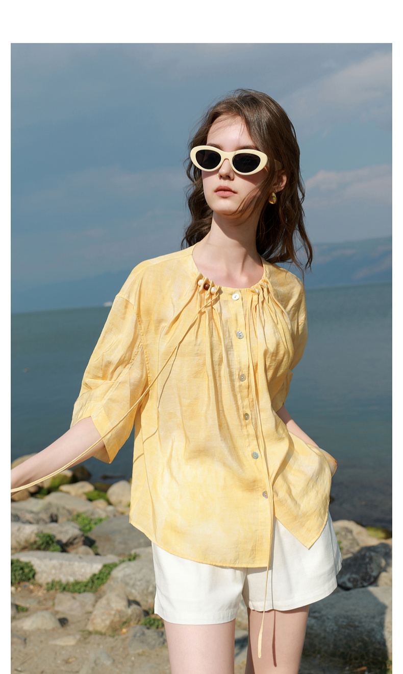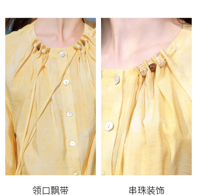 三彩2025秋季新款晕染衬衫圆领串珠飘带小衫七分袖宽松氛围感M