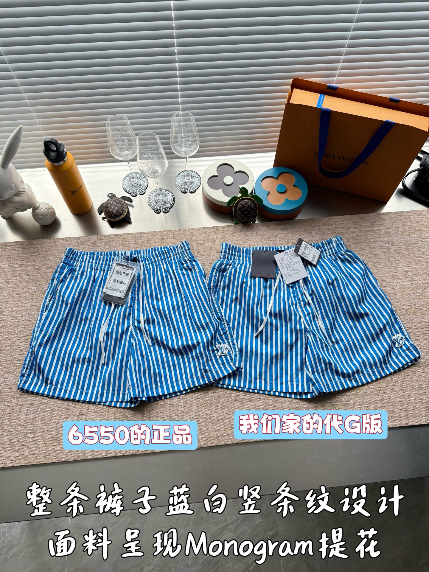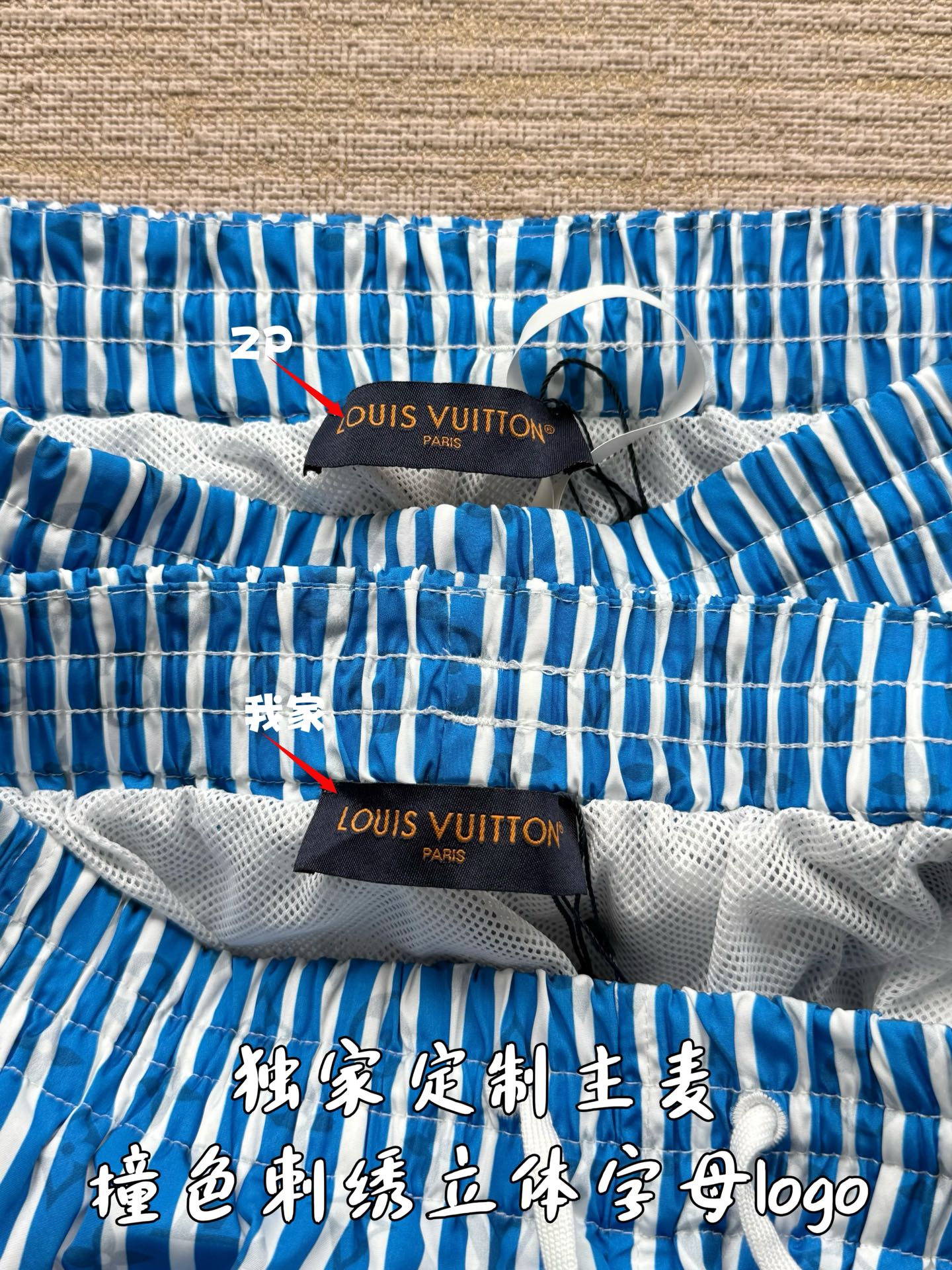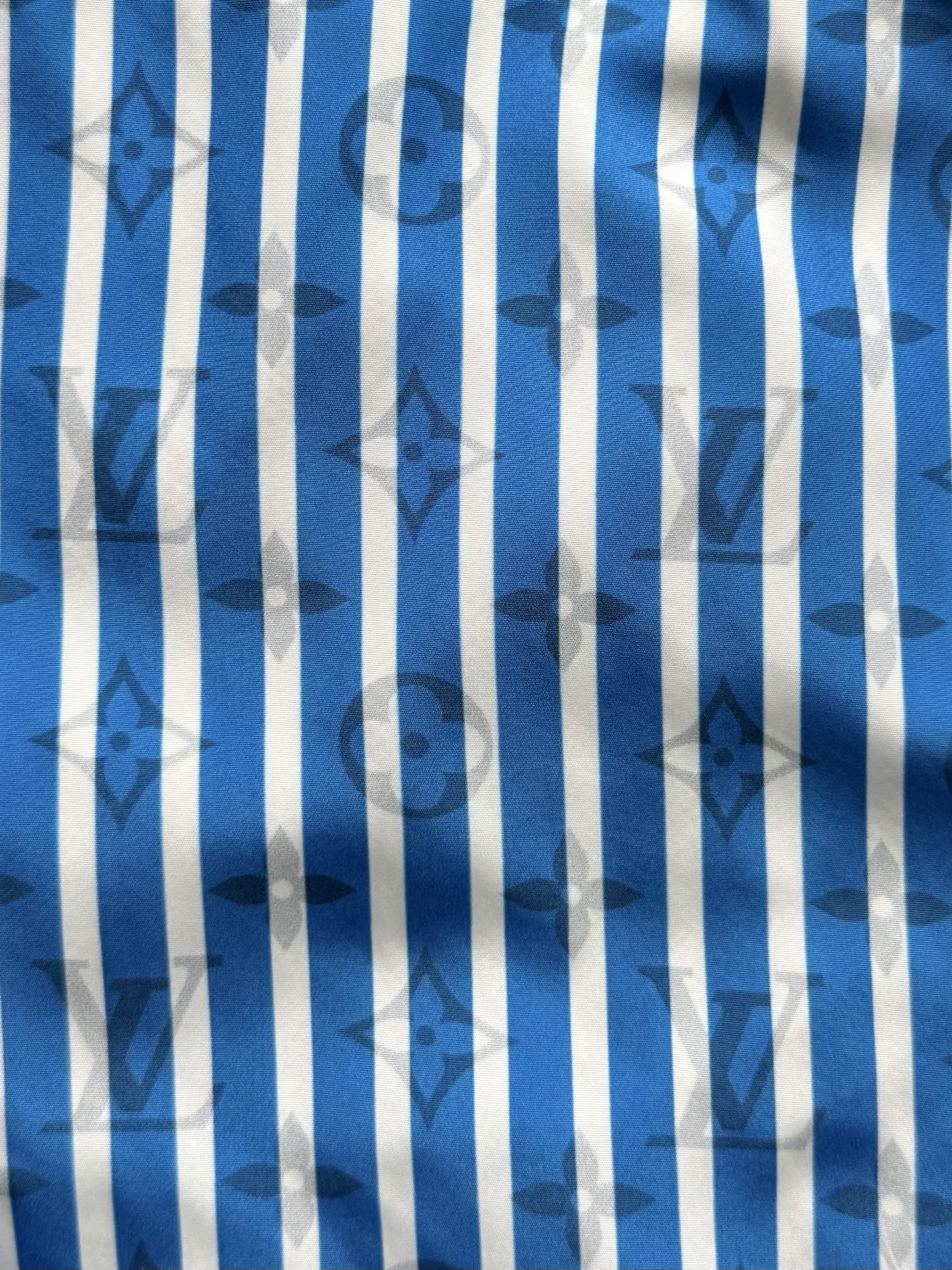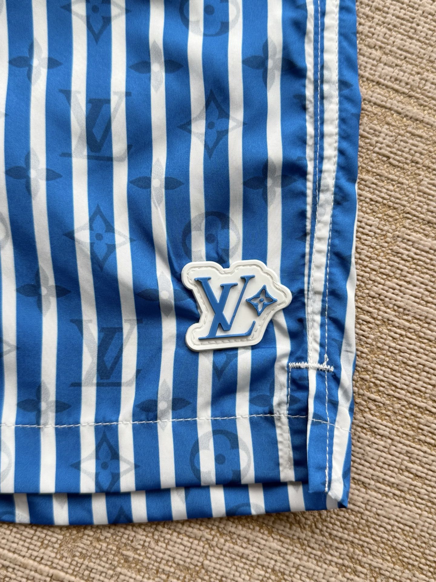 整条裤子6550购买ZP拆解打造,采用定制提花锦纶面料,做到100%进口锦纶纱线,全幅饰以蓝白竖条纹设计,面料呈现Monogram提花,做到与面料融为一体,腰部内里带棉质抽绳设计 五金都做到代字母logo,后幅拉链口袋设计,开模定制LV字母logo镂空拉链头,