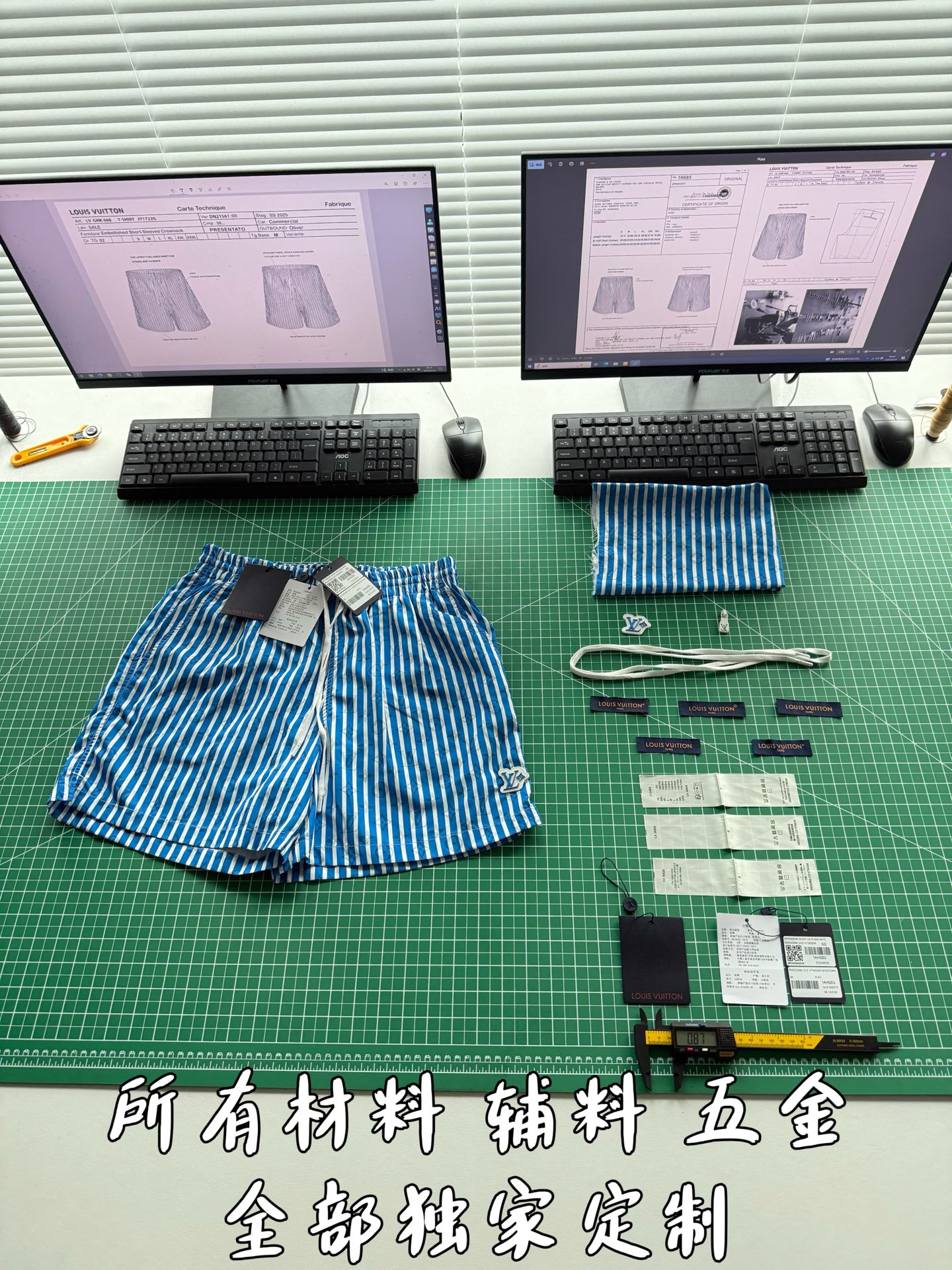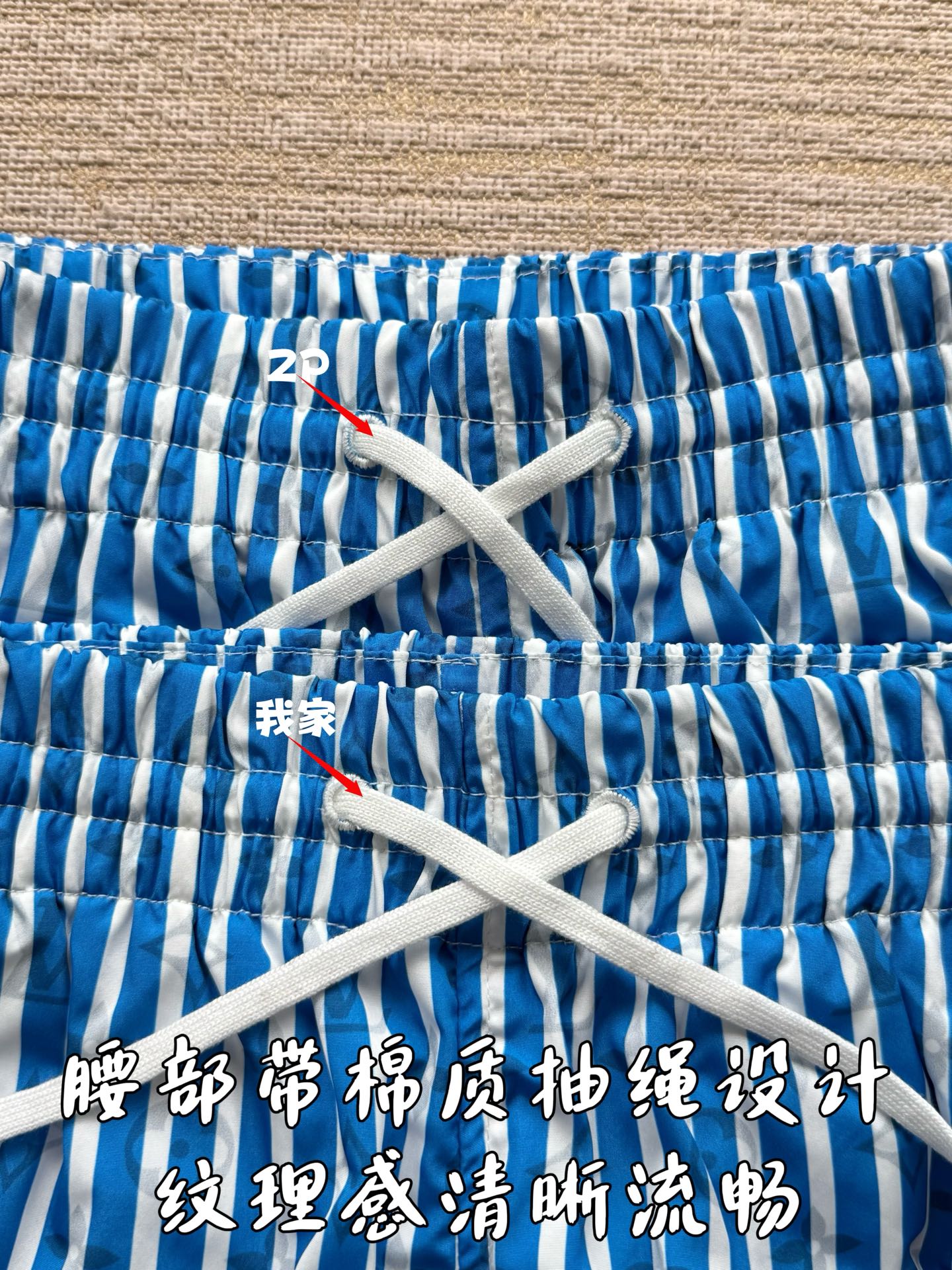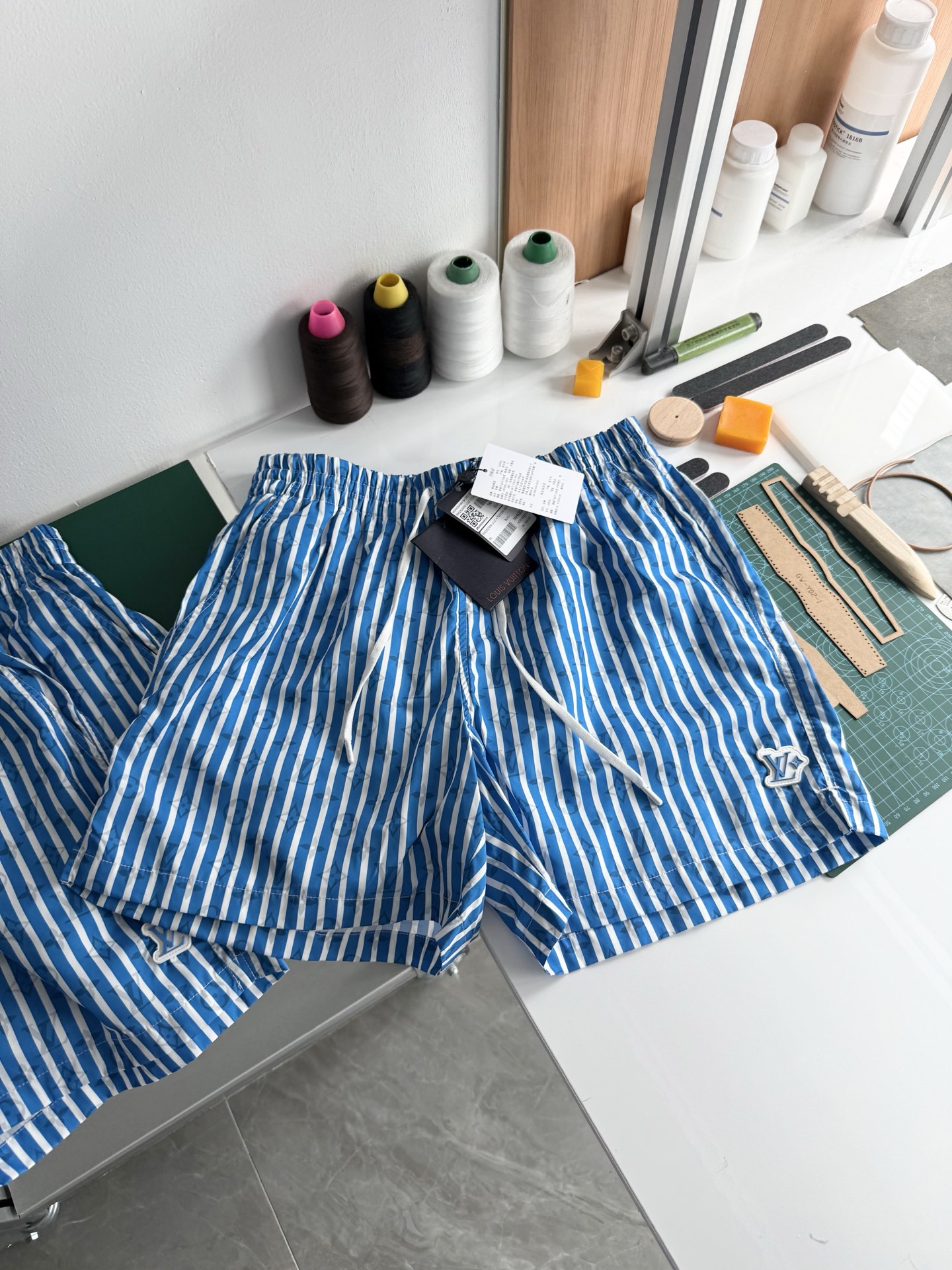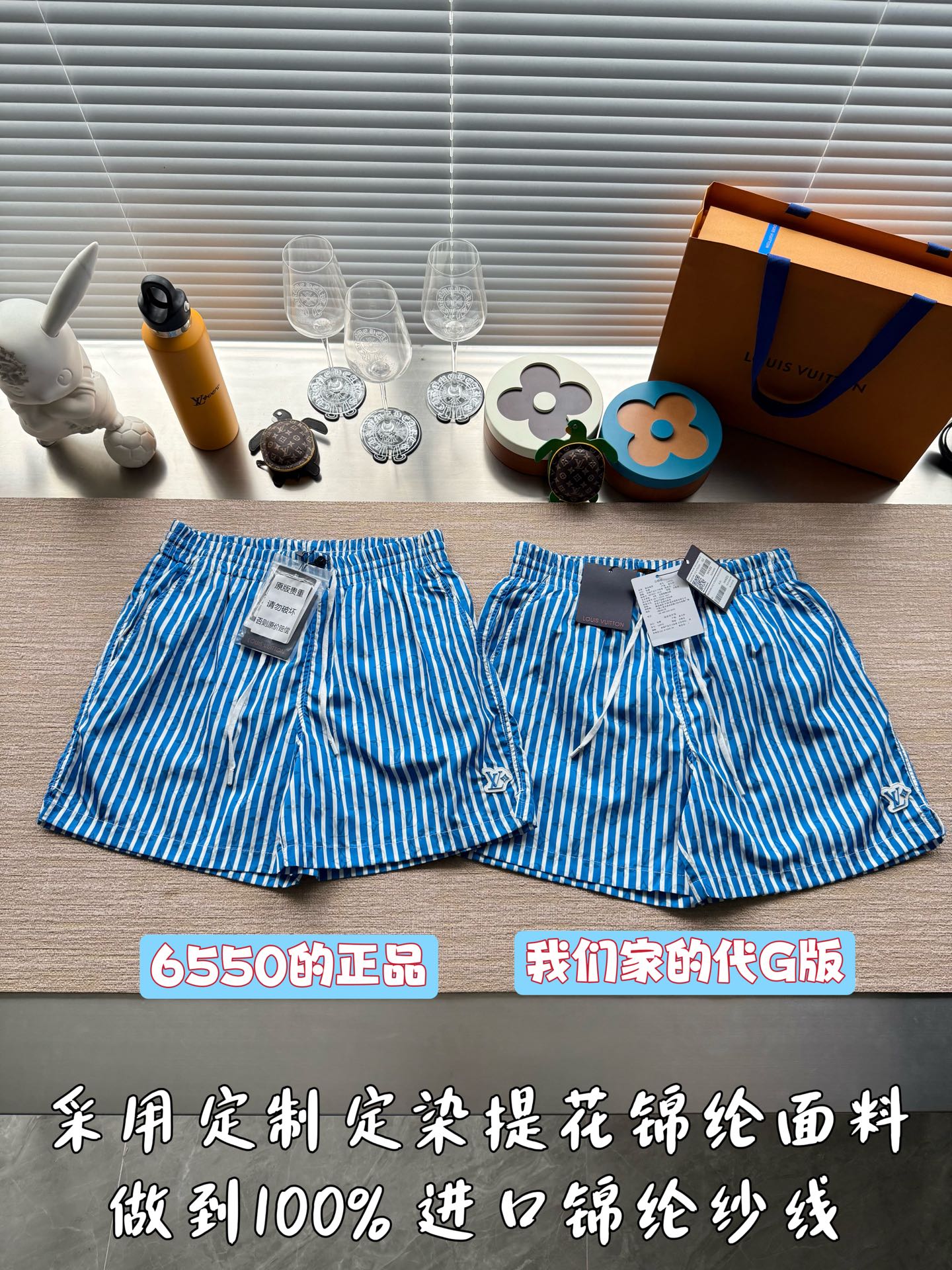 整条裤子6550购买ZP拆解打造,采用定制提花锦纶面料,做到100%进口锦纶纱线,全幅饰以蓝白竖条纹设计,面料呈现Monogram提花,做到与面料融为一体,腰部内里带棉质抽绳设计 五金都做到代字母logo,后幅拉链口袋设计,开模定制LV字母logo镂空拉链头,