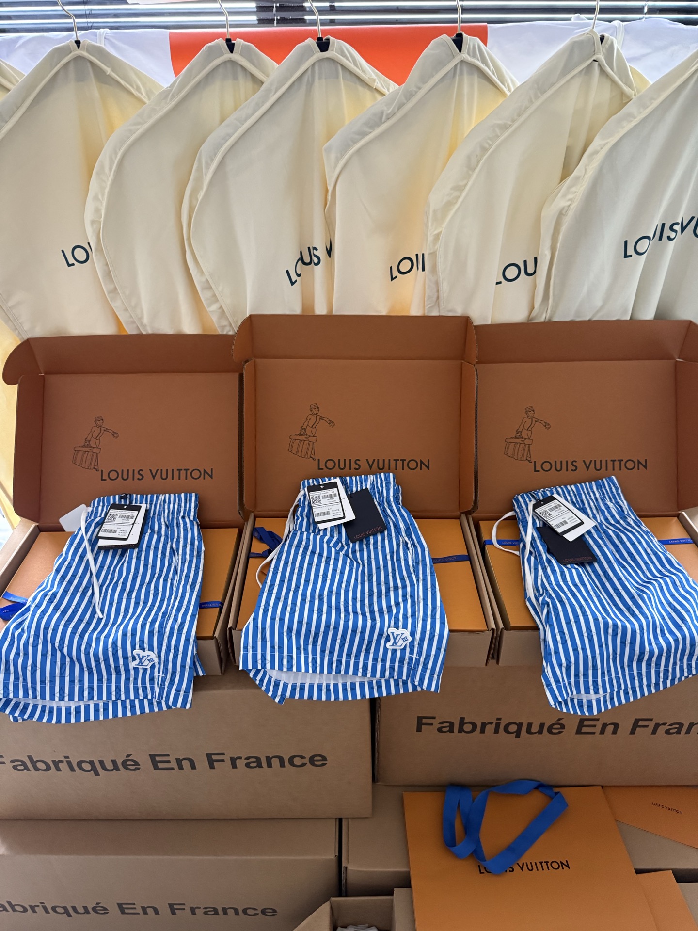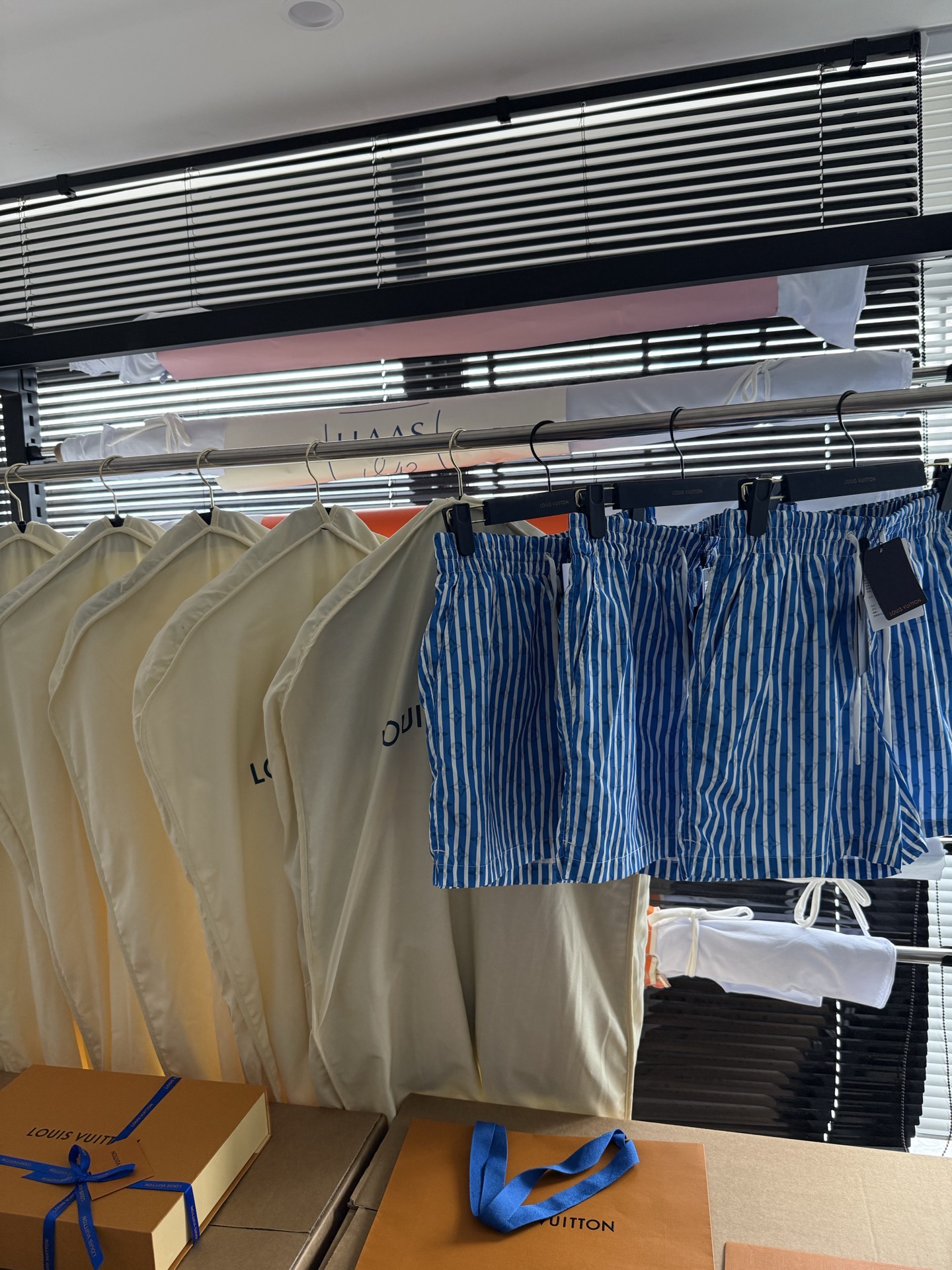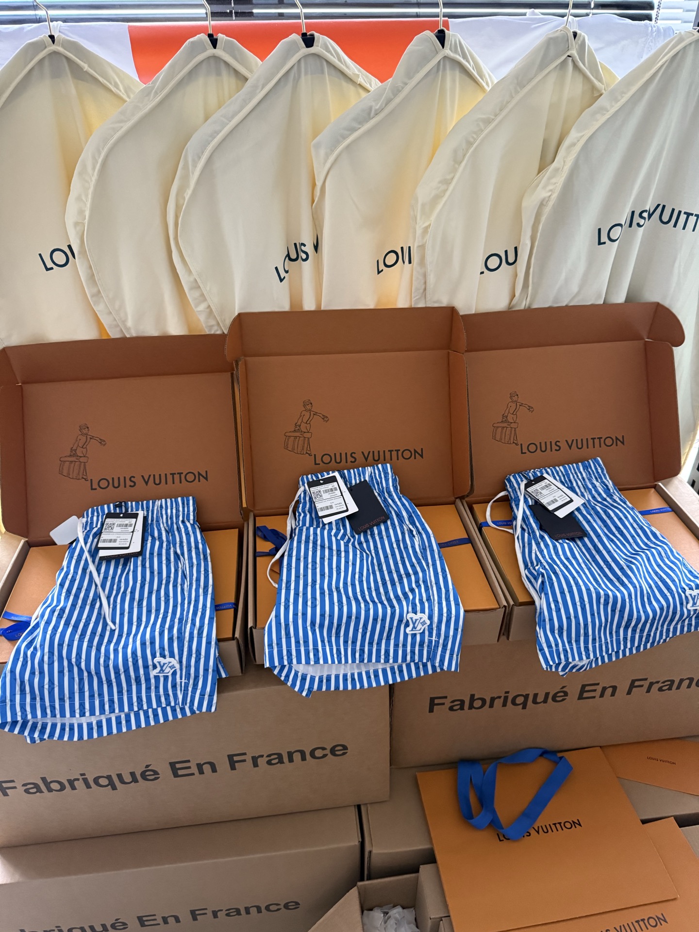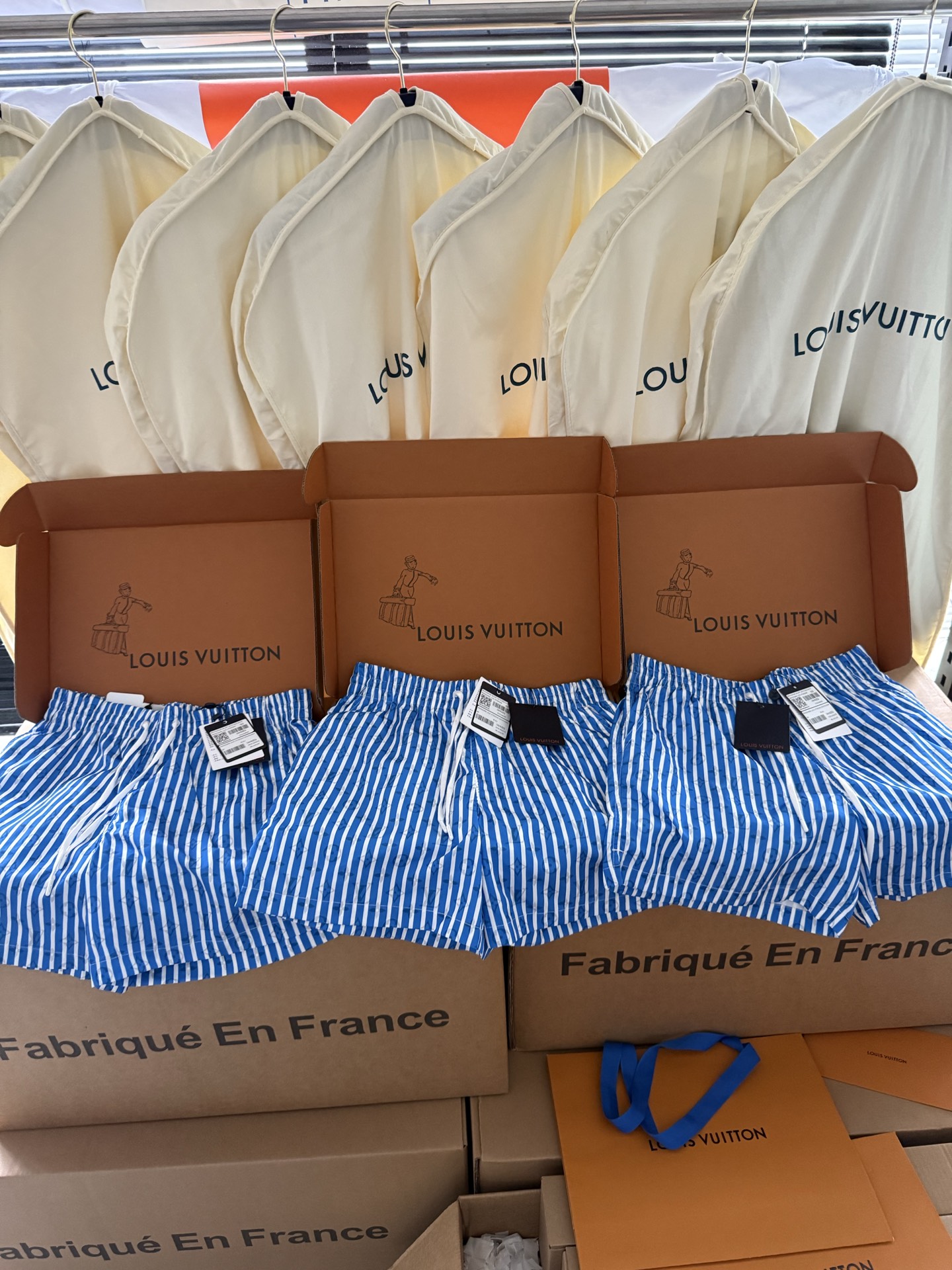 整条裤子6550购买ZP拆解打造,采用定制提花锦纶面料,做到100%进口锦纶纱线,全幅饰以蓝白竖条纹设计,面料呈现Monogram提花,做到与面料融为一体,腰部内里带棉质抽绳设计 五金都做到代字母logo,后幅拉链口袋设计,开模定制LV字母logo镂空拉链头,