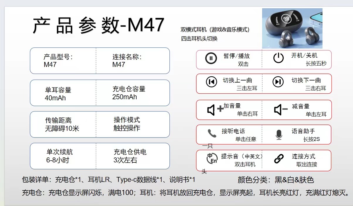 品名:耳夹耳机 颜色:白色、肤色、黑色 发货地:广东 发货时间:下单一般48小时内发货(周末、节假日除外) 发货快递:圆通快递(以实际发货为准,暂不支持指定快递) 运费模板:该商品全国部分地区包邮(新疆、西藏、内蒙,港澳台不发货,请知悉) 售后政策:本品包装配件完整不影响二次销售支持7天无理由退换货(无运费险),请知悉 质保:签收7天内有质量问题寄回换新,运费报销。签收一年内买家承担寄出运费换新,超出一年买家来回运费自理。 |