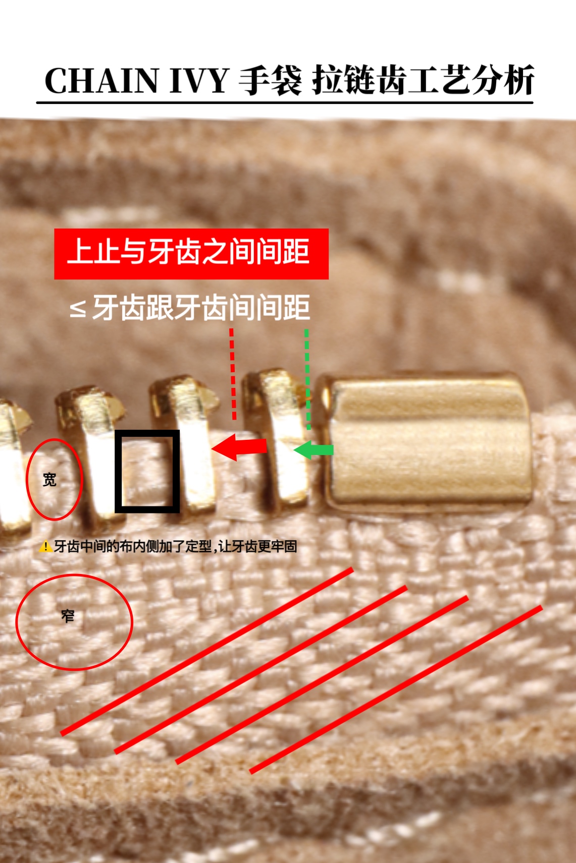 ⭕️拉链齿工艺分析 ▪️牙齿中间的布内侧加了定型,让牙齿更牢固 ▪️两齿之间宽布,延伸下面布料窄型 (上止与牙齿之间间距≤牙齿跟牙齿间间距)