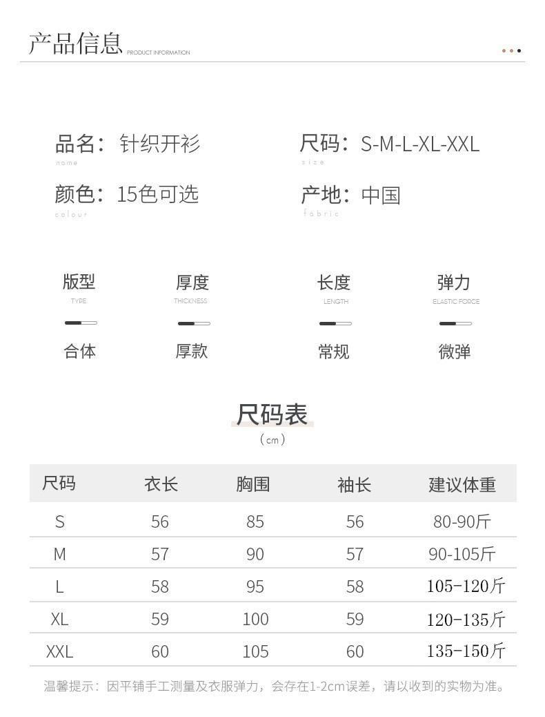 品名:MUYANHUAN圆领针织开衫 规格:黑色/深灰/黄驼/藏蓝/牛仔蓝/深驼/金驼/豆绿/奶白/桔红/米色/大红/姜黄/中灰/酒红 成分:粘胶纤维50.1% 锦纶21.1% 涤纶28.8% 产地及发货地:河北 发货时间:下单一般48小时内发货(周末、节假日除外) 发货快递:申通快递(暂不支持指定快递) 运费模板:该商品全国部分地区包邮(内蒙古、甘肃、宁夏、青海需补差运费10元/单,新疆、西藏、港澳台不发货,请知悉) 售后政策:本品包装配件完整、未拆封、不影响二次销售支持7天无理由退换货(无运费险),请知悉 温馨提醒:因显示器像素差异与拍摄灯光原因,图片与实物颜色可能存在些许差异,具体请以收到实物为准;因不同颜色不同机器制作,大小可能略有差异,因色差问题导致的退换货,不作为运费报销理由,介意勿拍! |
