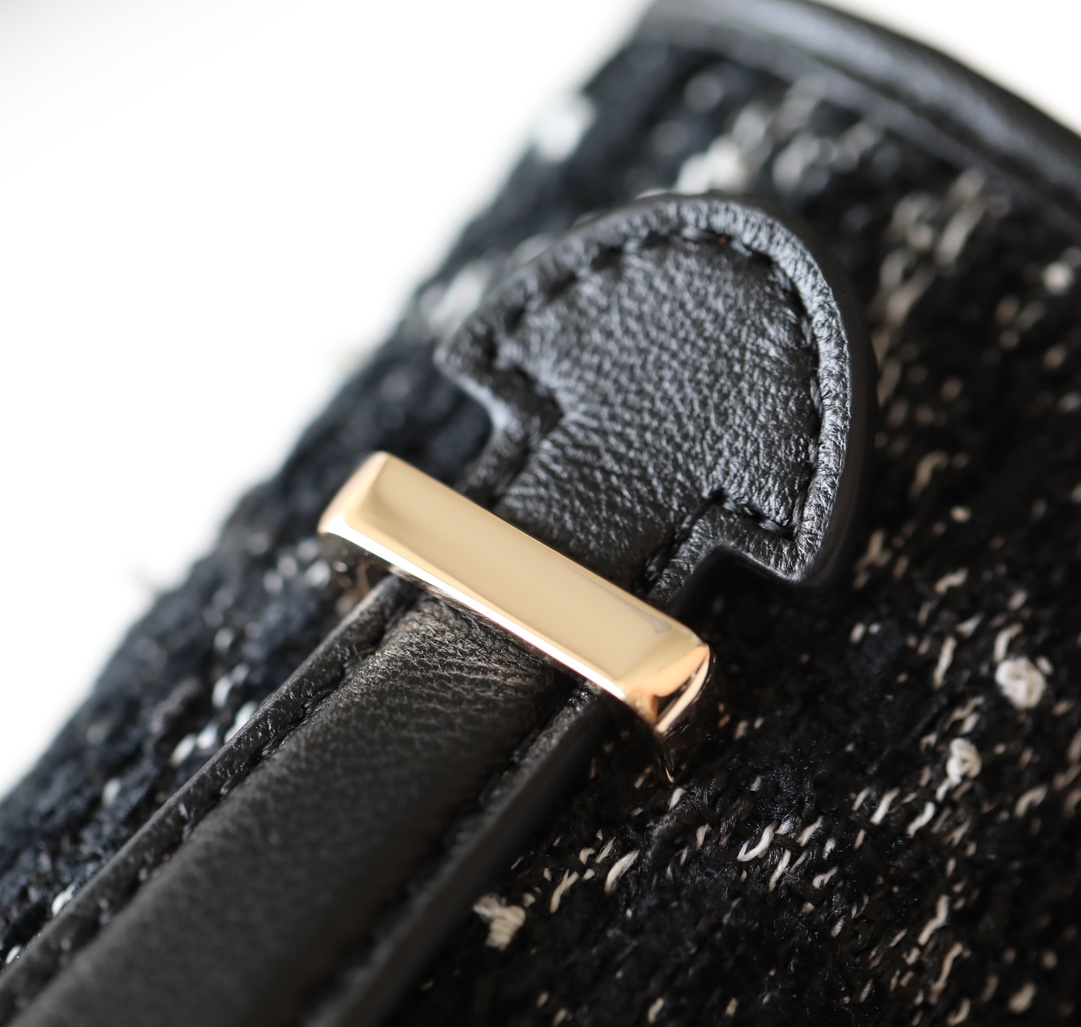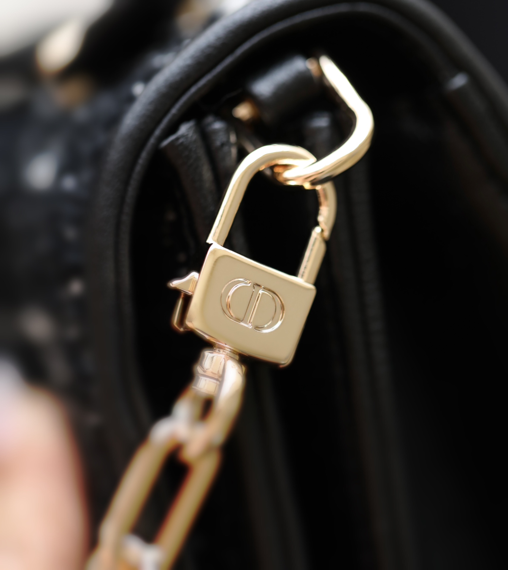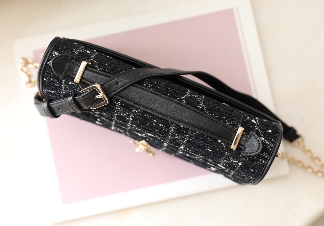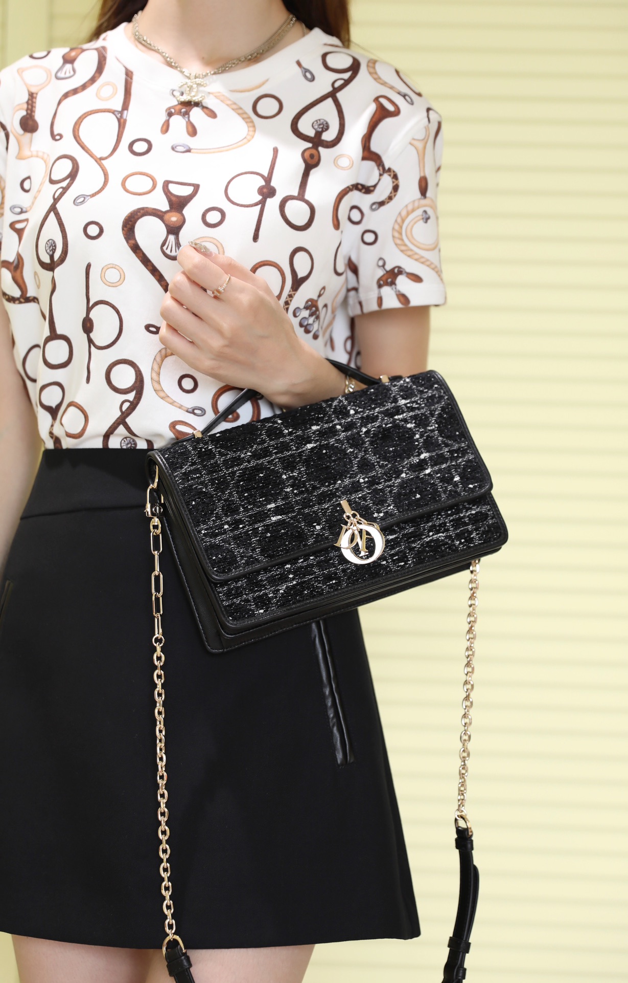 My Dior 手提包 手袋呈现黑色粗花呢效果,以各种线展示藤格纹图案,翻盖点缀以D.I.O.R.吊饰,两个隔层和一个拉链口袋可收纳各种日常用品,可与日常或晚装造型搭配使用。经典的顶部手柄设计,搭配带有皮革带的可拆卸链条肩带,可手提、肩背或斜挎。 尺寸: 24 x 14 x 7.5 cm