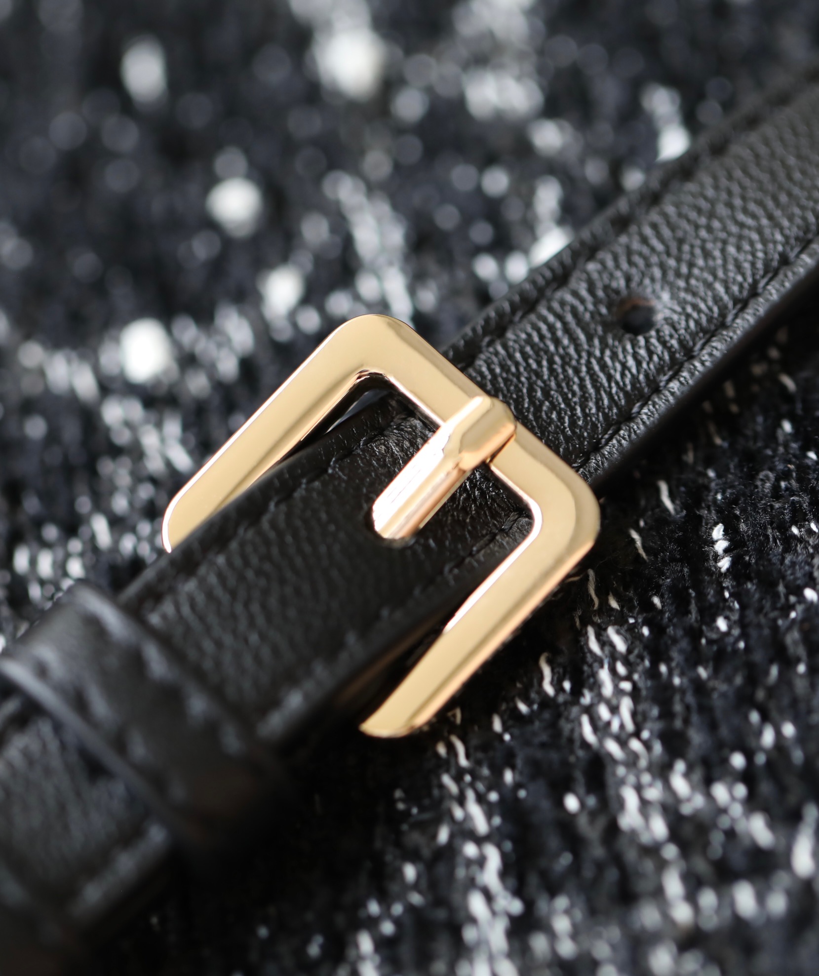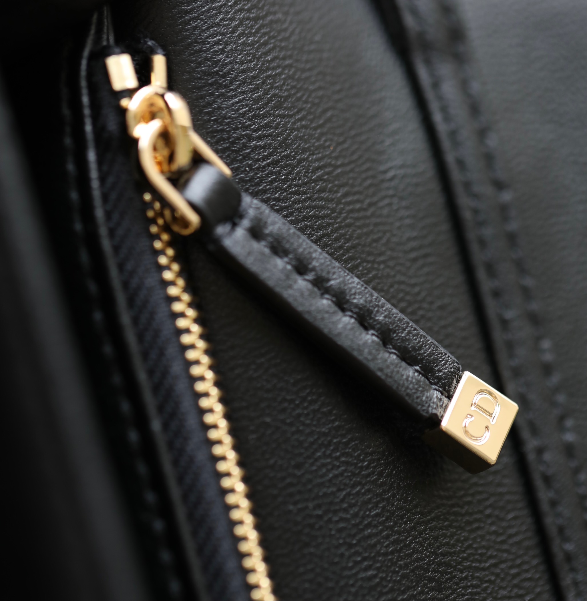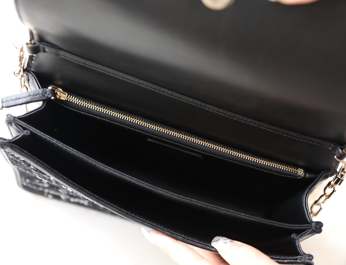 My Dior 手提包 手袋呈现黑色粗花呢效果,以各种线展示藤格纹图案,翻盖点缀以D.I.O.R.吊饰,两个隔层和一个拉链口袋可收纳各种日常用品,可与日常或晚装造型搭配使用。经典的顶部手柄设计,搭配带有皮革带的可拆卸链条肩带,可手提、肩背或斜挎。 尺寸: 24 x 14 x 7.5 cm