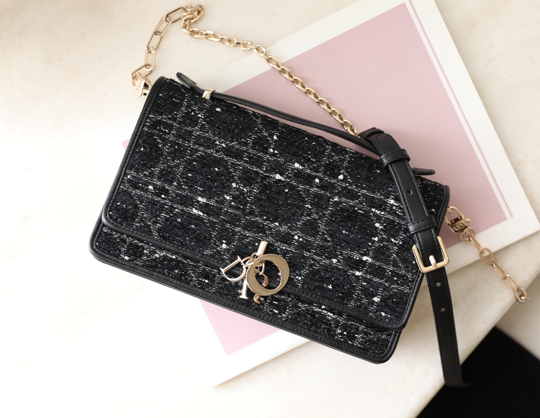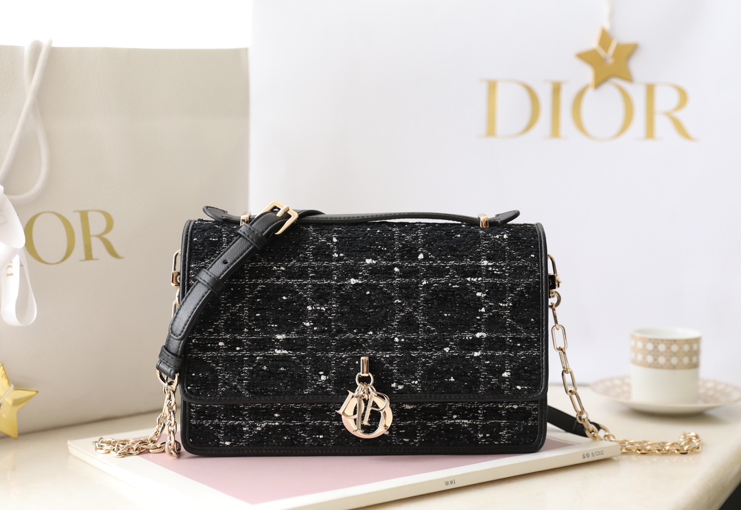 迪奥 Miss Dior字母吊坠可拆卸可调节肩带藤格 纹粗花呢 单肩斜挎手提包 女款黑色 (ZB*MDL)