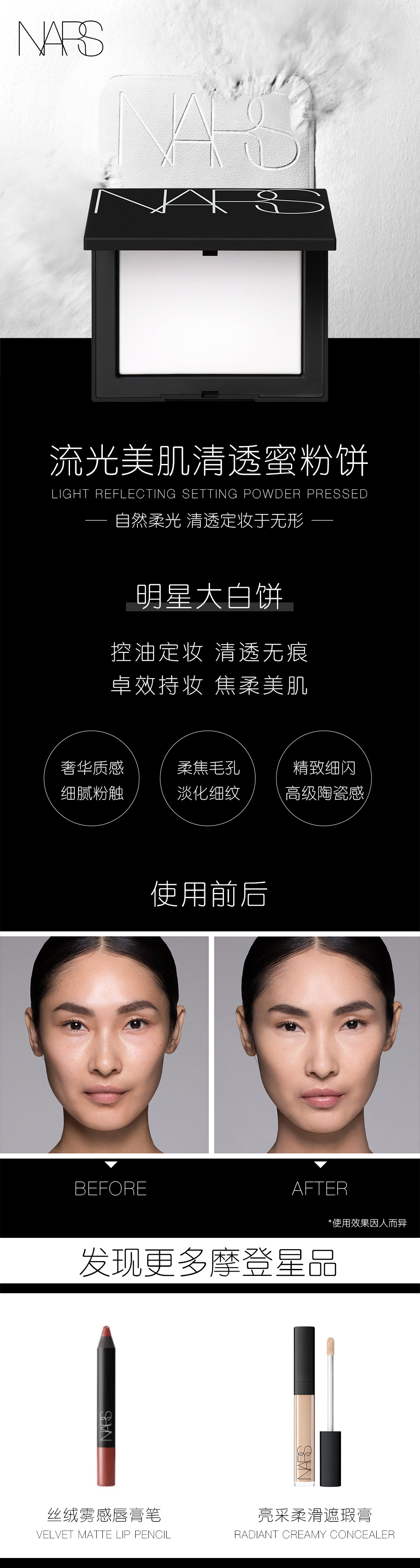 流光美肌轻透蜜粉饼牢牢锁定妆容,轻盈触感,透明色泽,让肌肤更显细腻,呈现裸妆效果。 奢华配方可均匀上色,轻松贴合肌肤,提升底妆效果,不留印痕。配方采用"光反应技术",可应对不同光源,让肌肤在镜头前和现实中都光彩照人。 NARS独特的聚光复合物™让肌肤与光线反射相得益彰。通过淡化皱纹和毛孔,打造柔焦效果。帮助长时间清理面部油光,适合定妆及补妆使用。 流光美肌轻透蜜粉饼不仅可以为粉底定妆,还可用于固定鲜艳唇色,或是叠加涂抹于烟熏眼影之上,同时还可用于柔化浓艳眼妆或腮红。