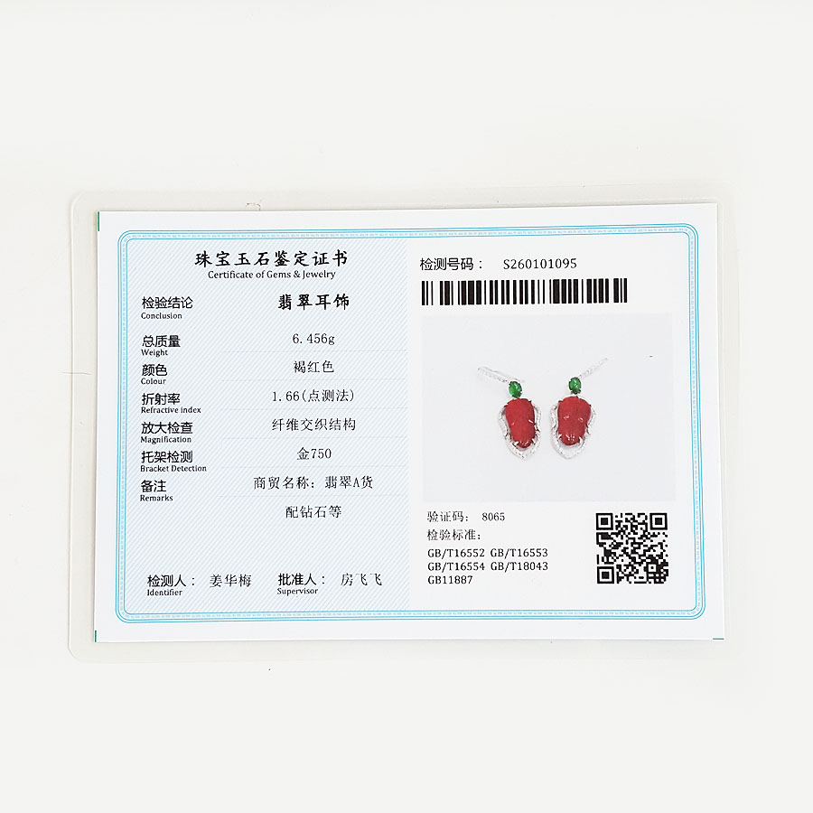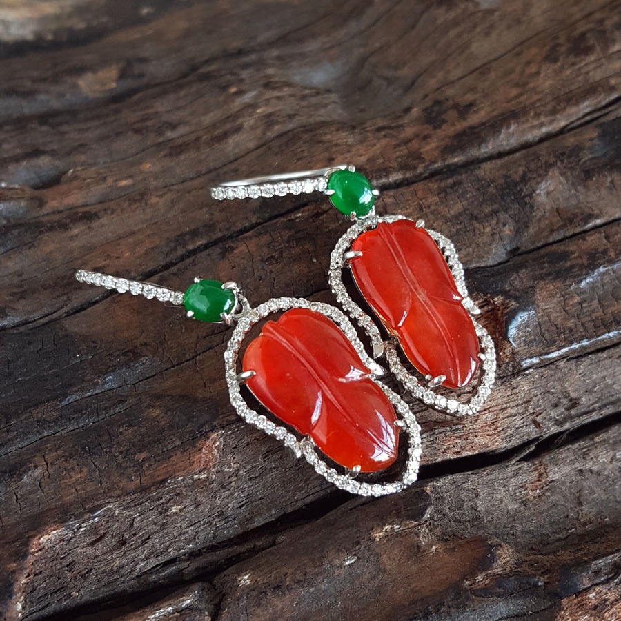 【天然正品】A货翡翠AU750白金豪镶钻镶天然细腻冰种叶子(金枝玉叶)红翡耳坠35.9*12.7*4.6MM(皆取最大值)141125AH23