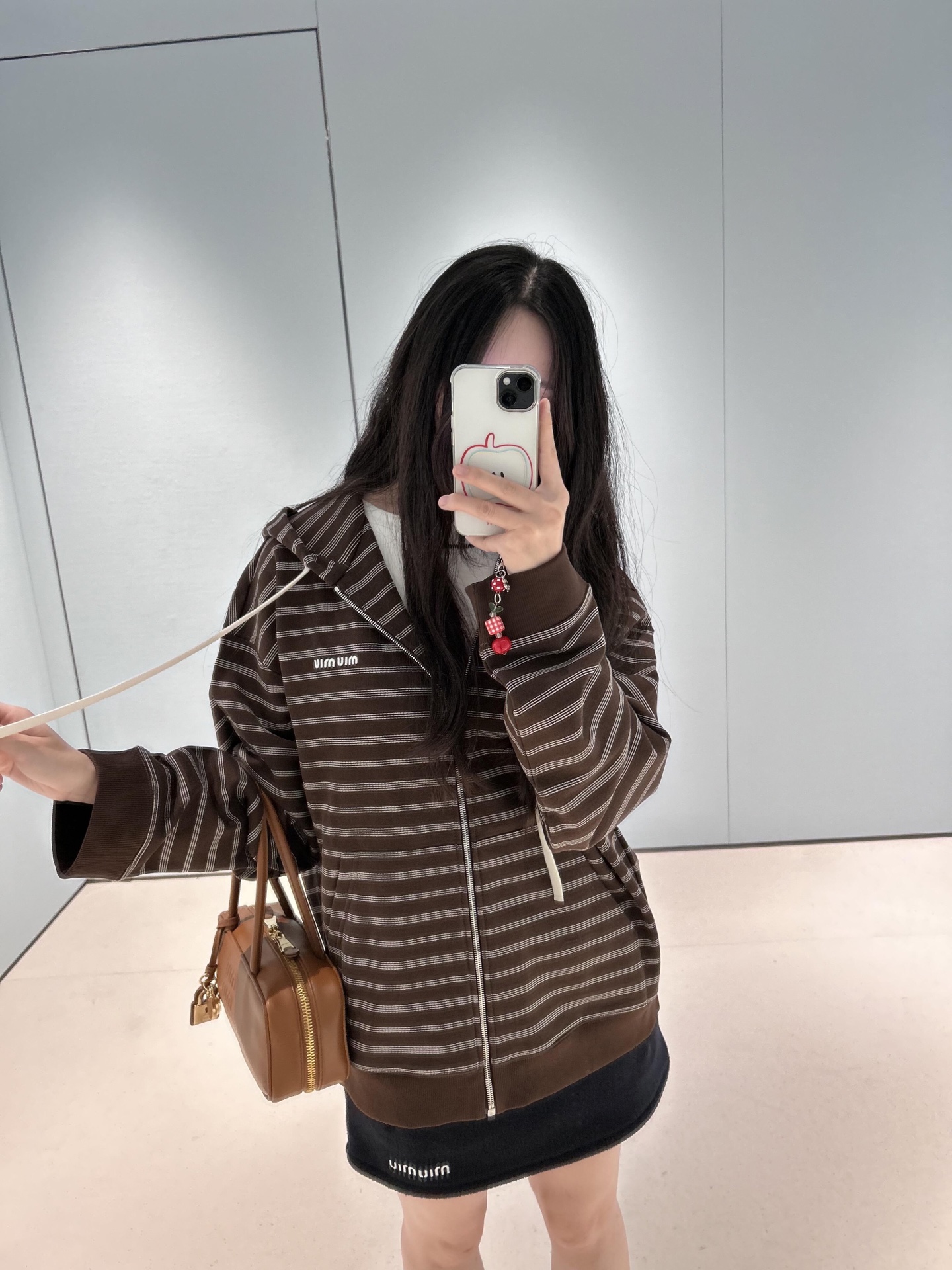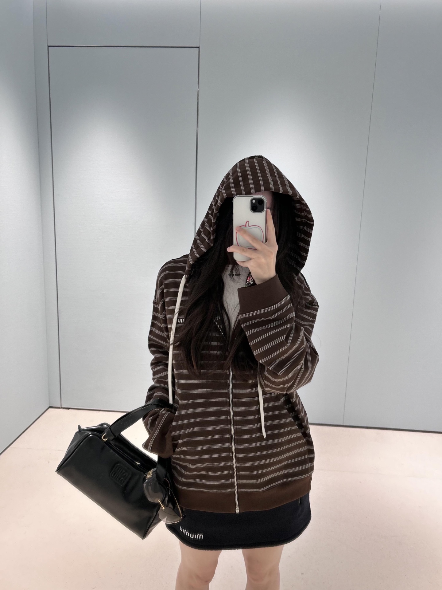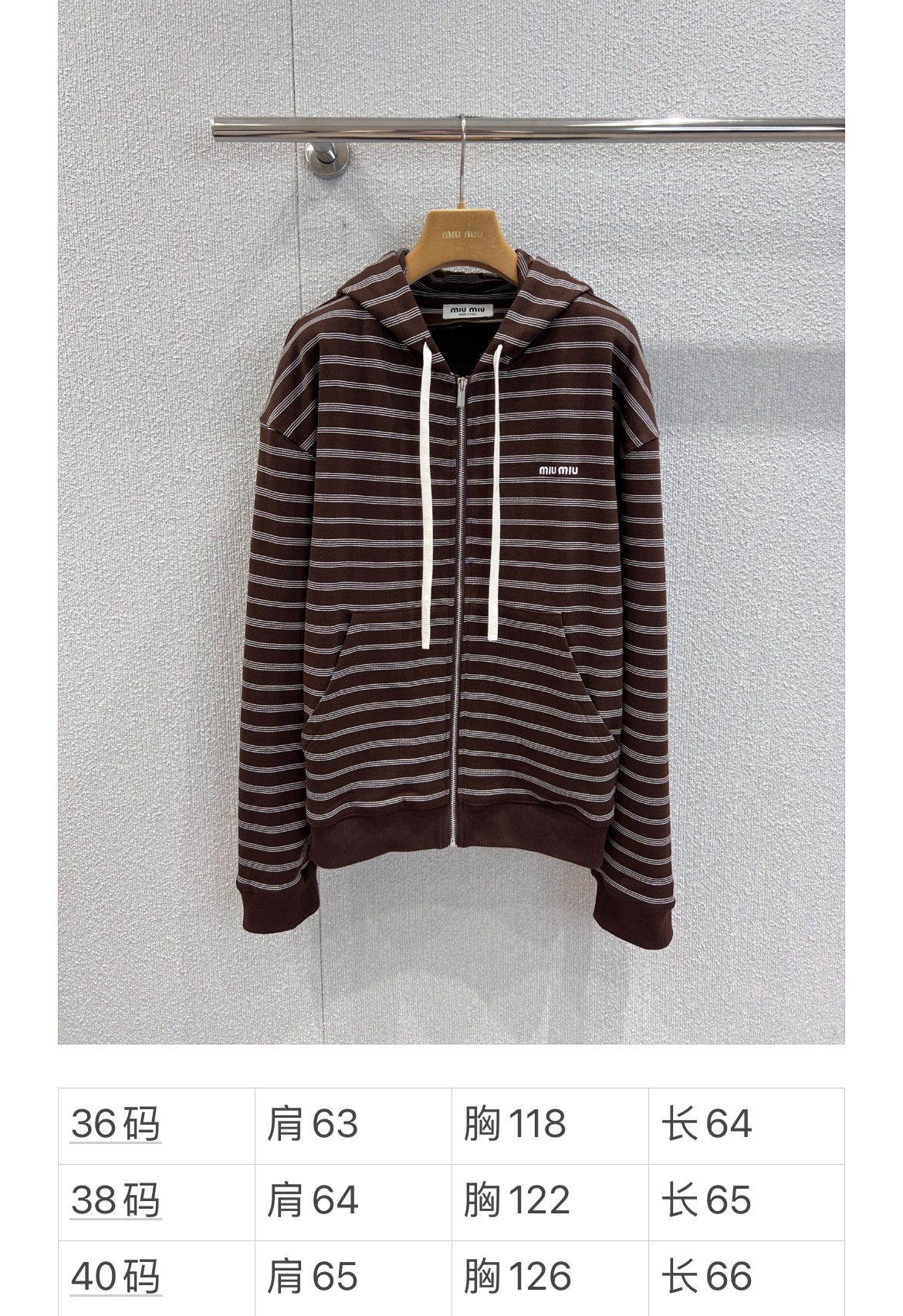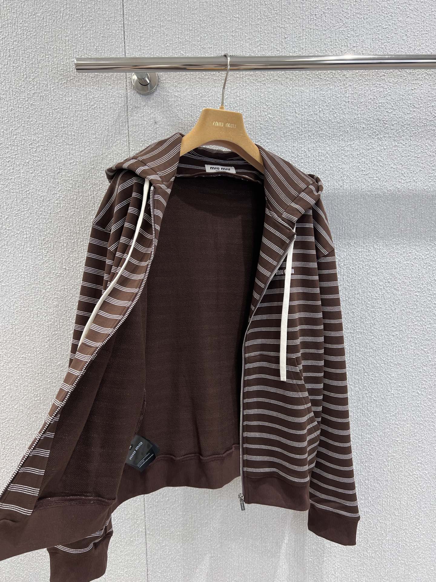 缪缪 25fw早秋新款 咖色条纹棉质拉链连帽卫衣外套(DQJ*MM)