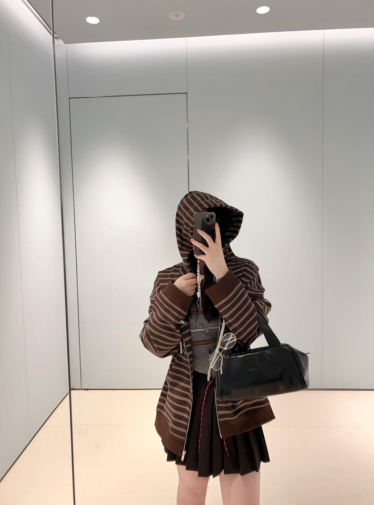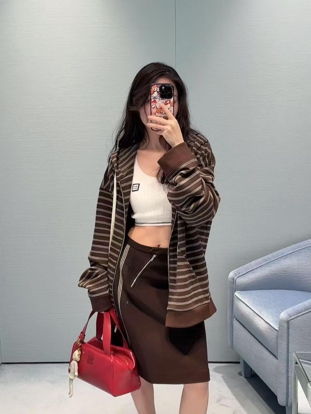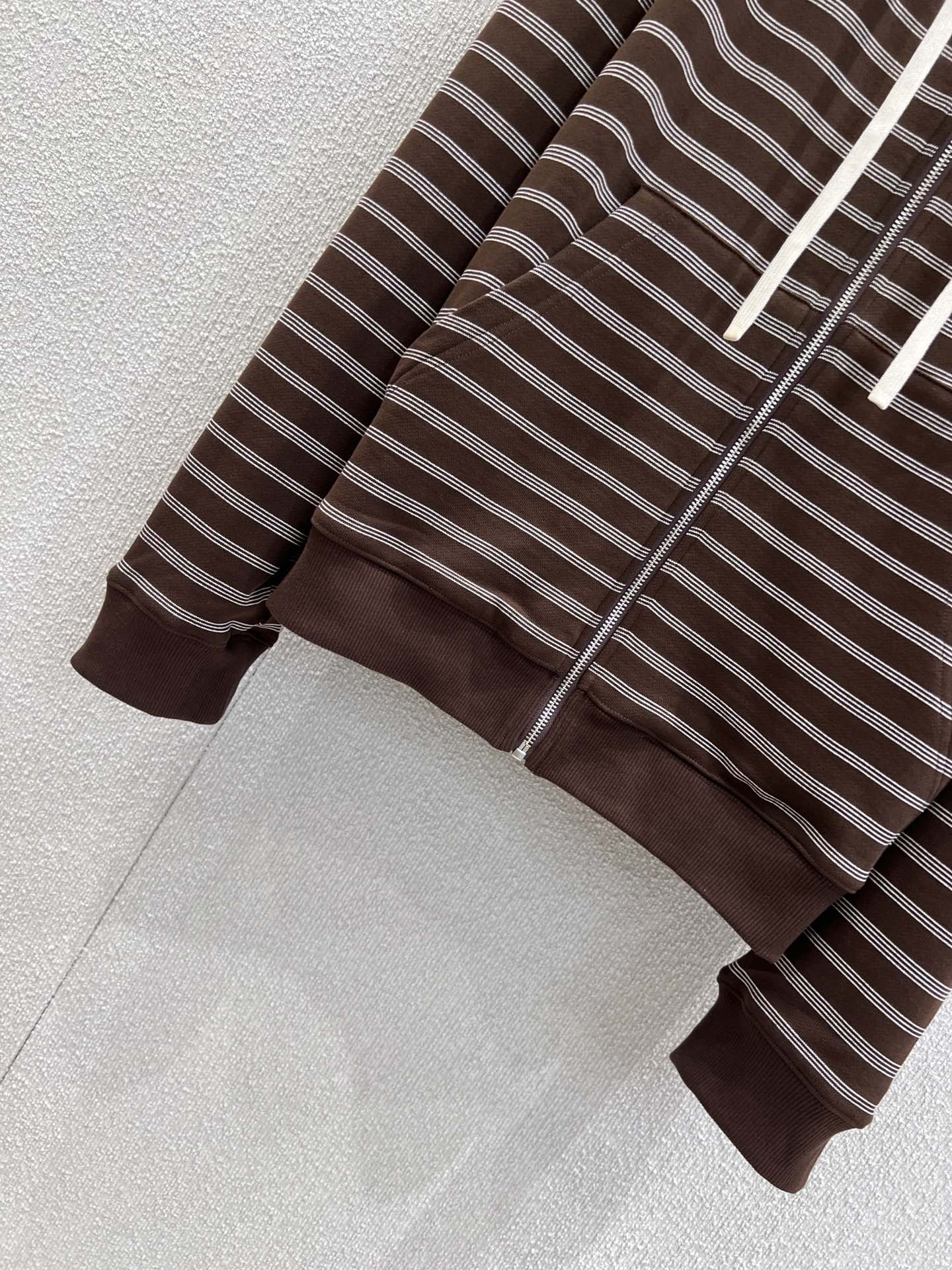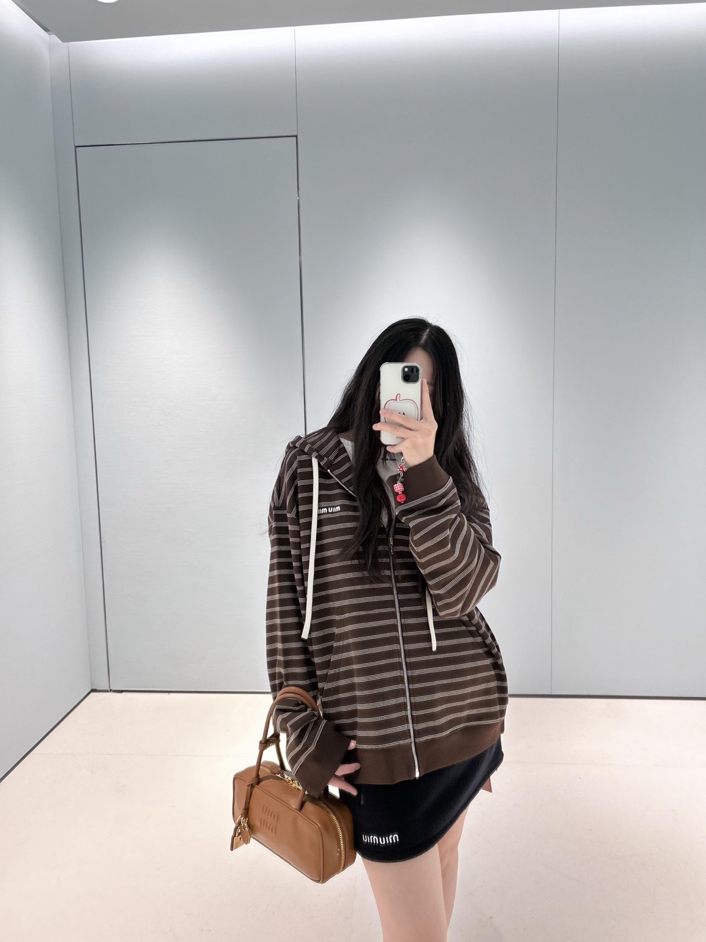 缪缪 25fw早秋新款 咖色条纹棉质拉链连帽卫衣外套(DQJ*MM)